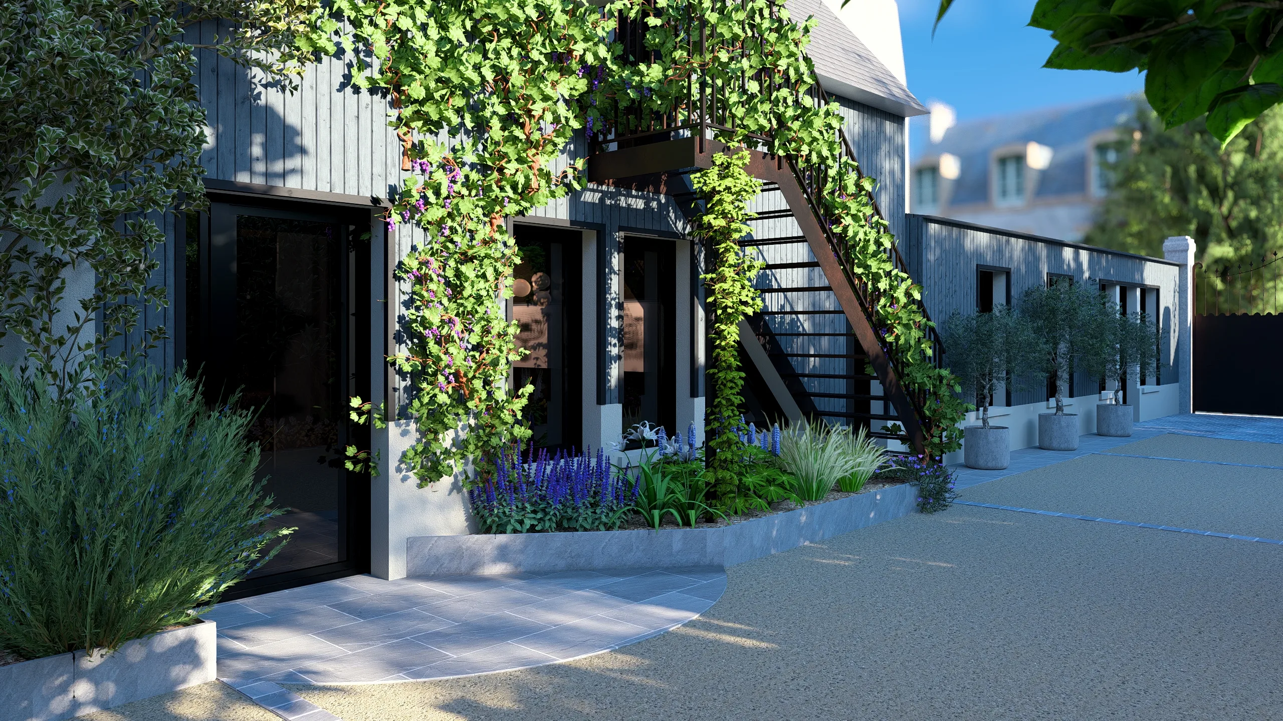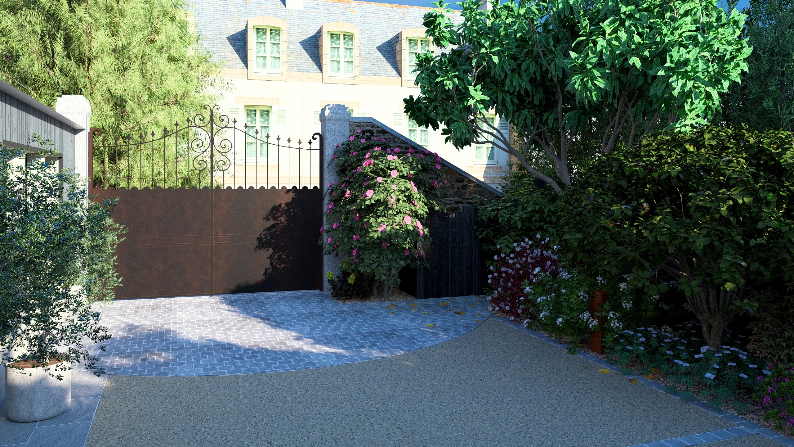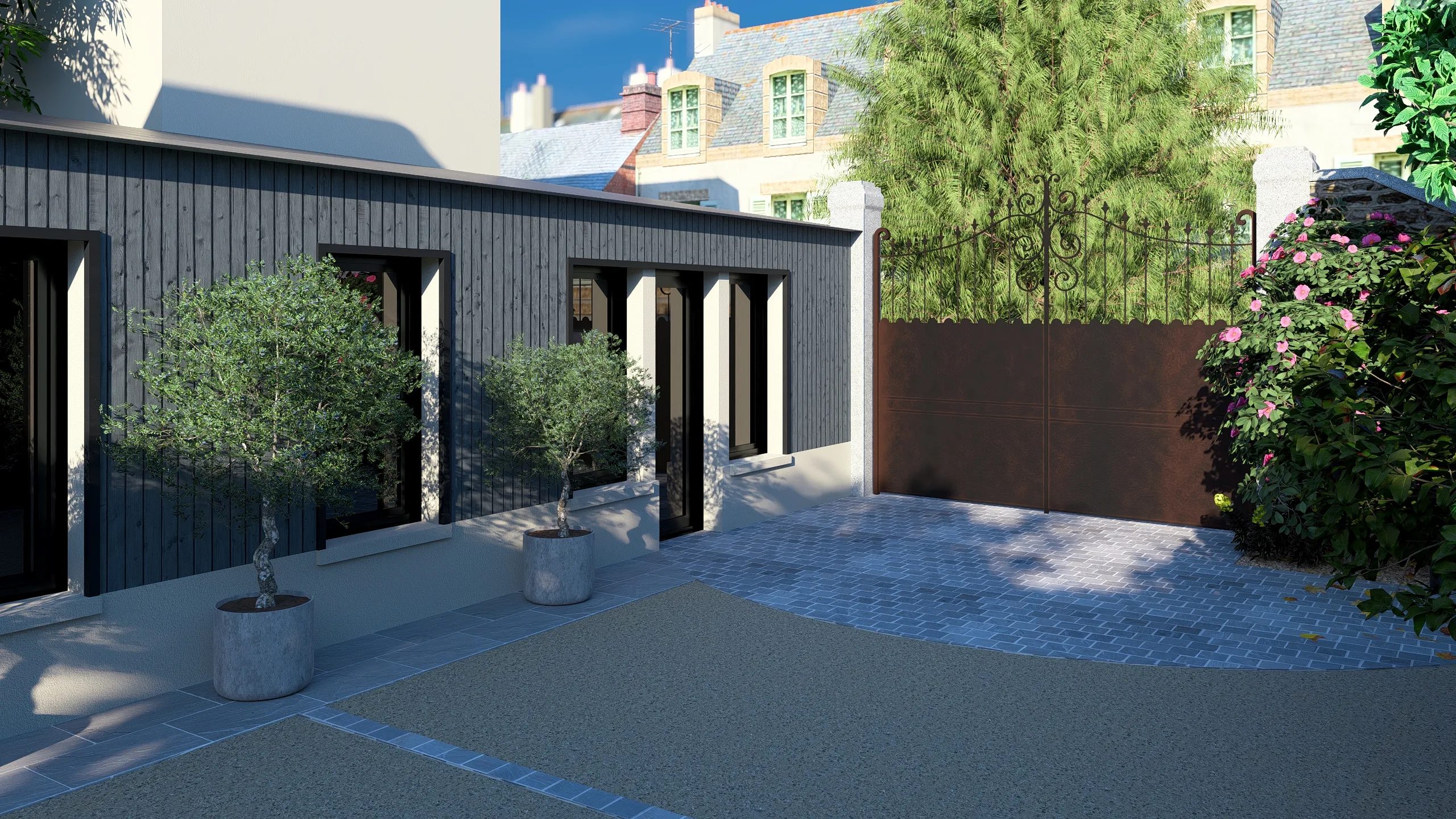 Au cœur de Fougères, ce projet prend place dans une propriété de caractère, dissimulée derrière un grand portail en fer forgé.