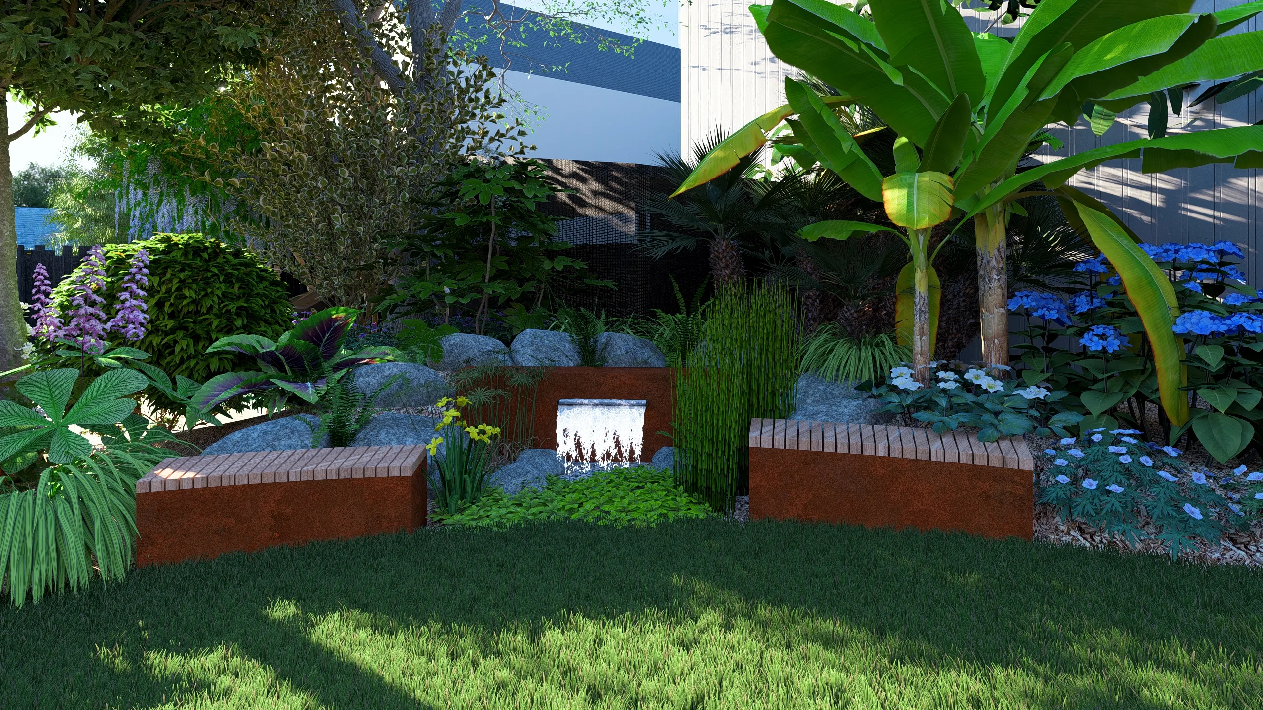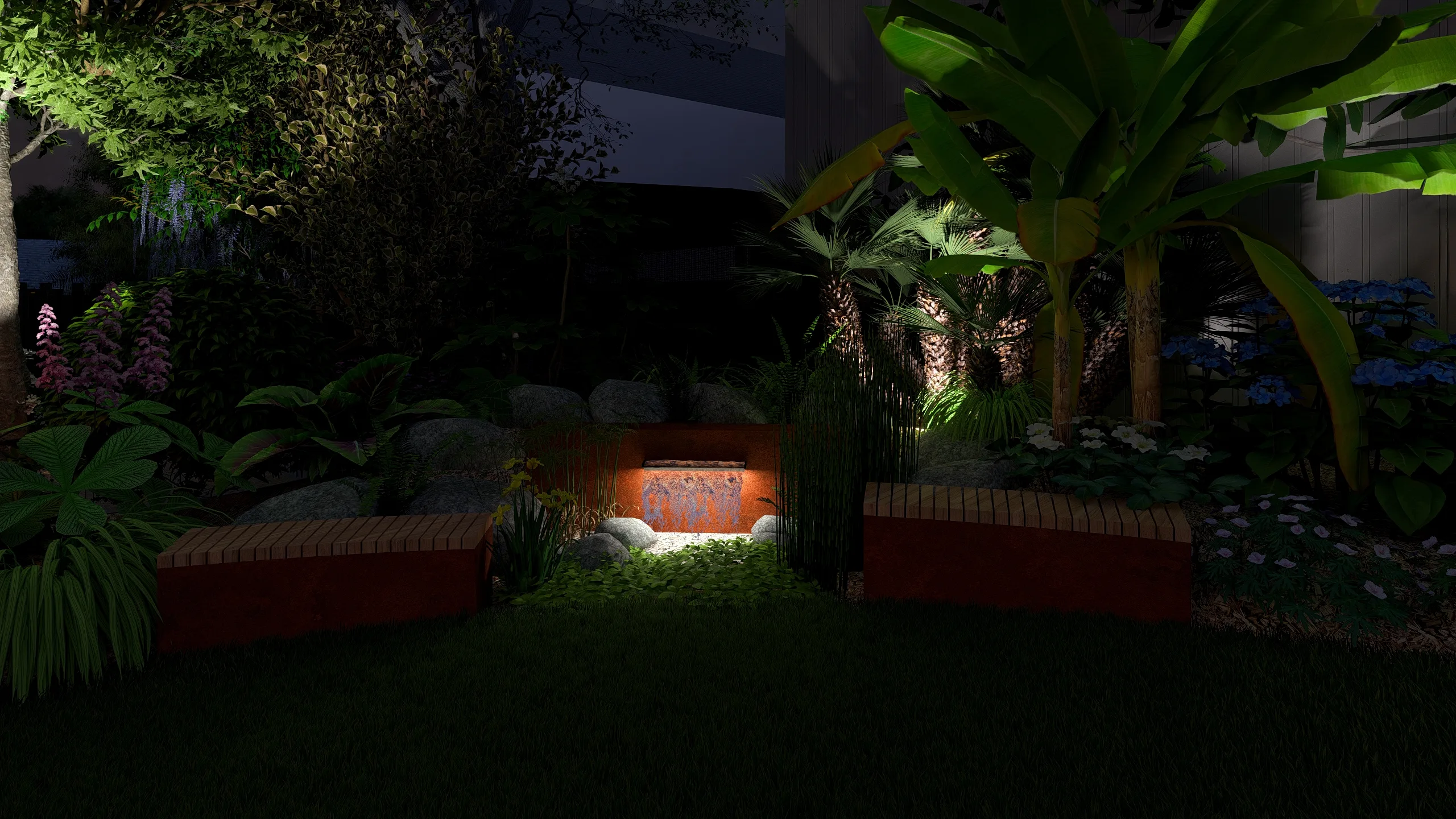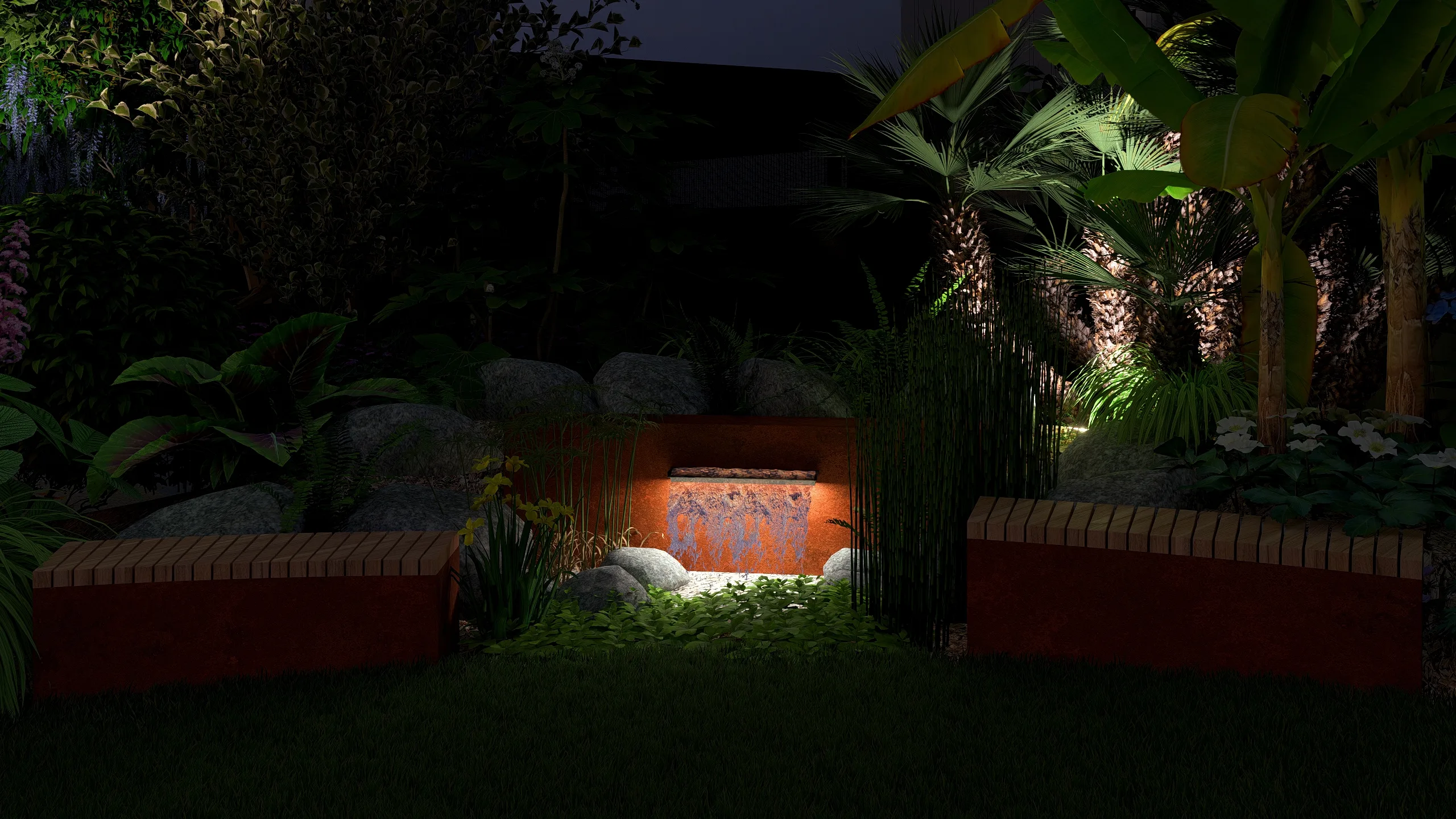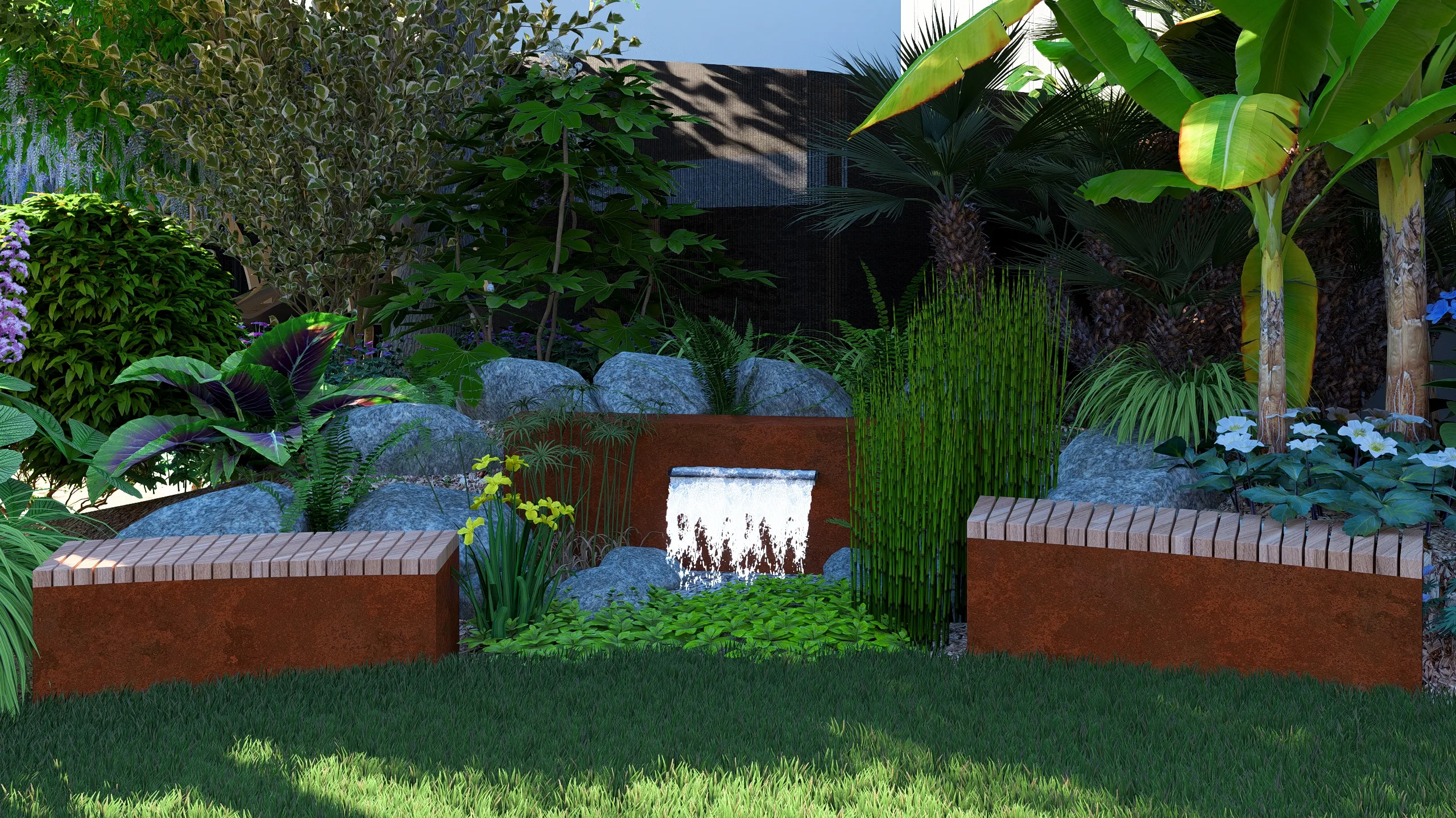 À l’emplacement d’un ancien bassin, une lame d’eau s’échappe désormais d’un mur en acier corten, apportant un mouvement discret et un rafraîchissement perceptible, aussi bien visuel que sonore. Autour, les matériaux, bois brûlé, acier, pierre, dialoguent avec le végétal dans une écriture à la fois sobre et affirmée.