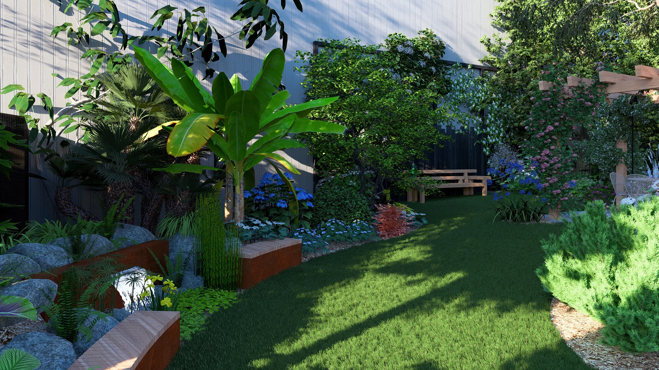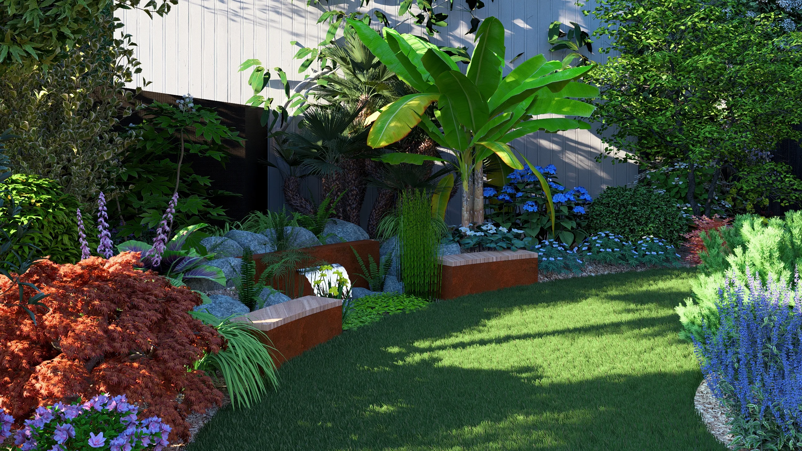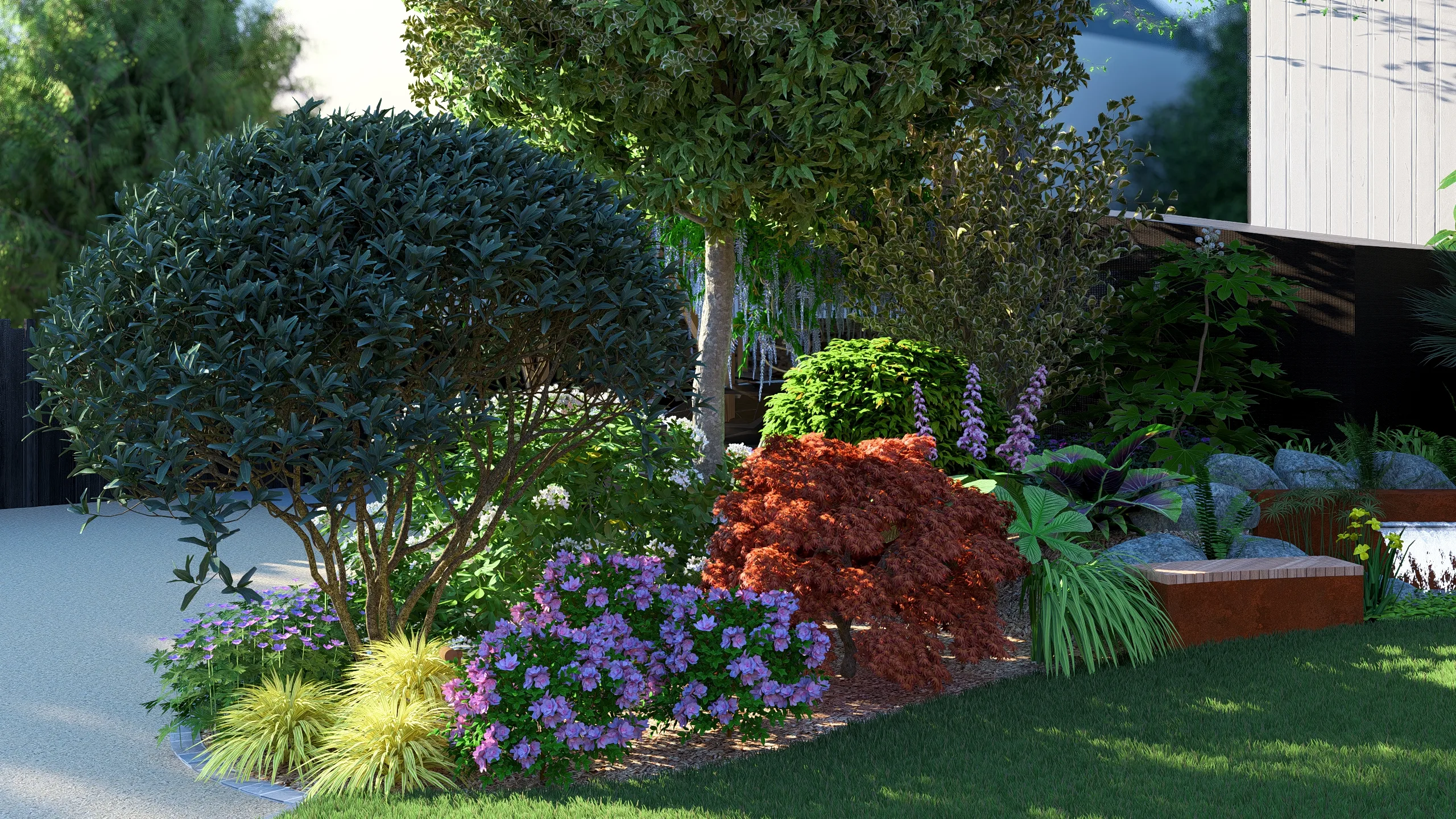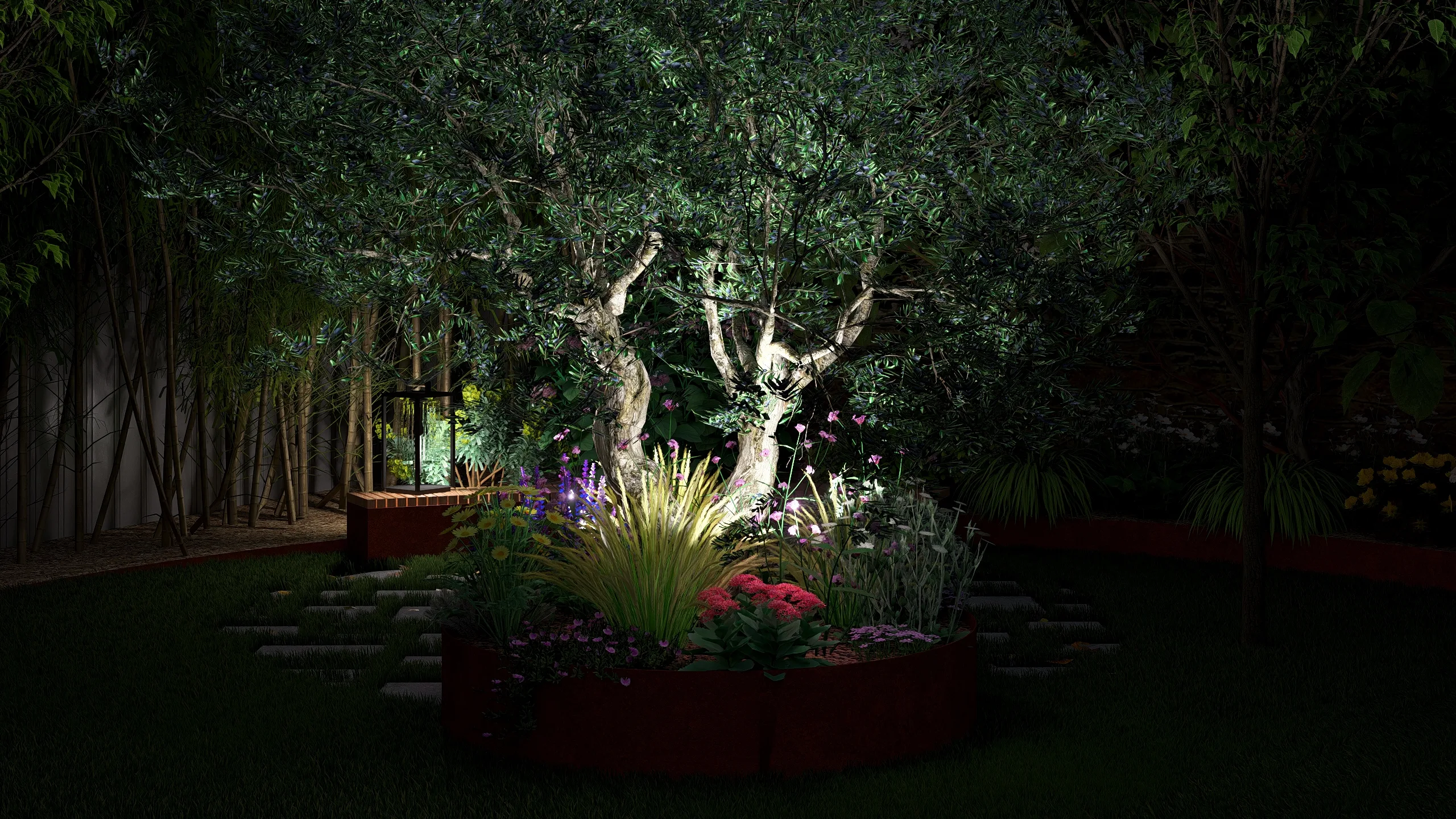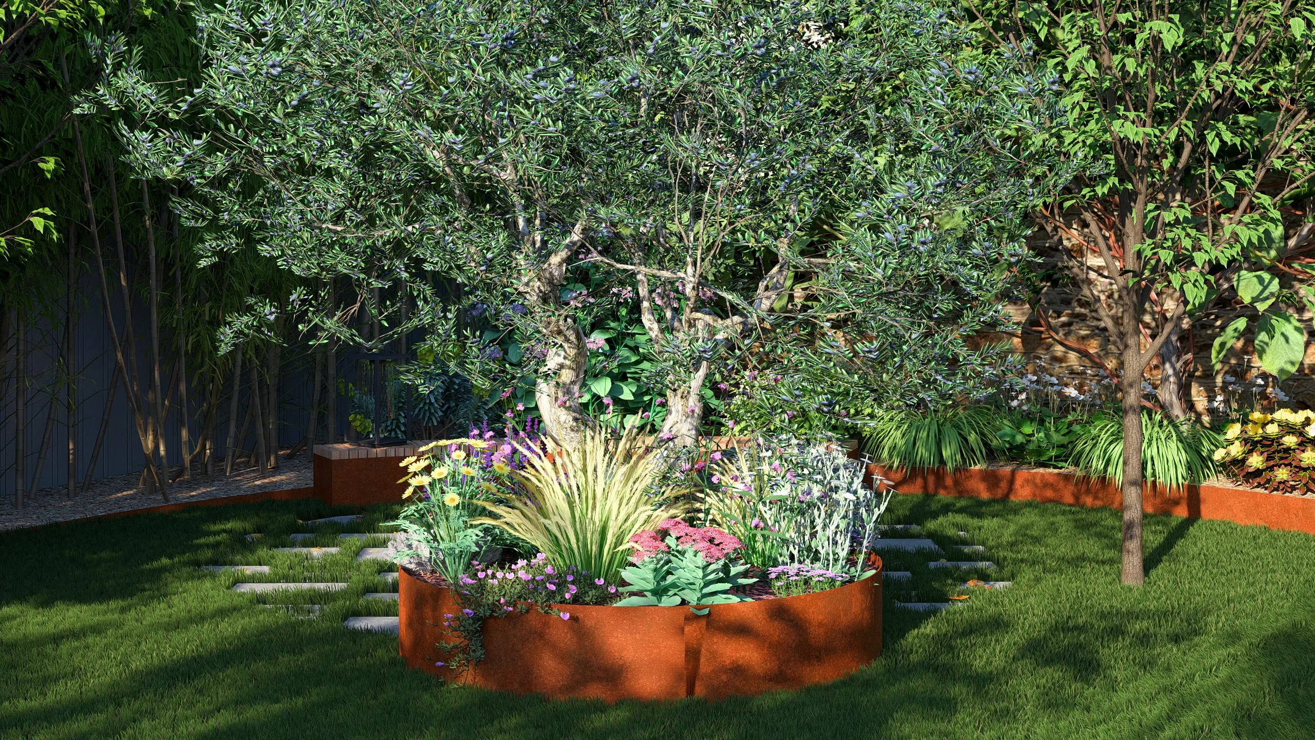 À l’emplacement d’un ancien bassin, une lame d’eau s’échappe désormais d’un mur en acier corten, apportant un mouvement discret et un rafraîchissement perceptible, aussi bien visuel que sonore. Autour, les matériaux, bois brûlé, acier, pierre, dialoguent avec le végétal dans une écriture à la fois sobre et affirmée.