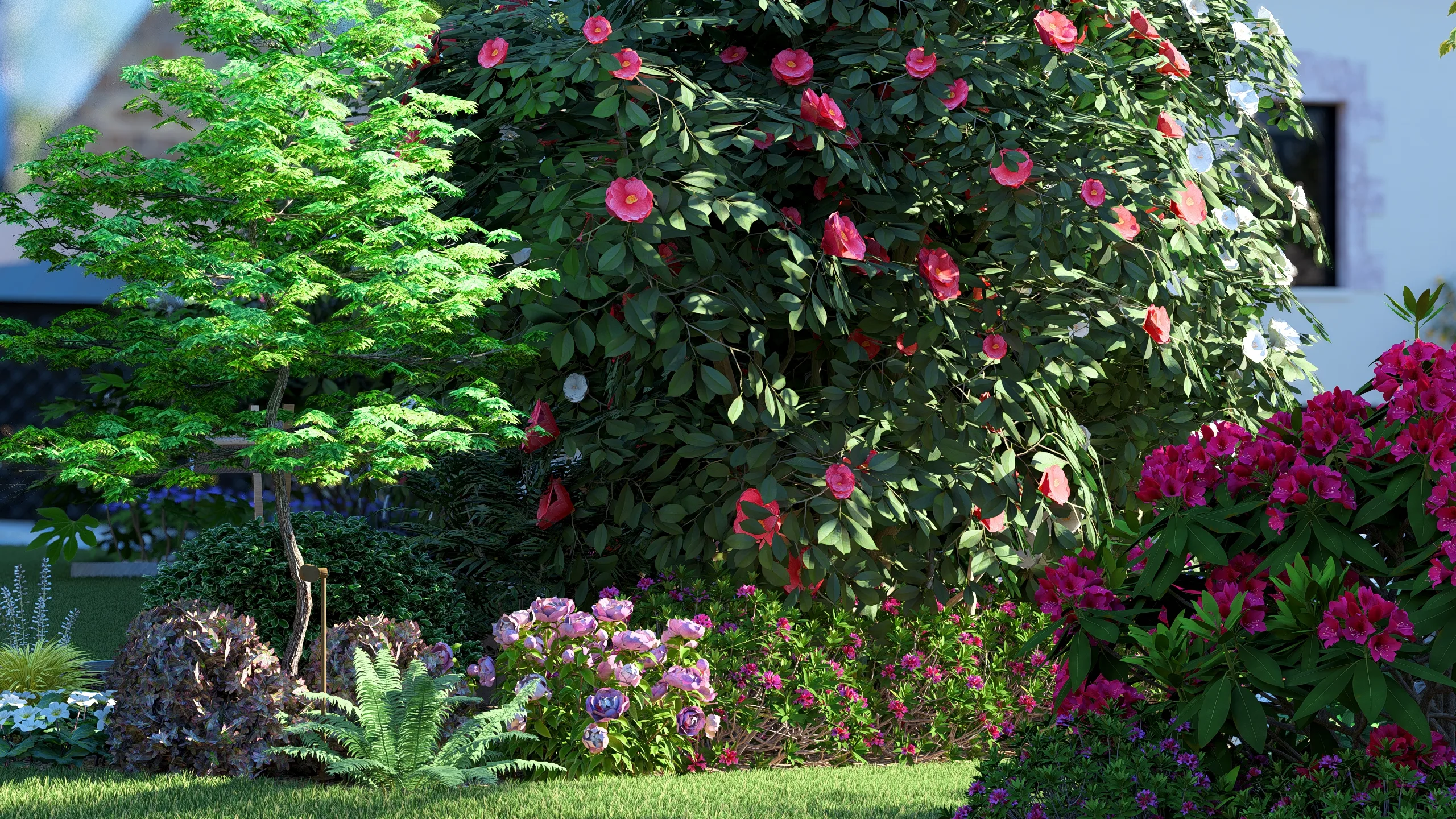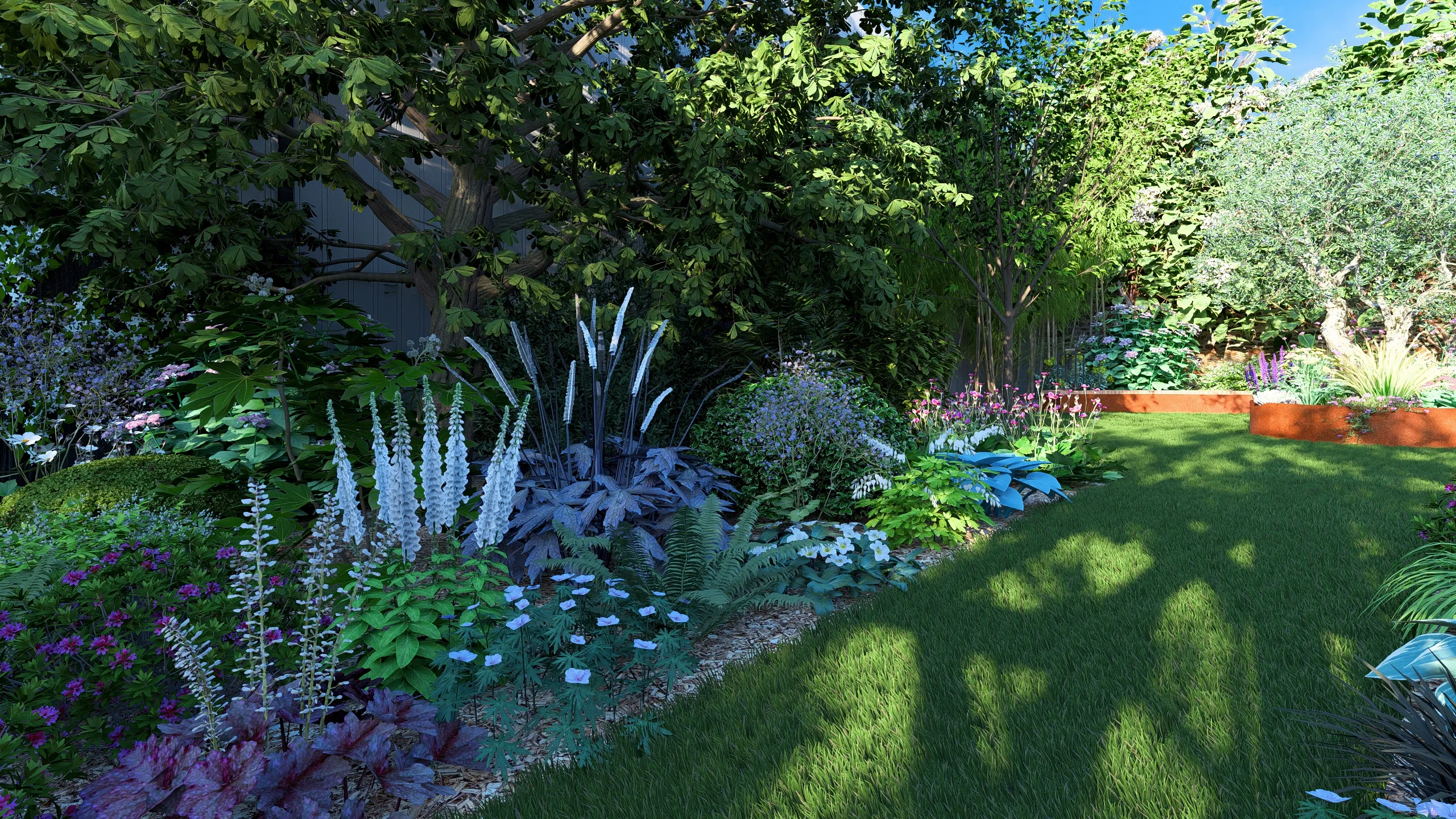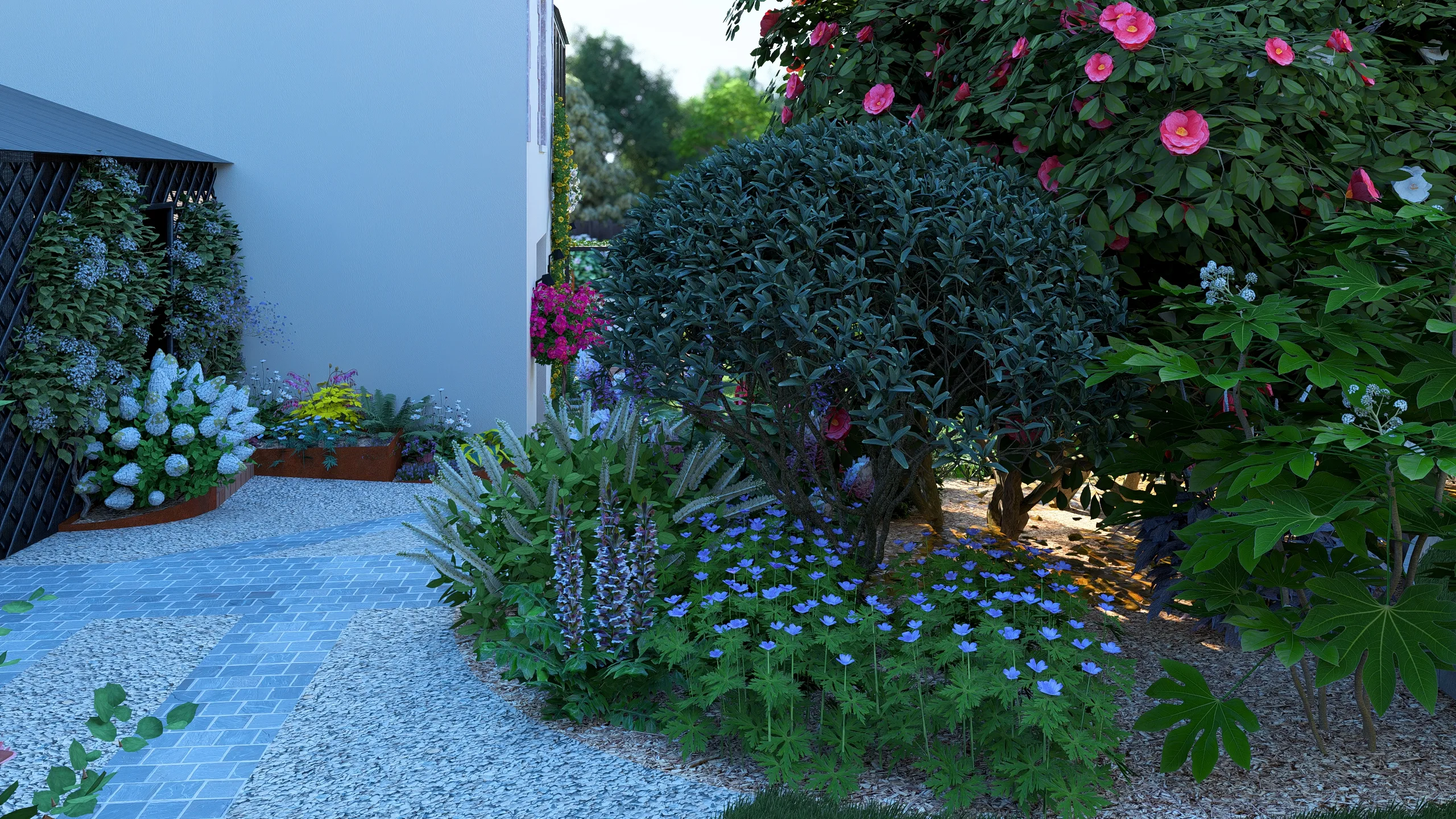 Les essences existantes, notamment les plantes de terre de bruyère, ont été conservées et réinterprétées au sein de nouveaux massifs, enrichis de vivaces et de graminées. Cette palette compose une atmosphère dense et fraîche, où la lumière se filtre à travers les feuillages, créant une sensation constante de douceur.