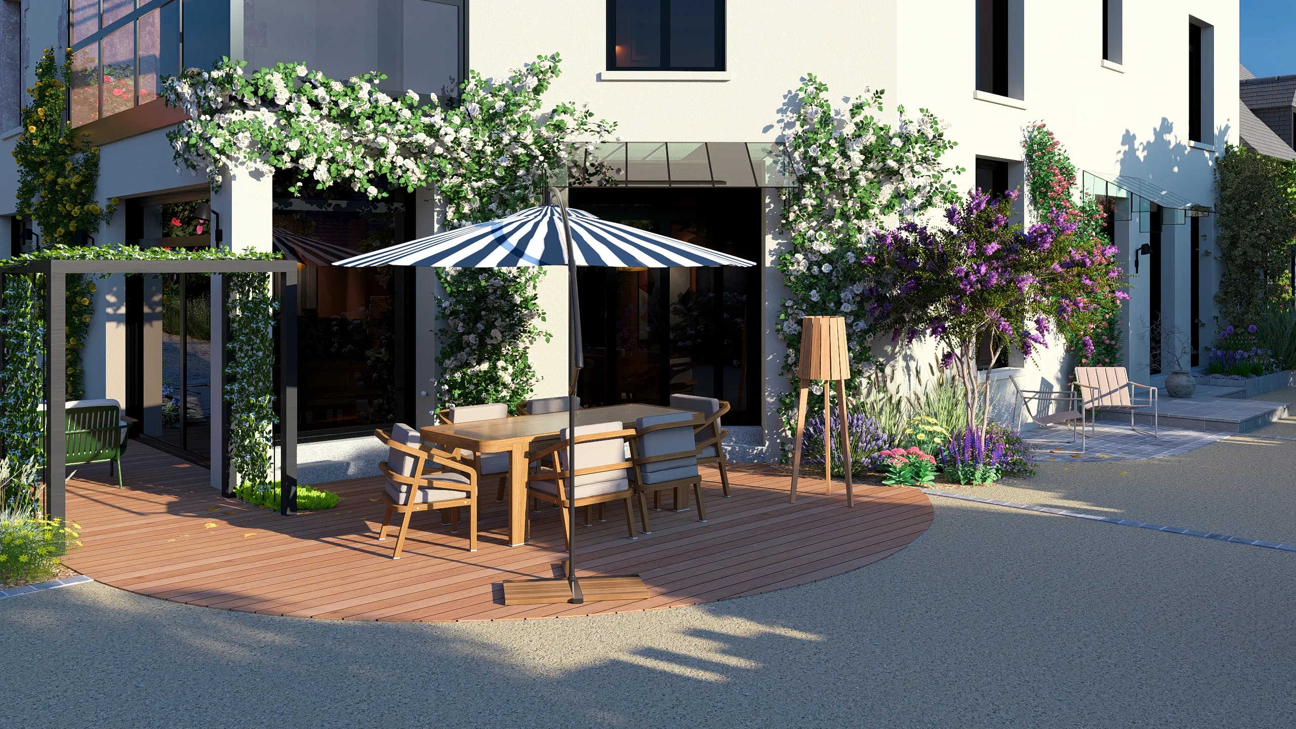 Autour de la maison, les terrasses ont été redéfinies pour accompagner les usages du quotidien, en créant des continuités naturelles entre intérieur et extérieur. Le bois vient adoucir les transitions, tandis que les matériaux minéraux, grès et pavages, structurent les circulations.