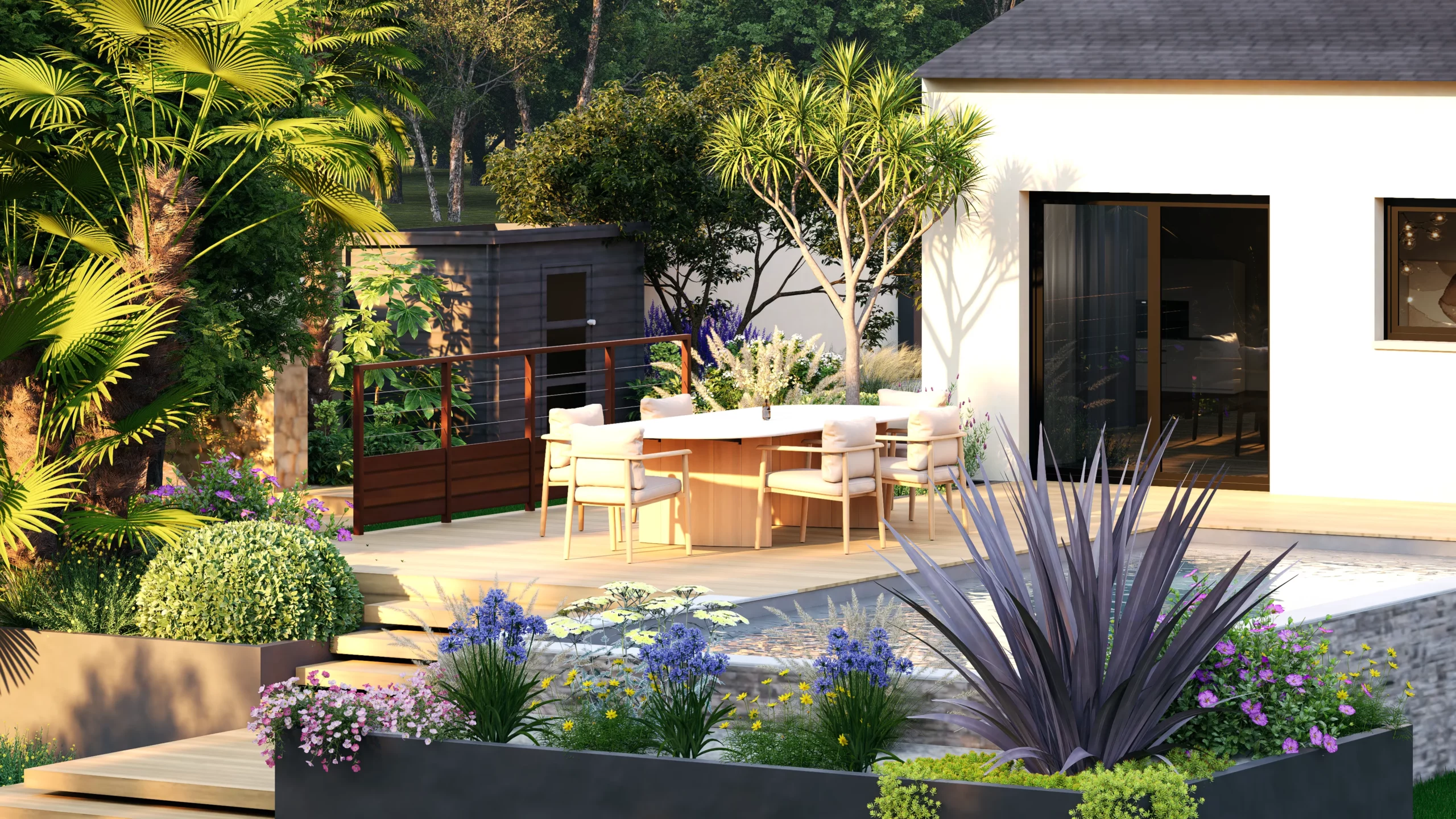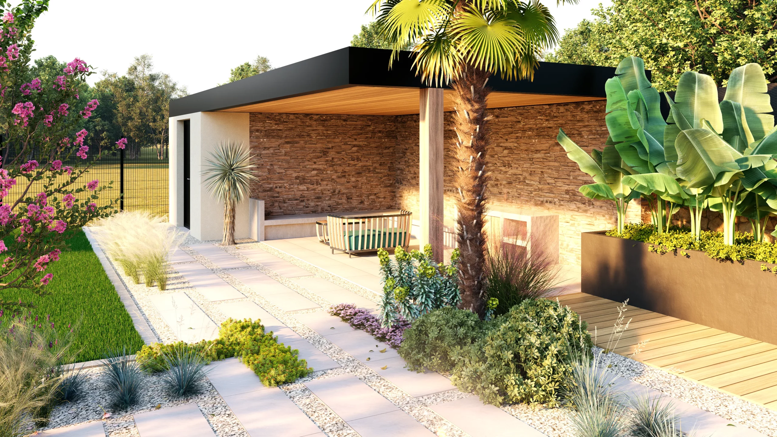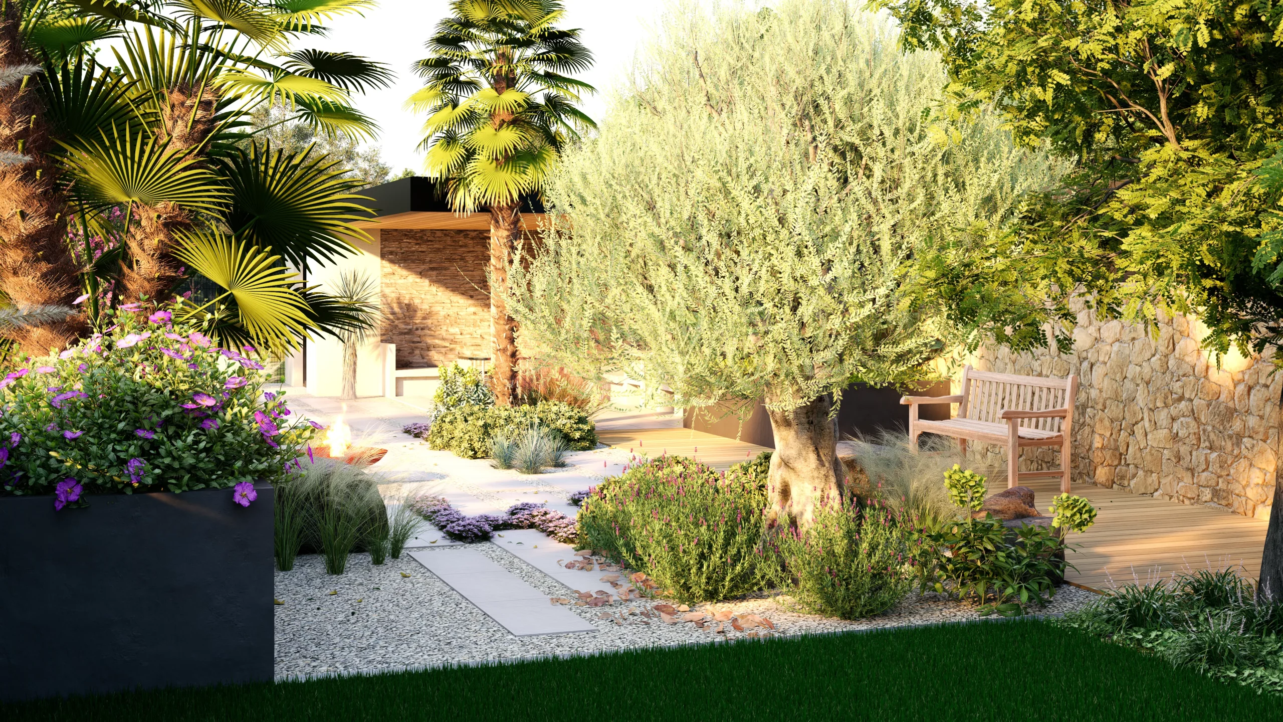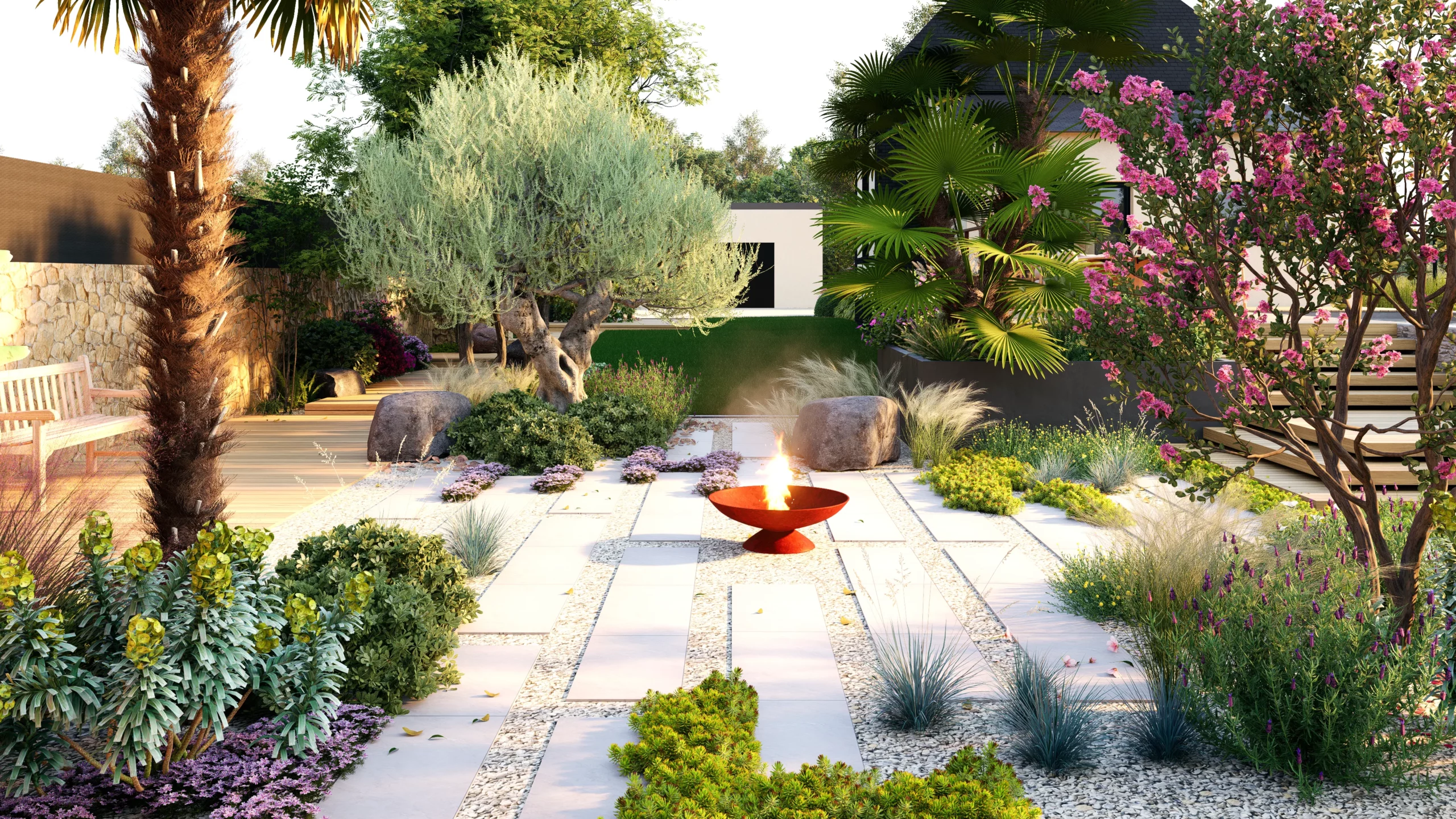 Le végétal, justement, constitue le liant du projet. Des silhouettes graphiques, palmiers, oliviers, yuccas, structurent l’espace, tandis que des plantations plus denses et luxuriantes viennent enrichir les scènes. Cette palette volontairement contrastée installe une ambiance à la fois contemporaine et chaleureuse, avec des influences plus exotiques qui apparaissent en filigrane.