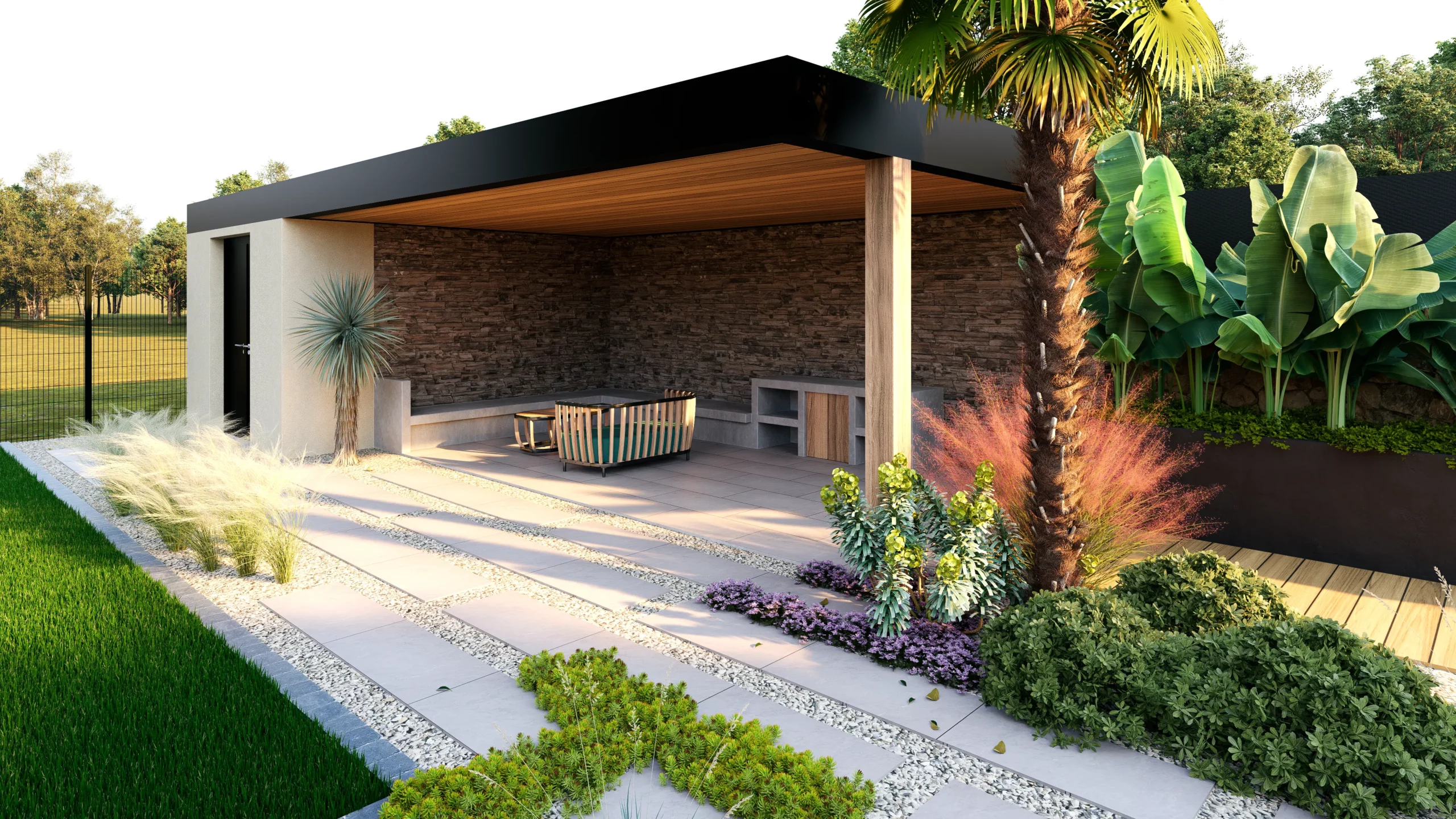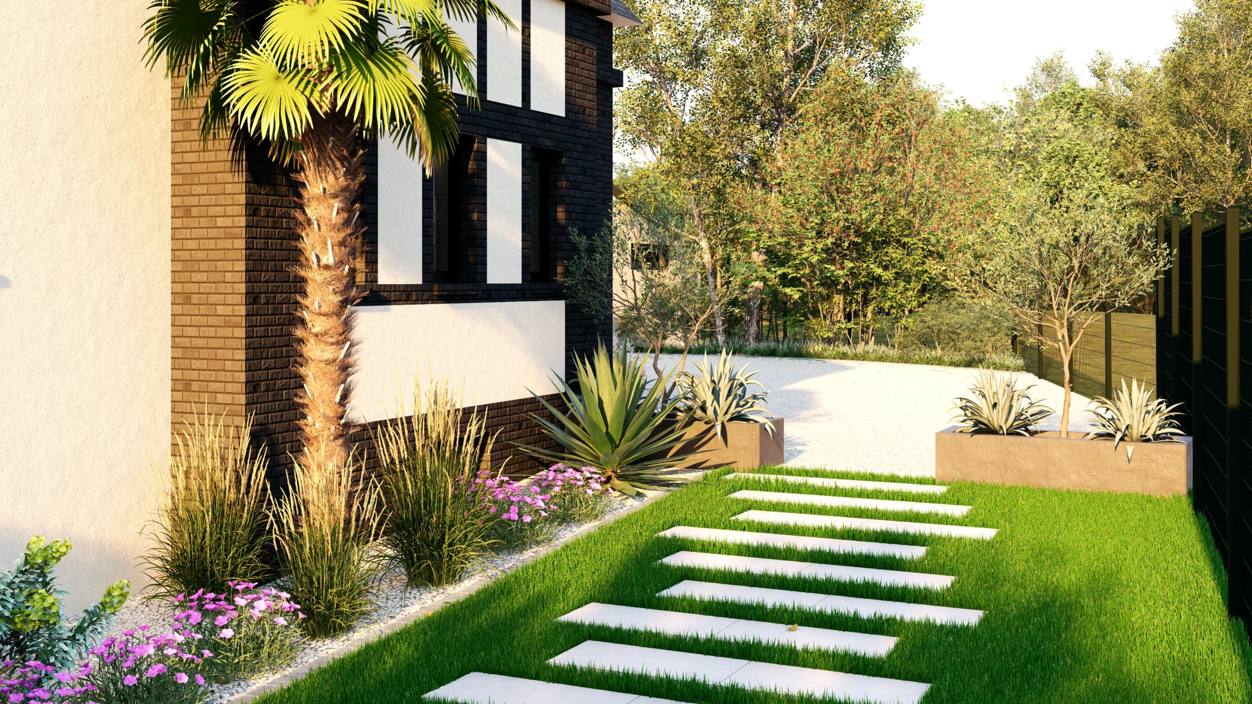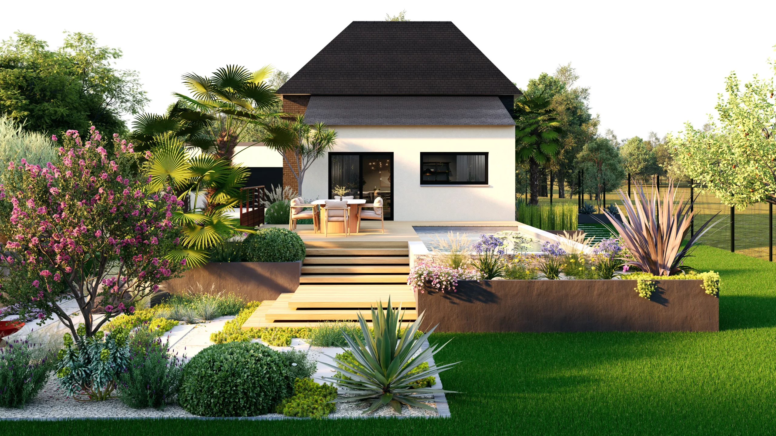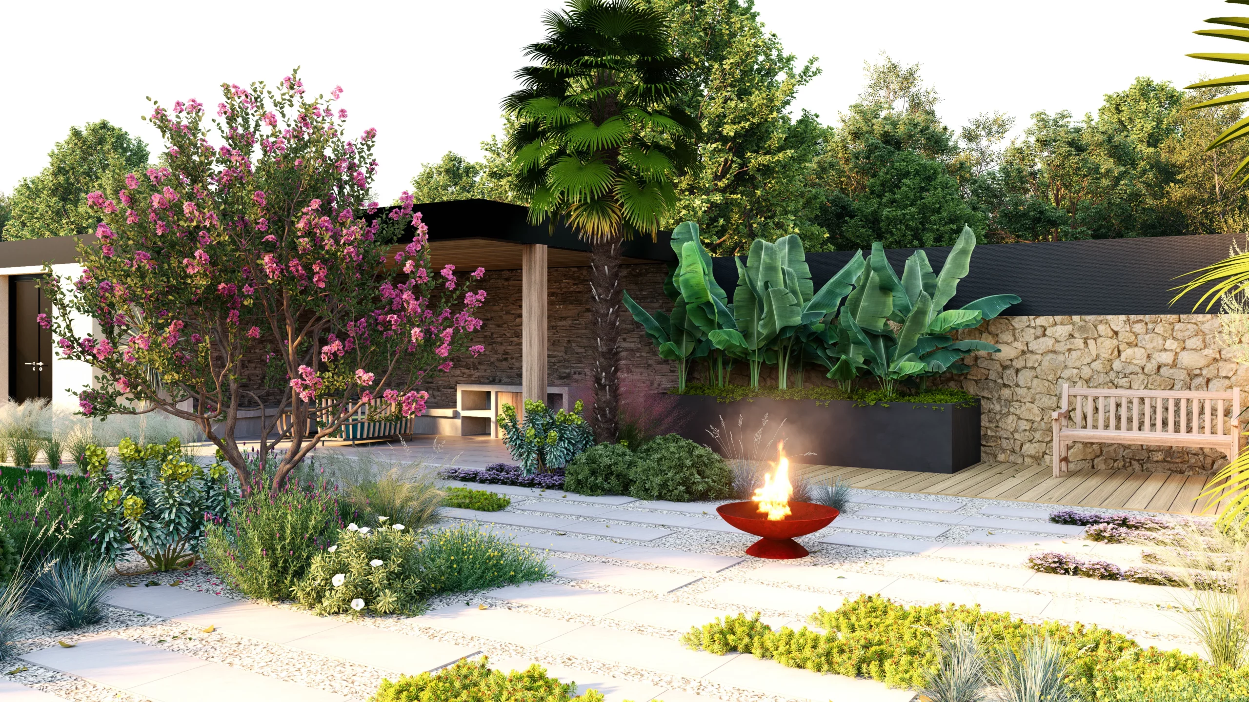 Le végétal, justement, constitue le liant du projet. Des silhouettes graphiques, palmiers, oliviers, yuccas, structurent l’espace, tandis que des plantations plus denses et luxuriantes viennent enrichir les scènes. Cette palette volontairement contrastée installe une ambiance à la fois contemporaine et chaleureuse, avec des influences plus exotiques qui apparaissent en filigrane.