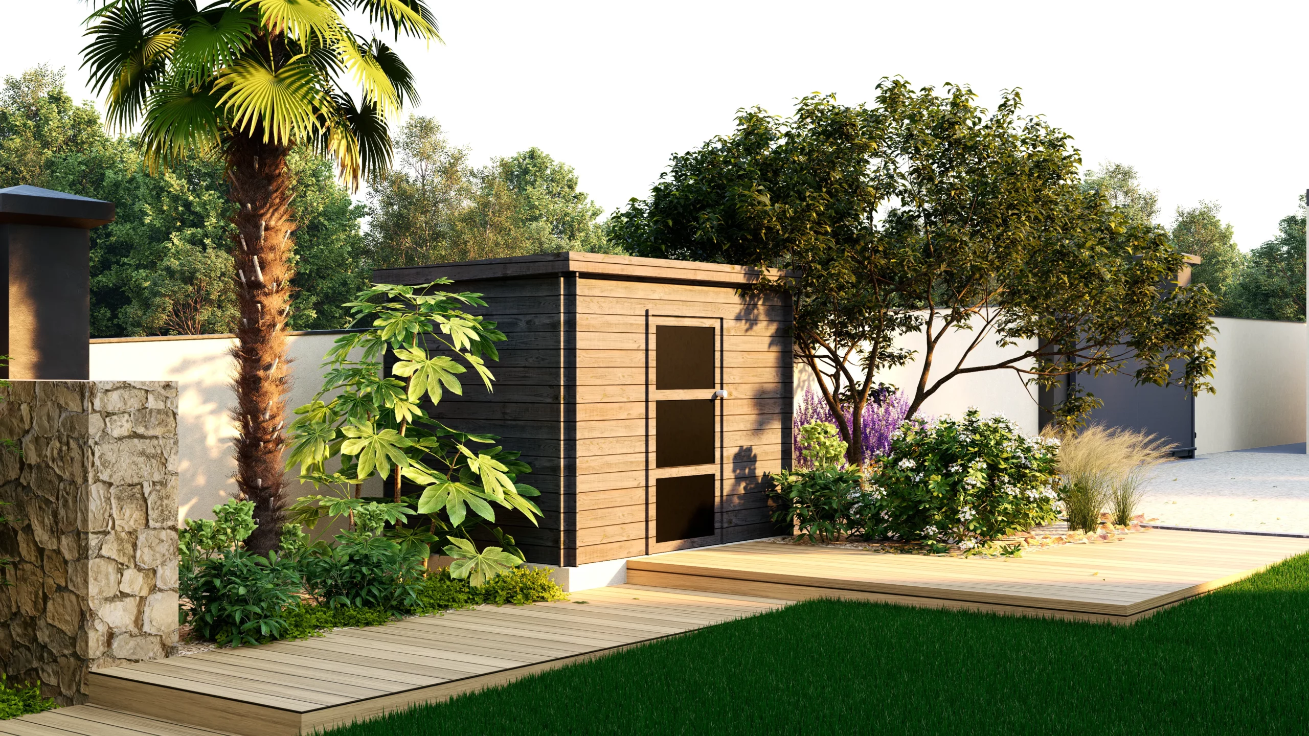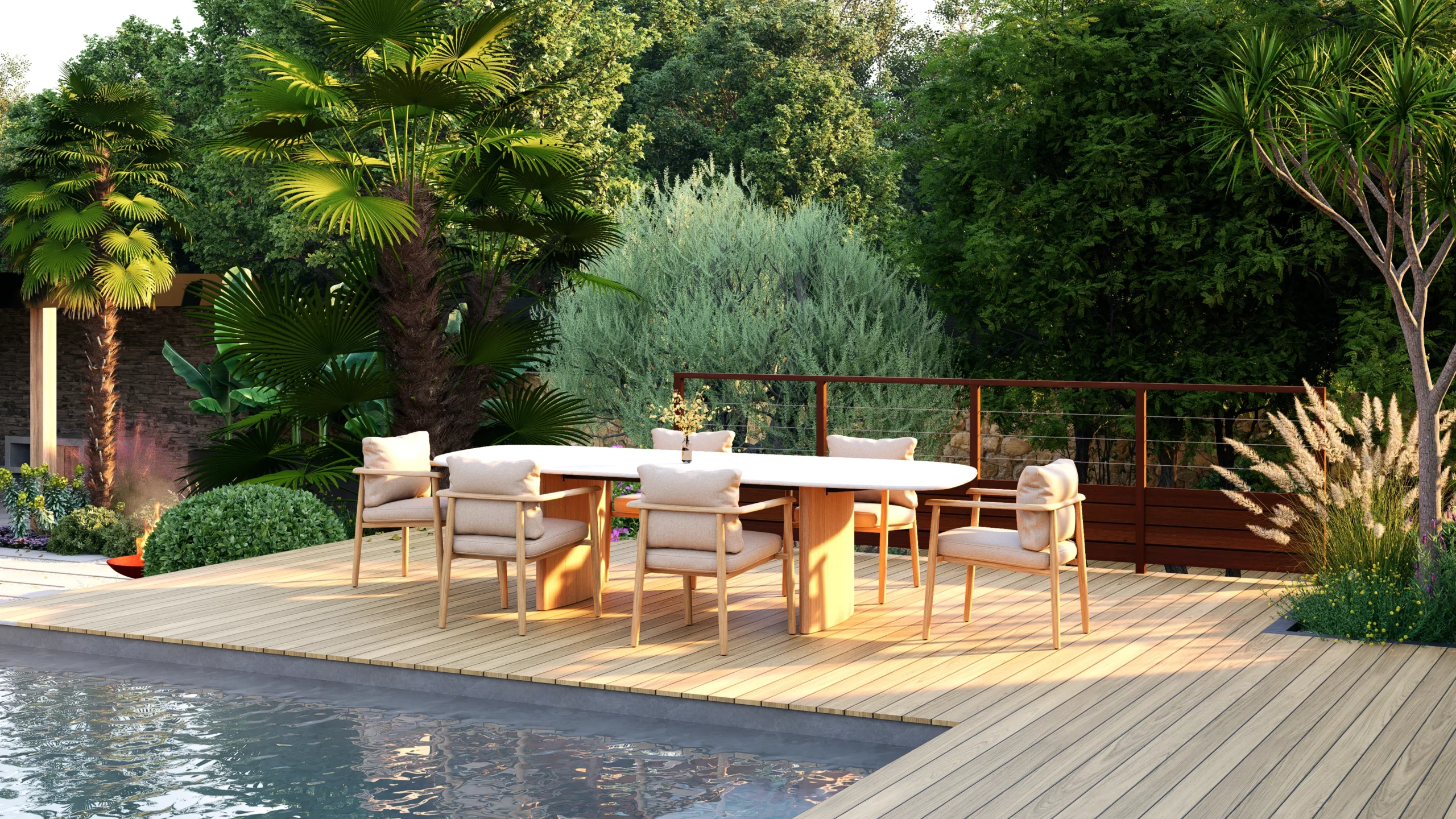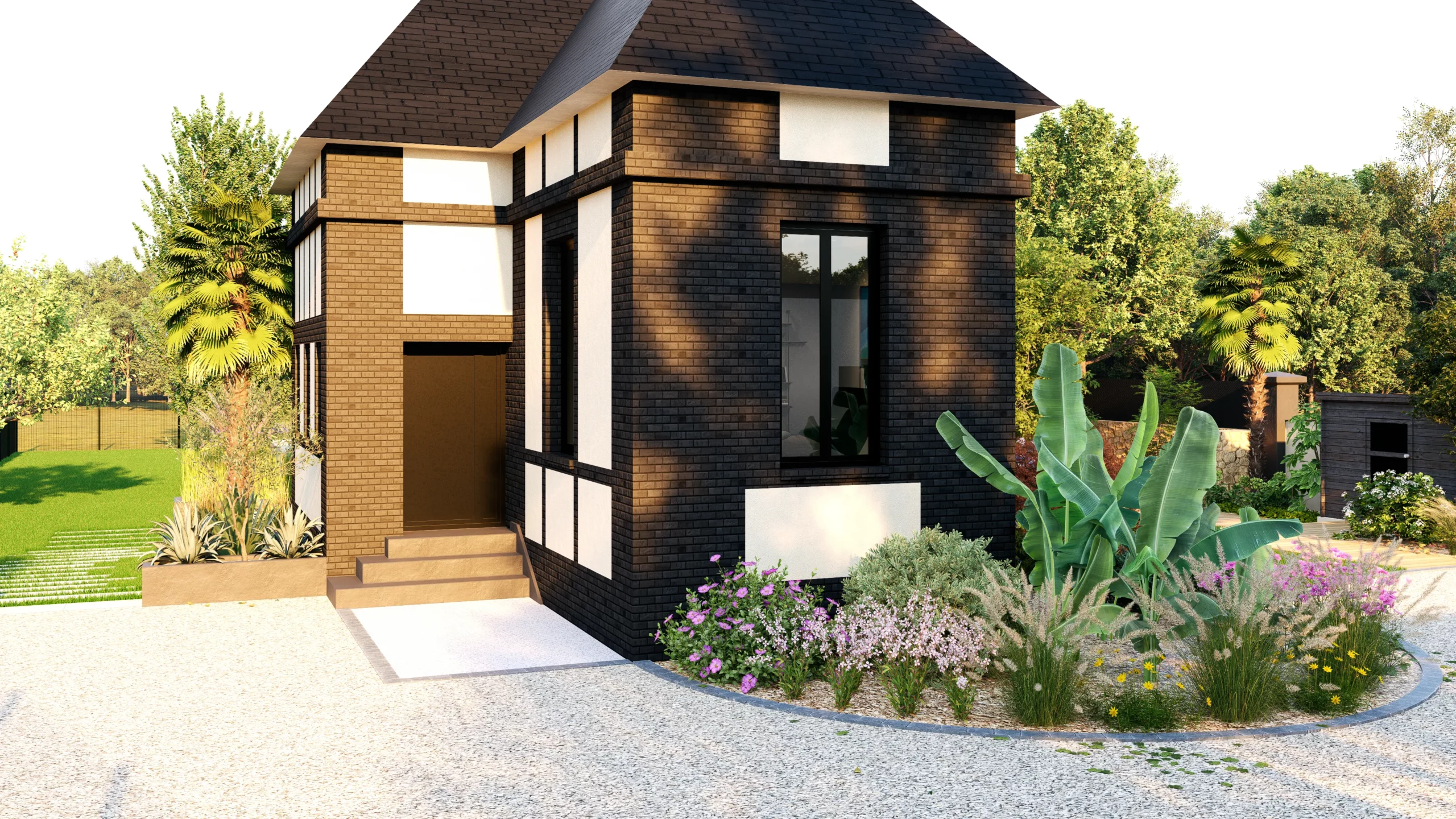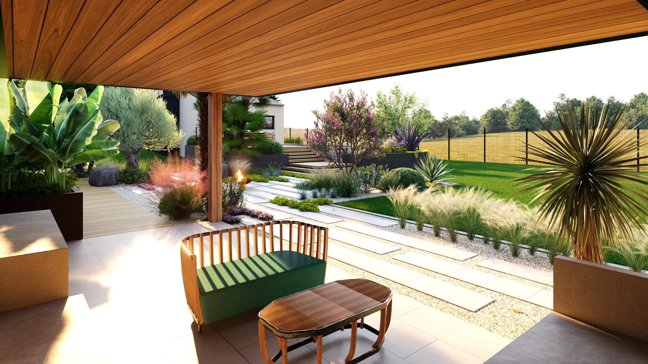 Le végétal, justement, constitue le liant du projet. Des silhouettes graphiques, palmiers, oliviers, yuccas, structurent l’espace, tandis que des plantations plus denses et luxuriantes viennent enrichir les scènes. Cette palette volontairement contrastée installe une ambiance à la fois contemporaine et chaleureuse, avec des influences plus exotiques qui apparaissent en filigrane.