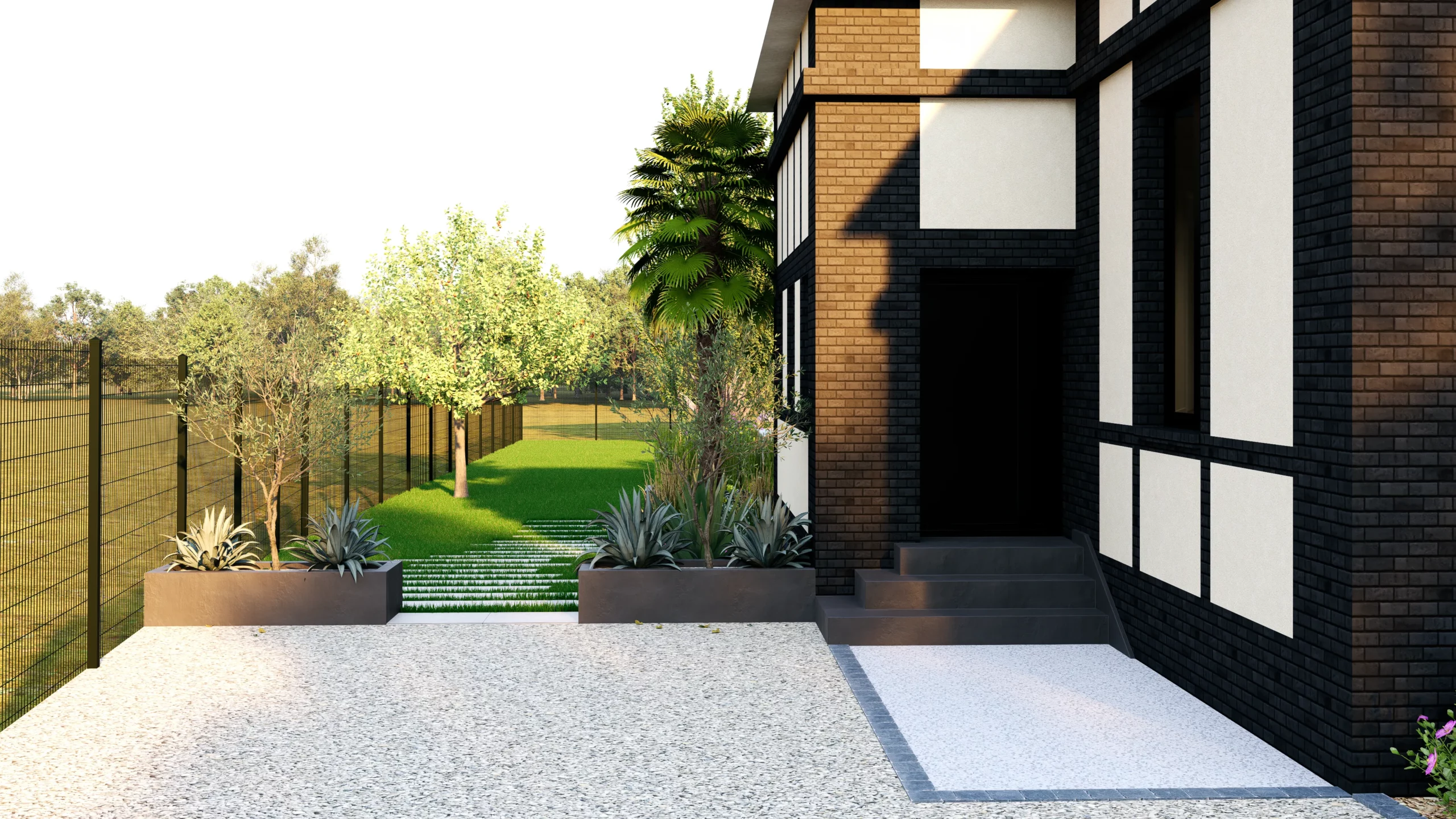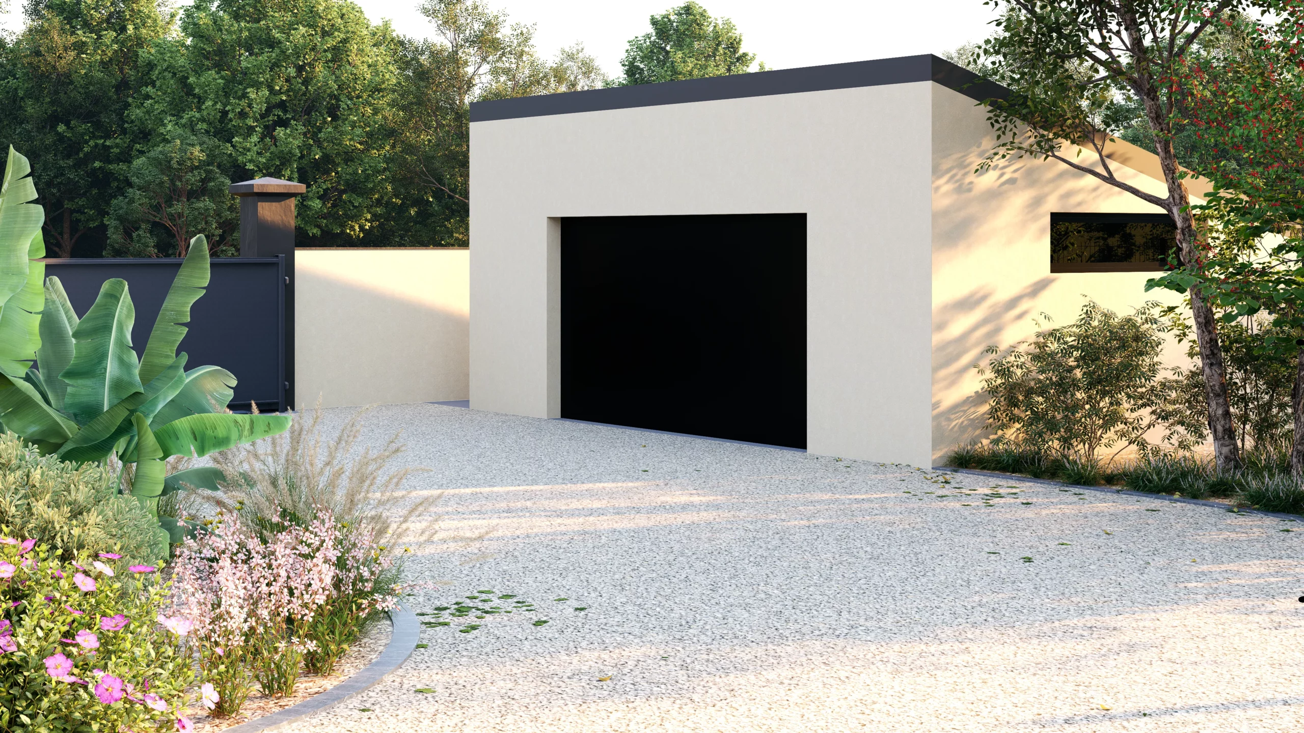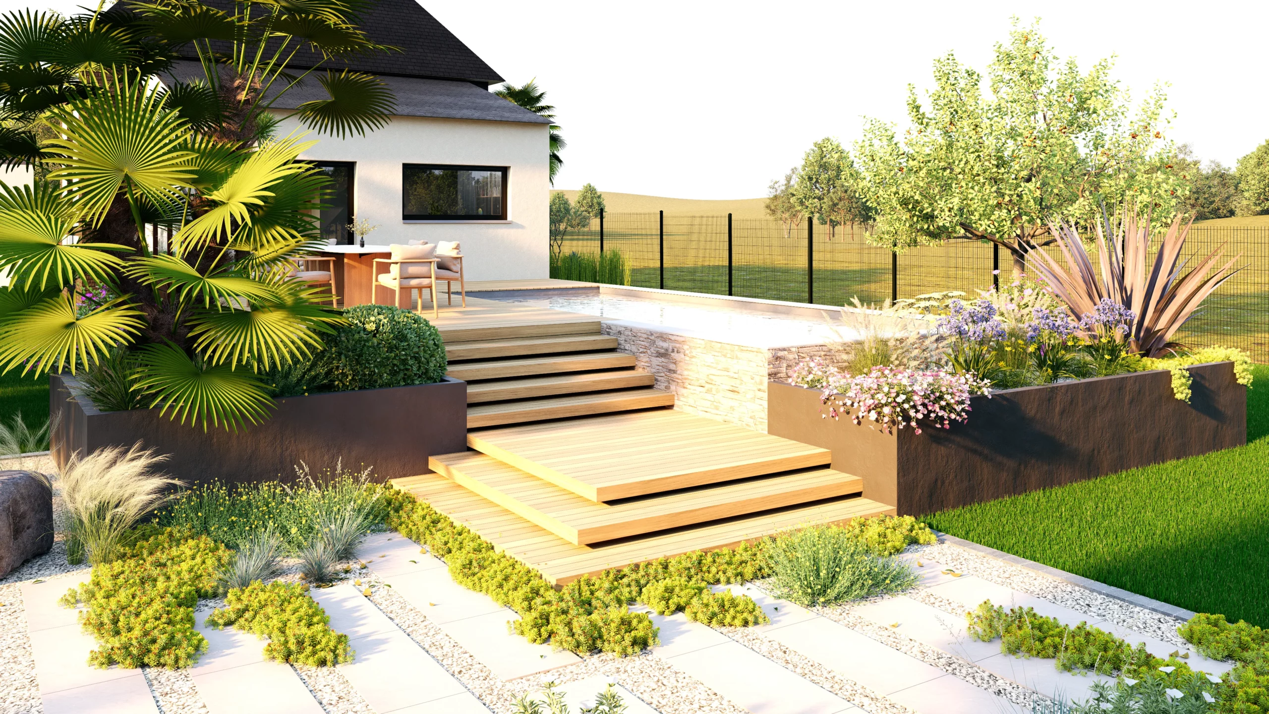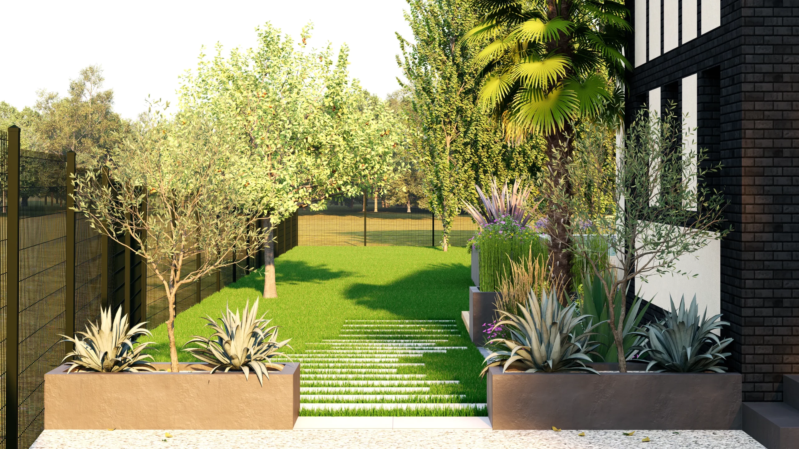 Le végétal, justement, constitue le liant du projet. Des silhouettes graphiques, palmiers, oliviers, yuccas, structurent l’espace, tandis que des plantations plus denses et luxuriantes viennent enrichir les scènes. Cette palette volontairement contrastée installe une ambiance à la fois contemporaine et chaleureuse, avec des influences plus exotiques qui apparaissent en filigrane.