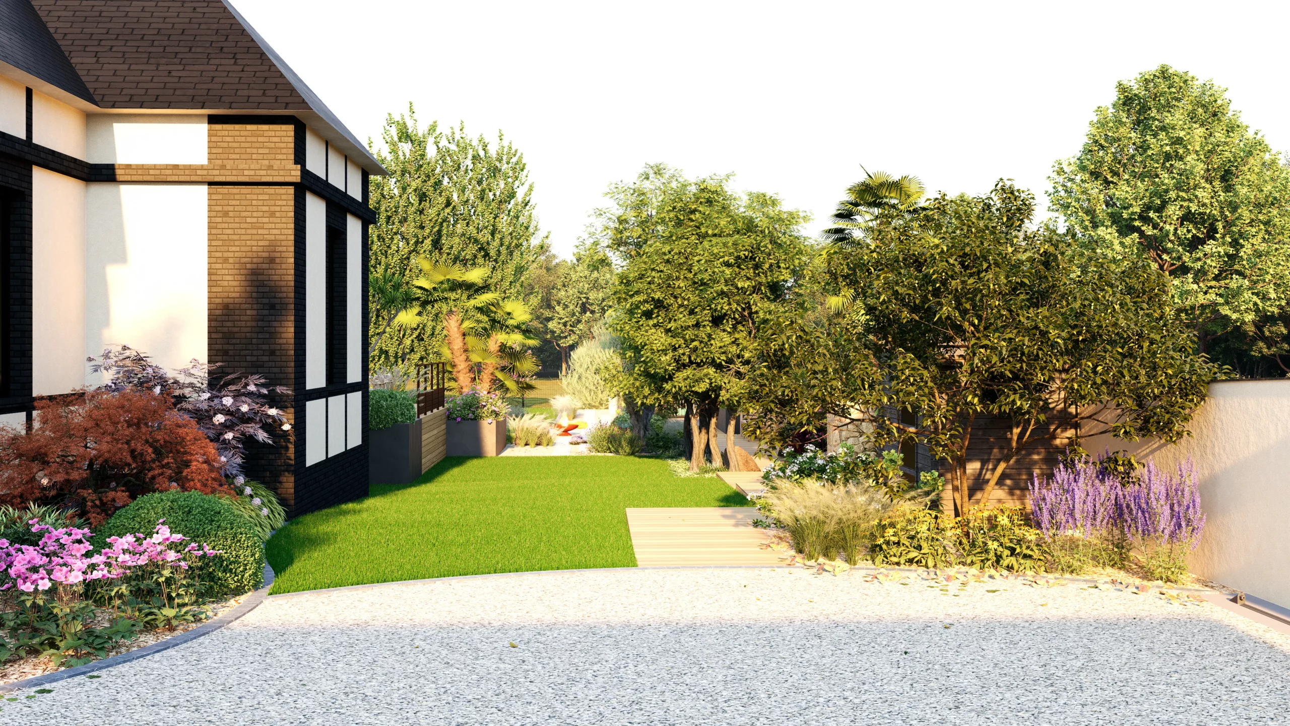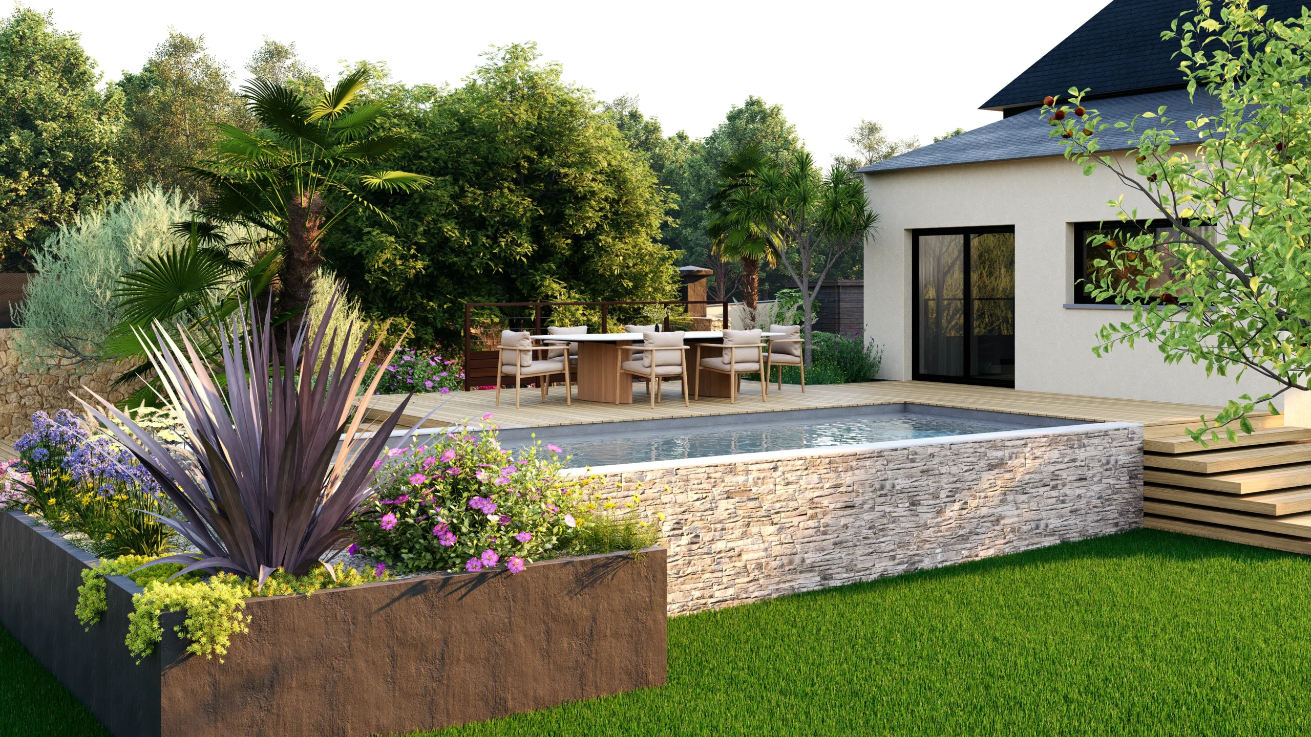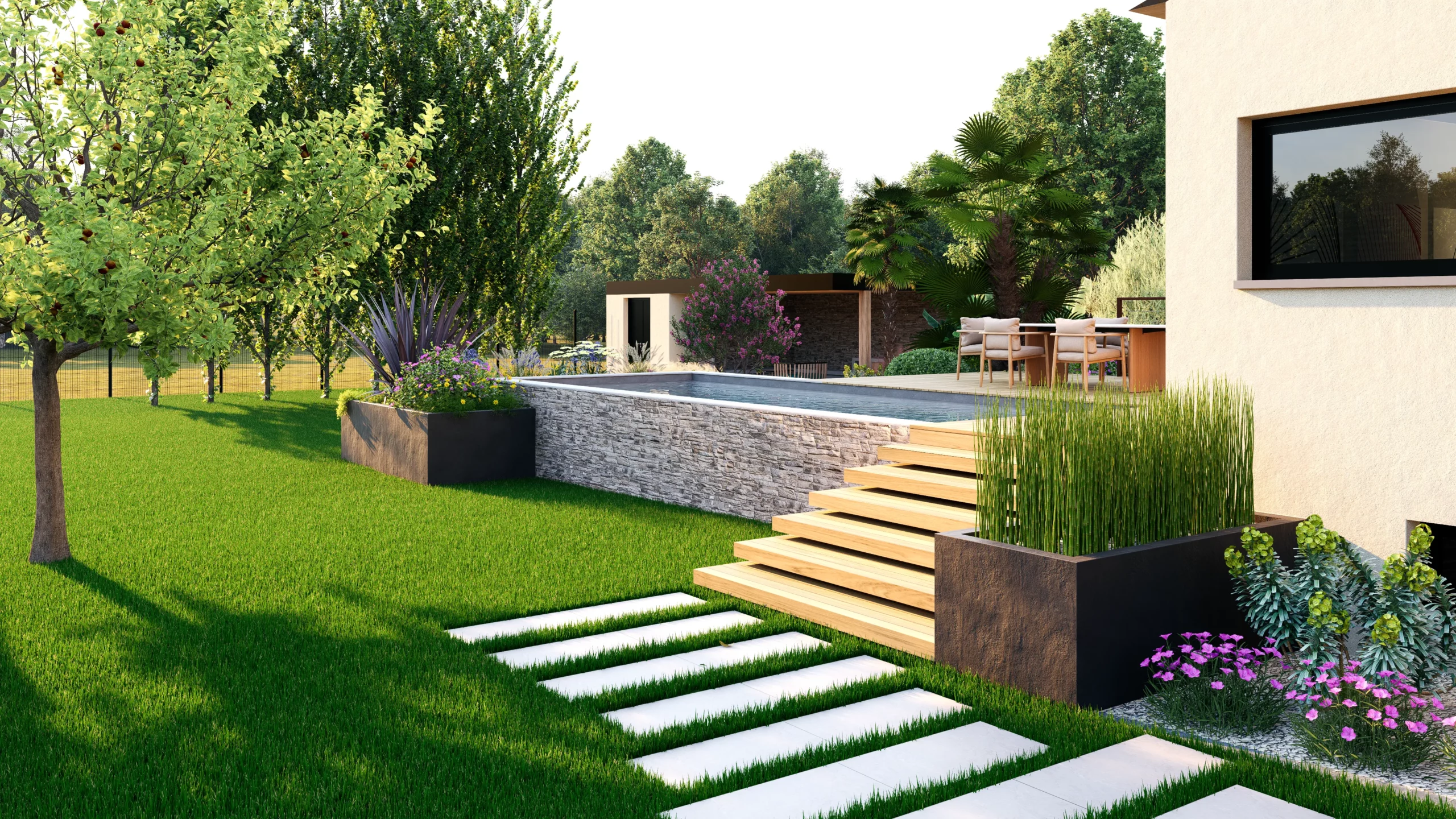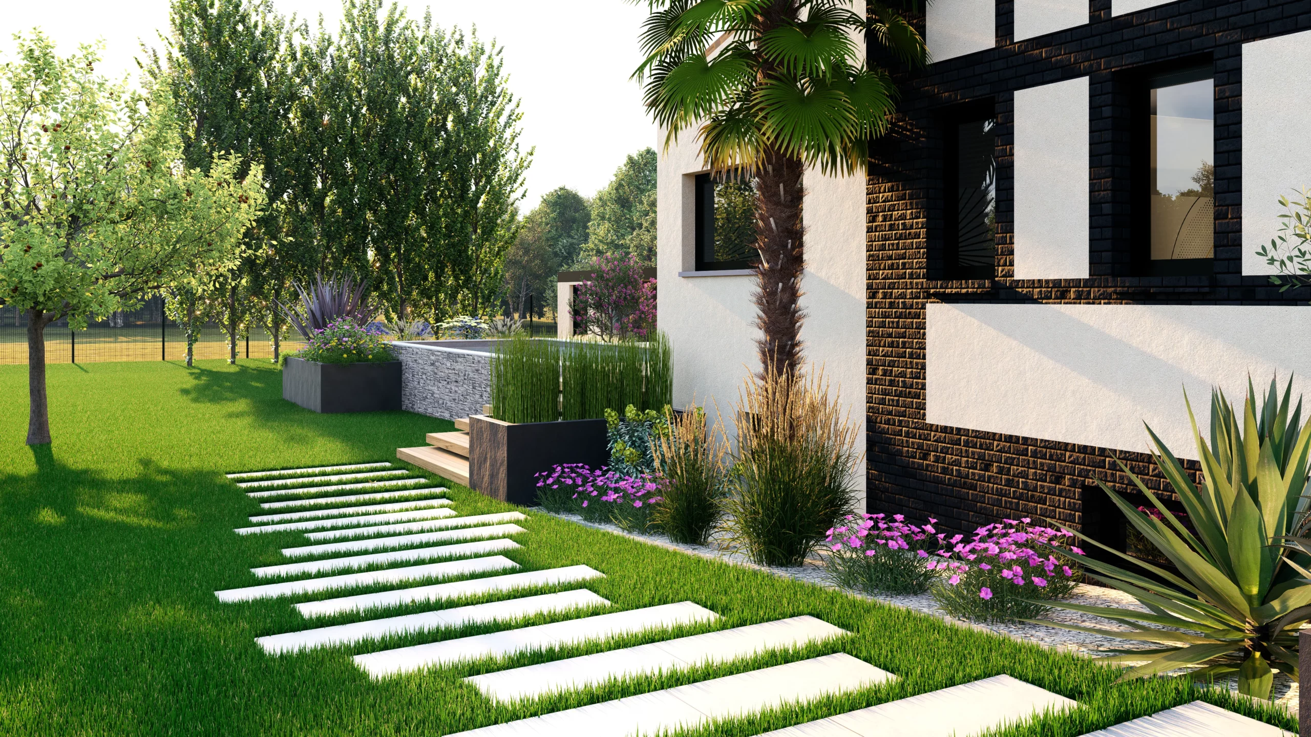 Le jardin se découvre ainsi par séquences. Des espaces ouverts et structurés alternent avec des ambiances plus libres, plus végétales. Entre minéral et luxuriance, entre lignes franches et compositions plus souples, le projet cherche avant tout à offrir un cadre de vie adaptable, pensé pour évoluer avec les usages et les saisons.