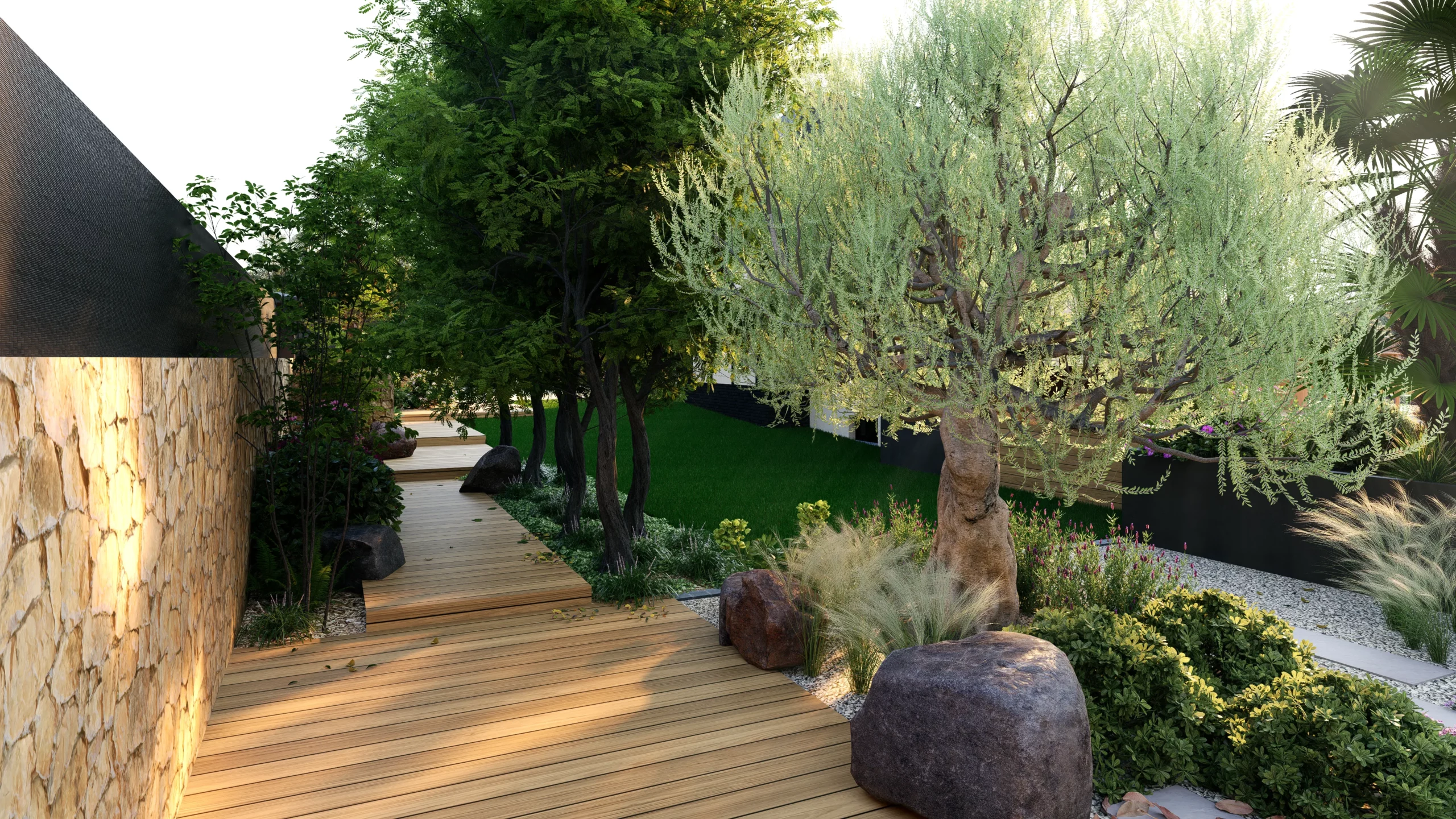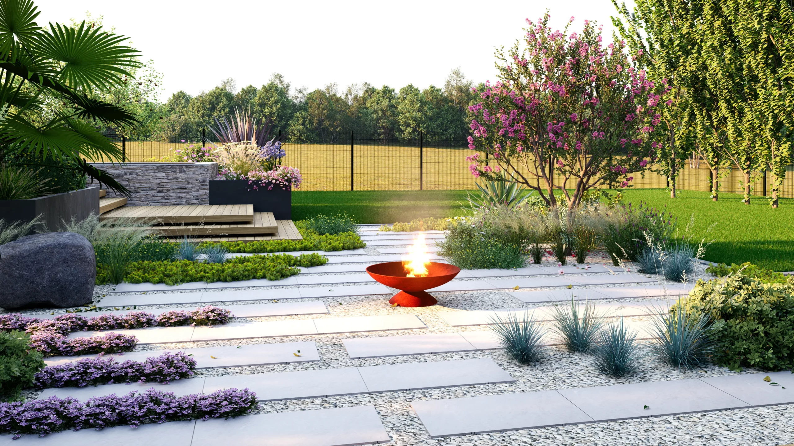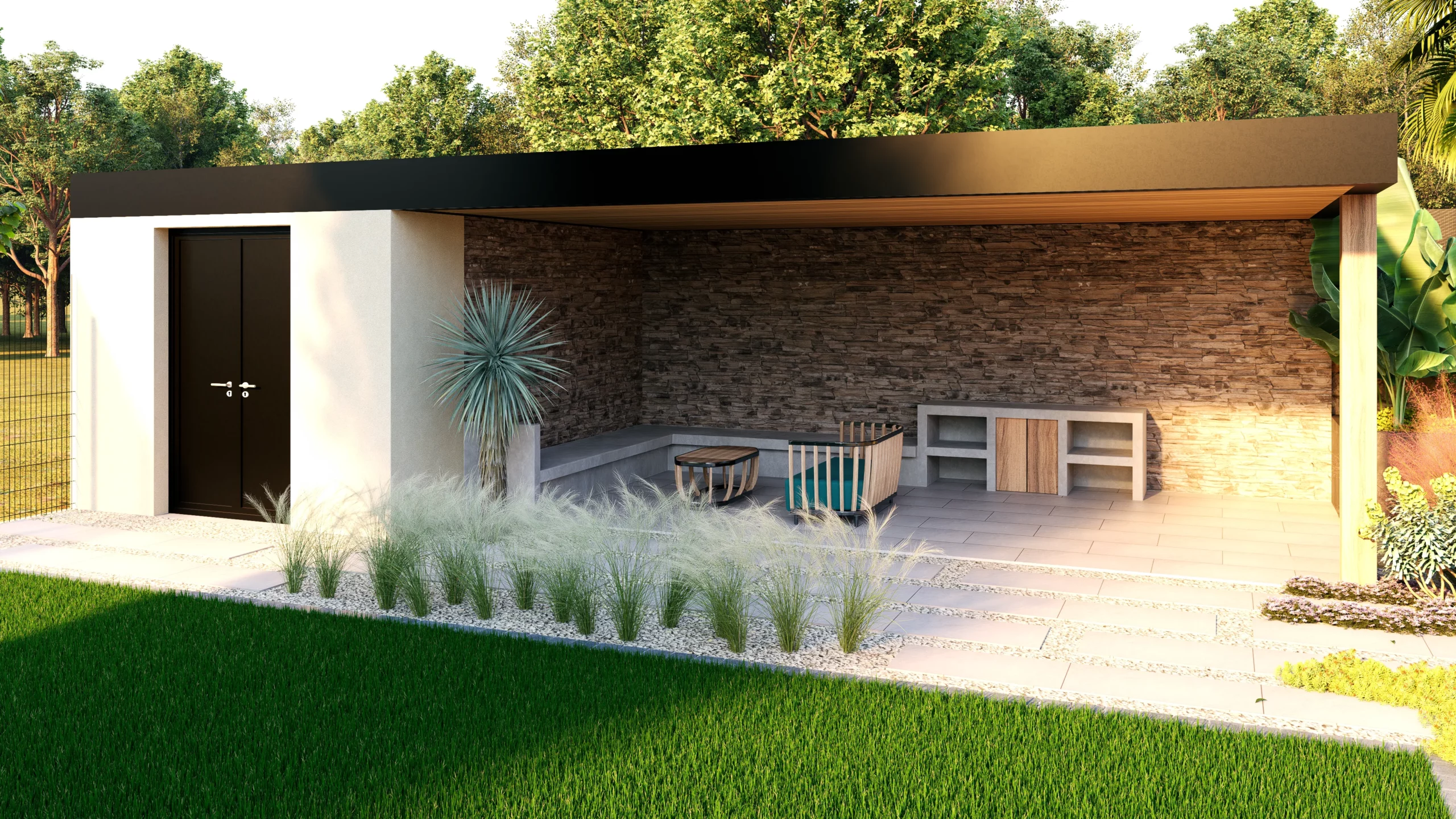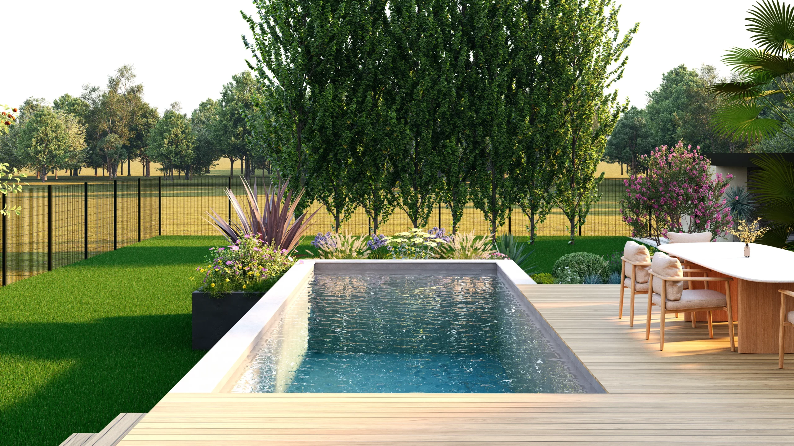 Le jardin se découvre ainsi par séquences. Des espaces ouverts et structurés alternent avec des ambiances plus libres, plus végétales. Entre minéral et luxuriance, entre lignes franches et compositions plus souples, le projet cherche avant tout à offrir un cadre de vie adaptable, pensé pour évoluer avec les usages et les saisons.