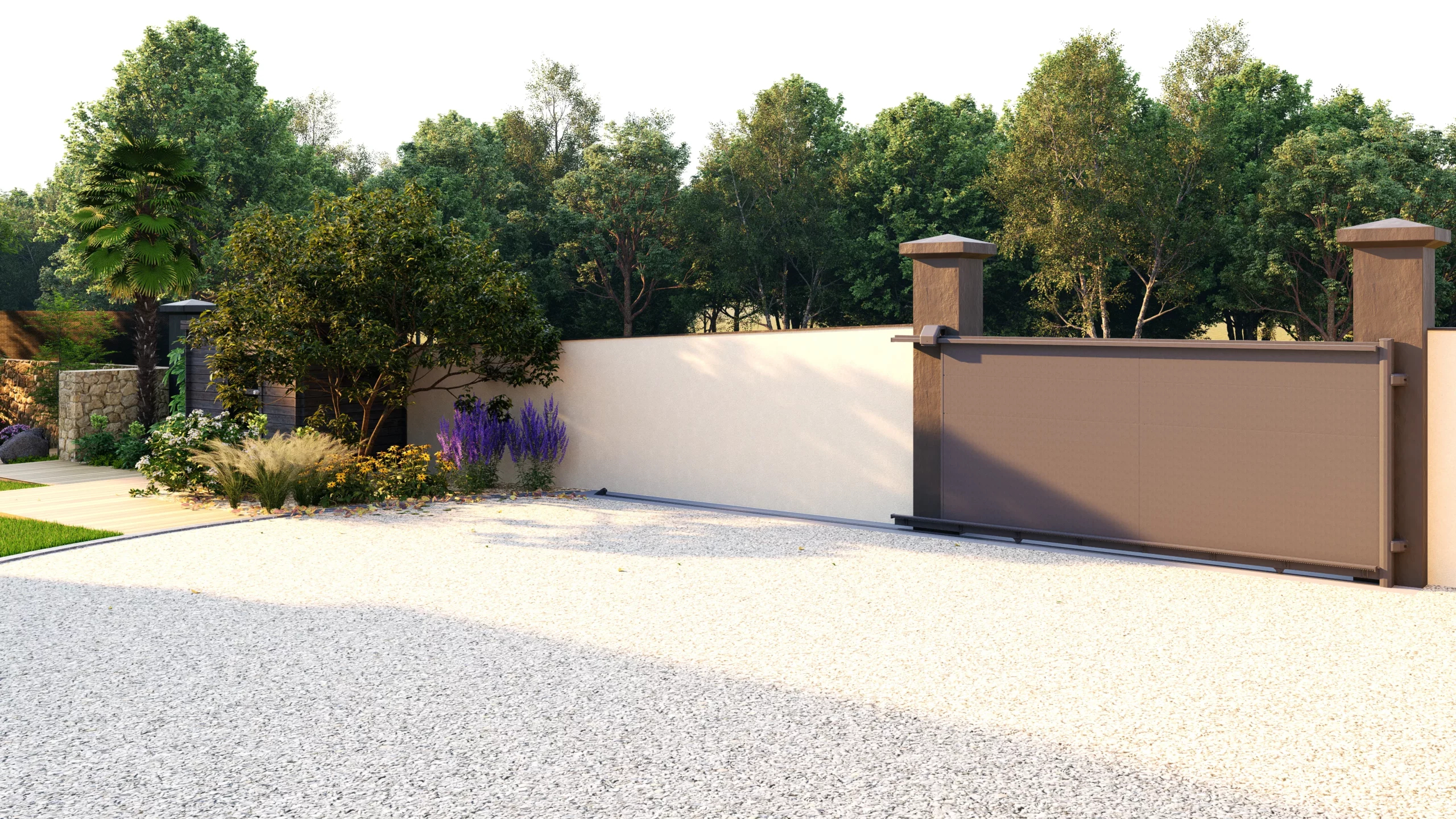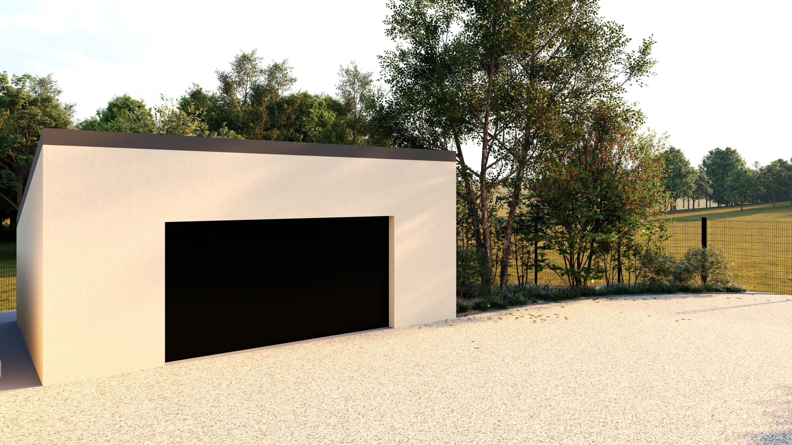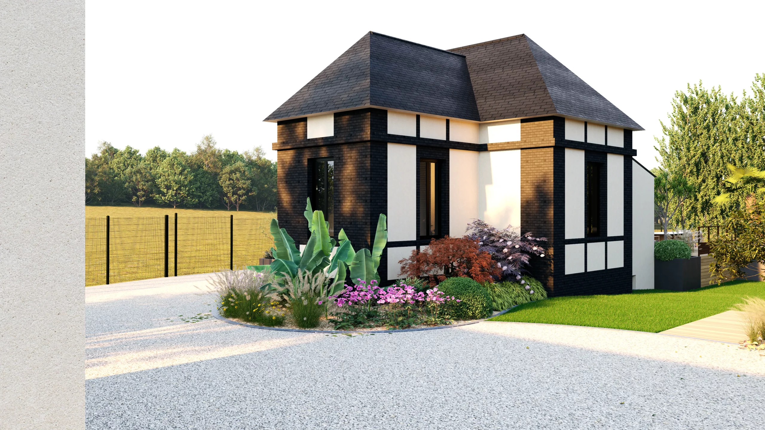 À l’avant, la cour en gravier reste volontairement simple et fonctionnelle, dédiée aux usages quotidiens. Des massifs viennent en adoucir les limites, en intégrant progressivement le bâti dans un environnement plus végétal.