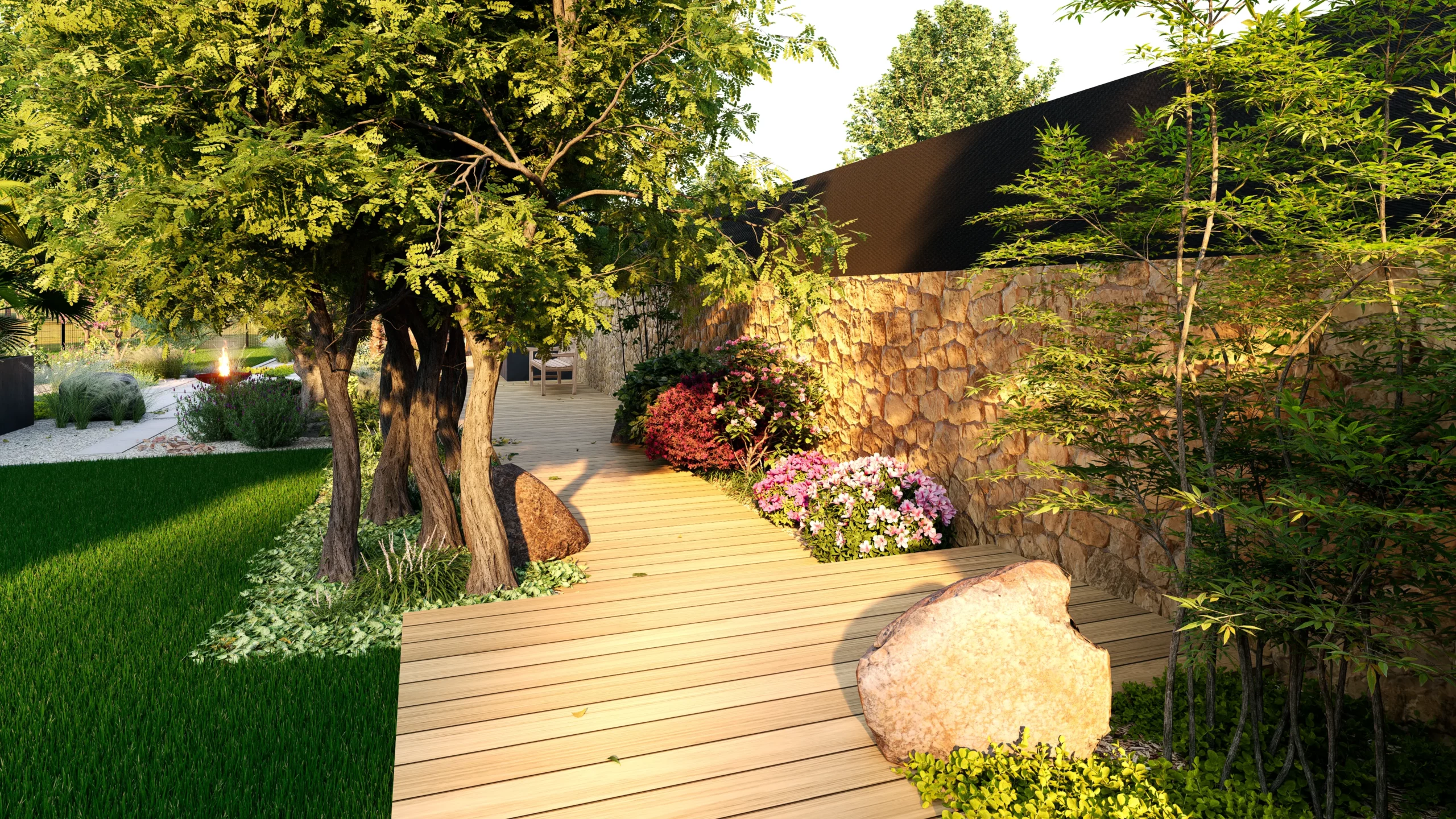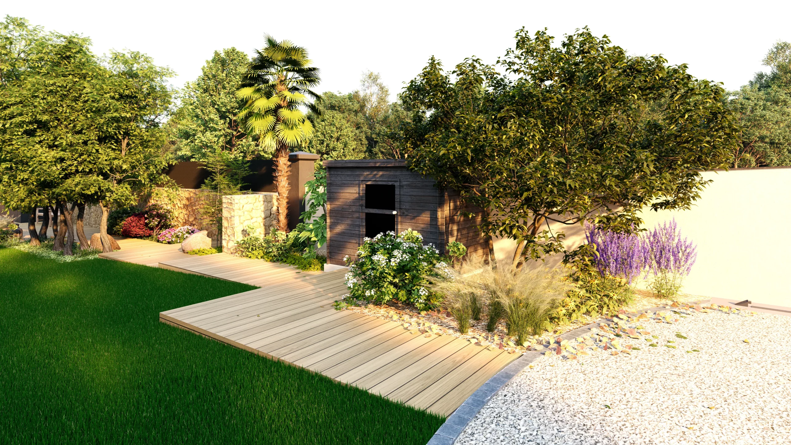 Les circulations accompagnent naturellement les déplacements. Un platelage bois longe le muret en pierre existant et guide le regard comme les pas, depuis l’entrée jusqu’au fond de parcelle, en desservant les différents espaces, dont un abri de jardin. Ce fil conducteur permet de structurer sans cloisonner.