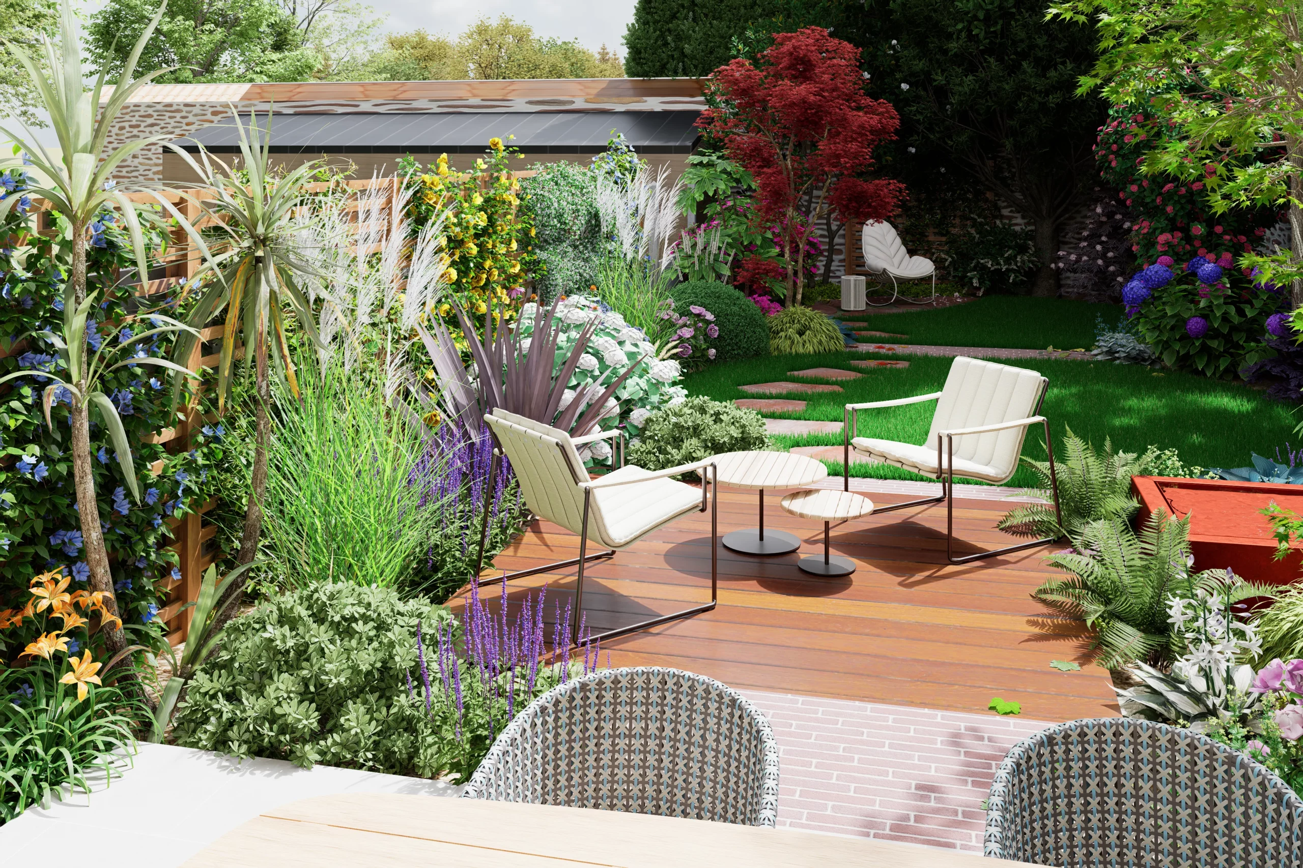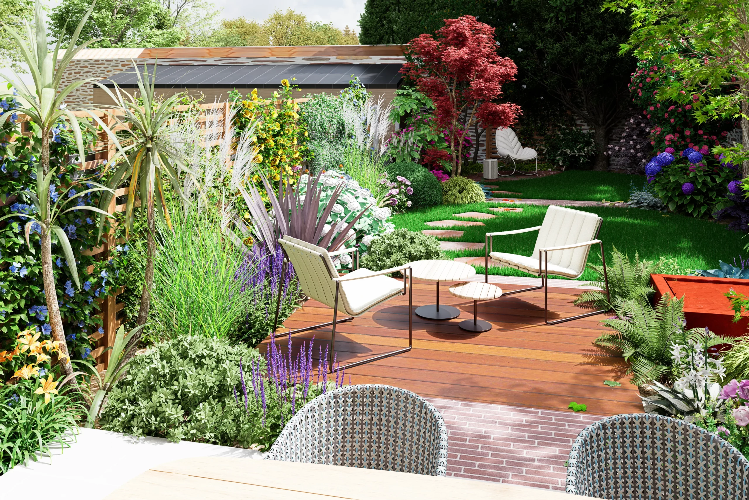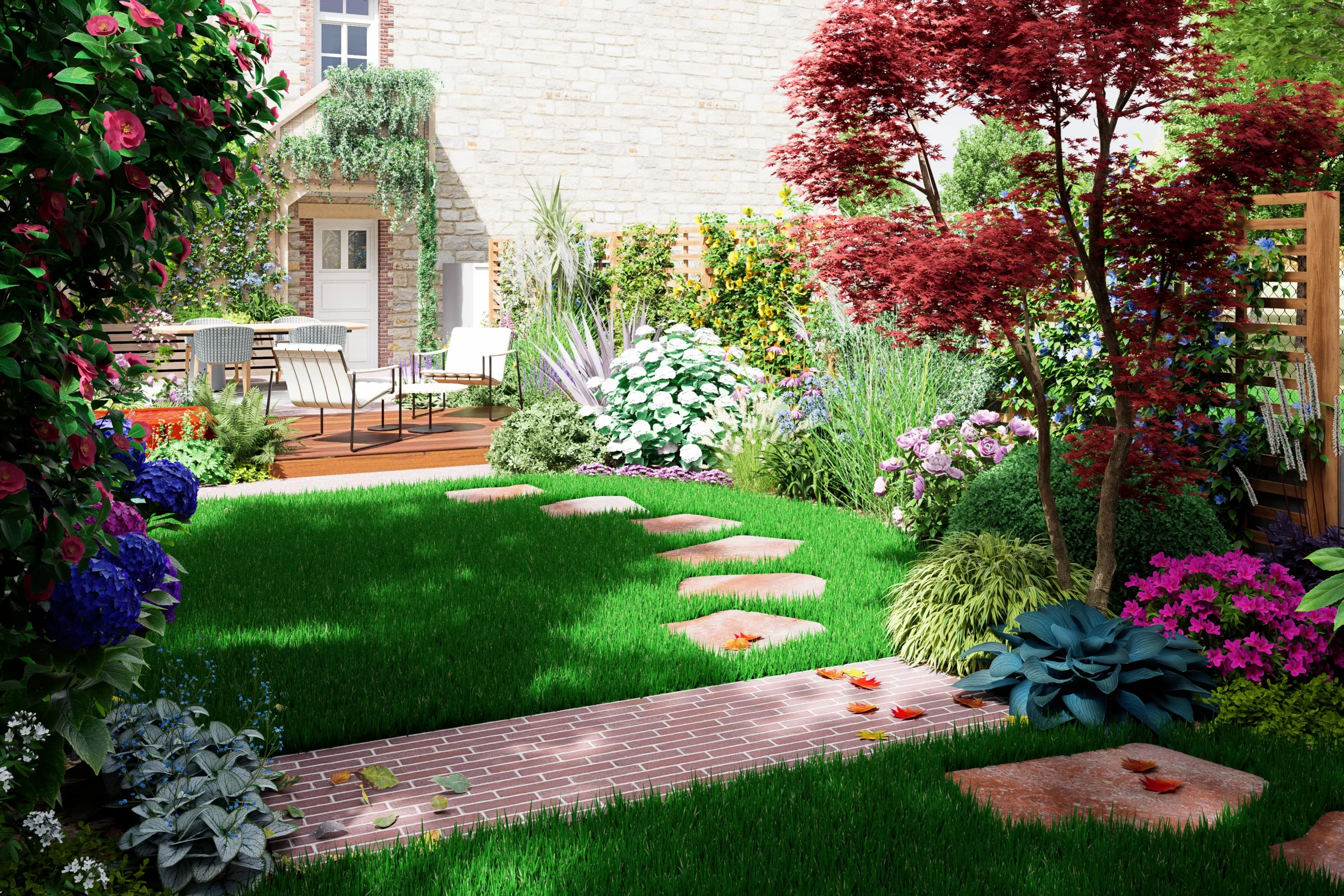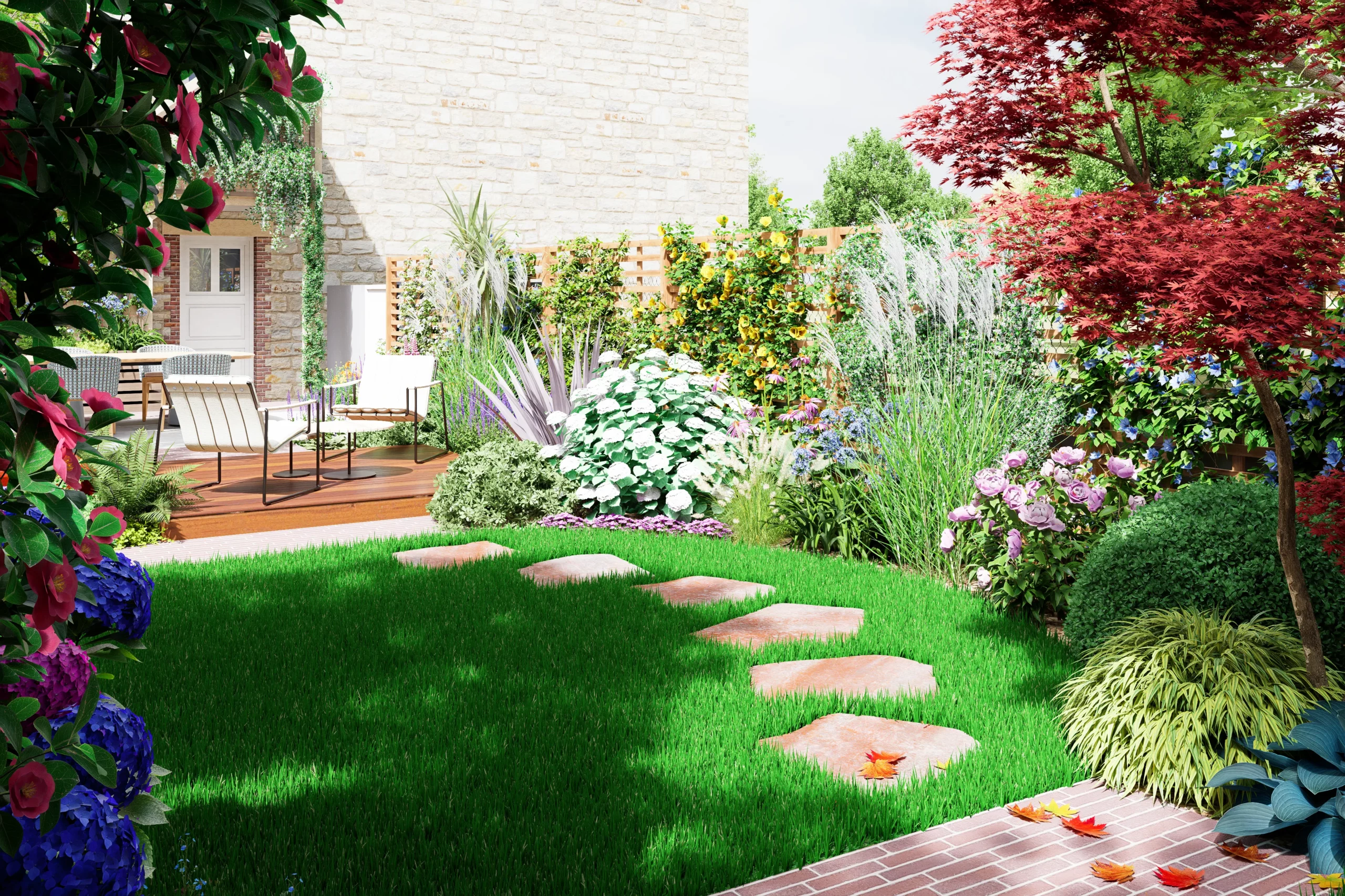 La composition s’organise par strates. La terrasse en dallage prolonge naturellement l’architecture de la maison, tandis qu’une terrasse en bois légèrement surélevée crée une transition plus douce vers le jardin. Un cheminement discret en pas japonais traverse le gazon et relie les différents espaces, comme une invitation légère à parcourir le lieu.