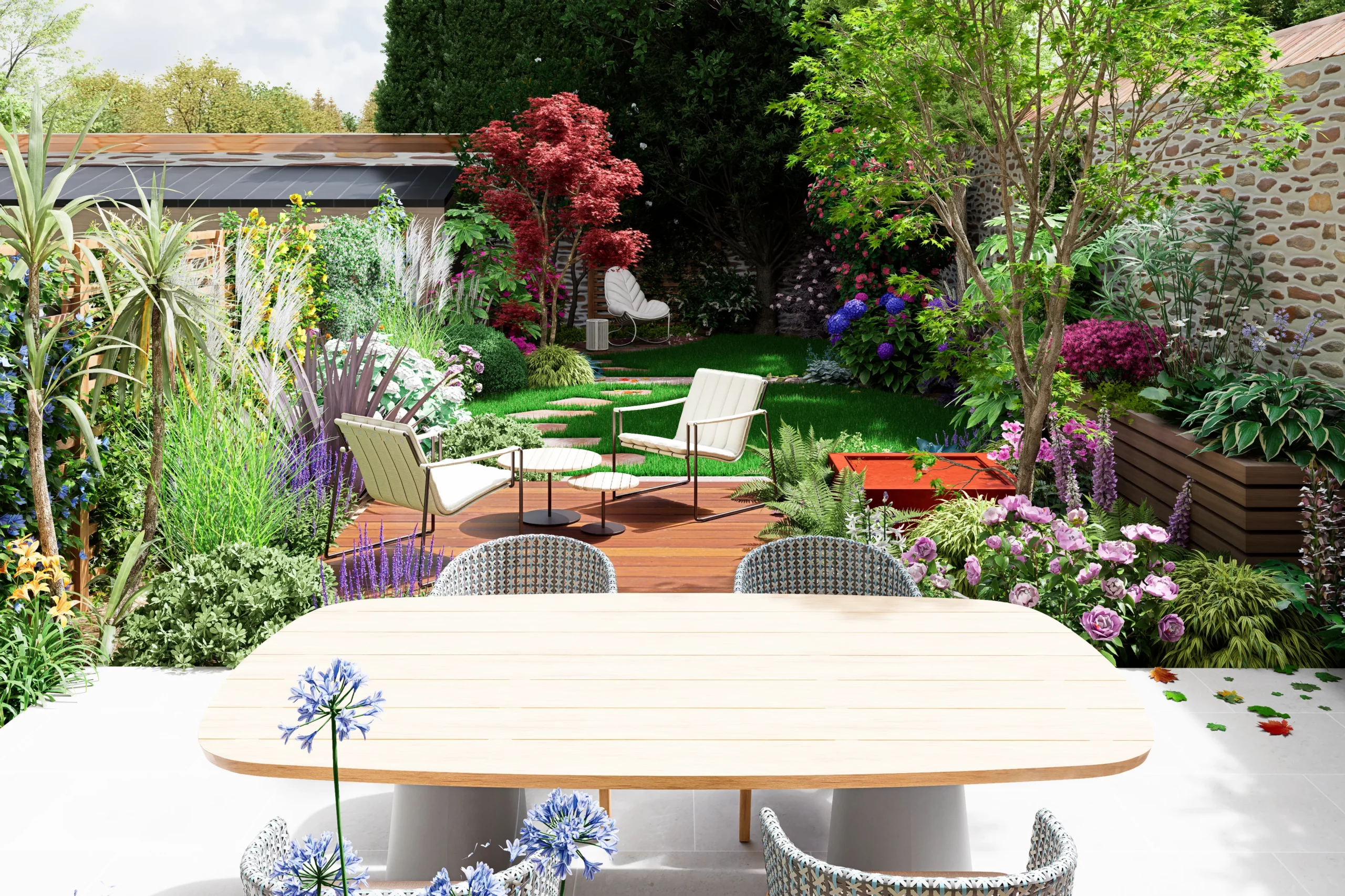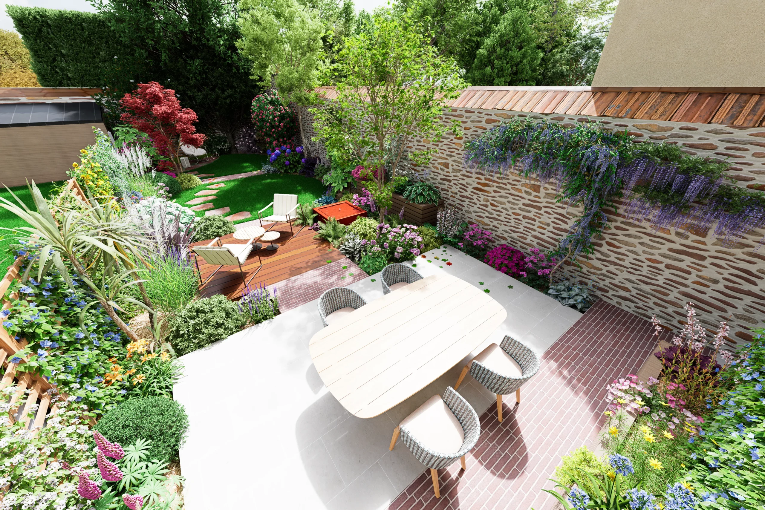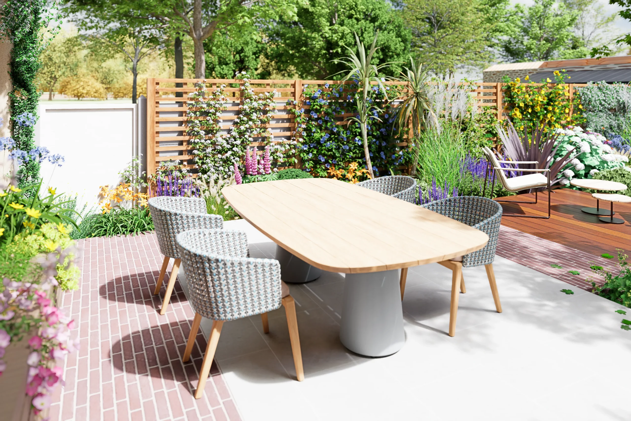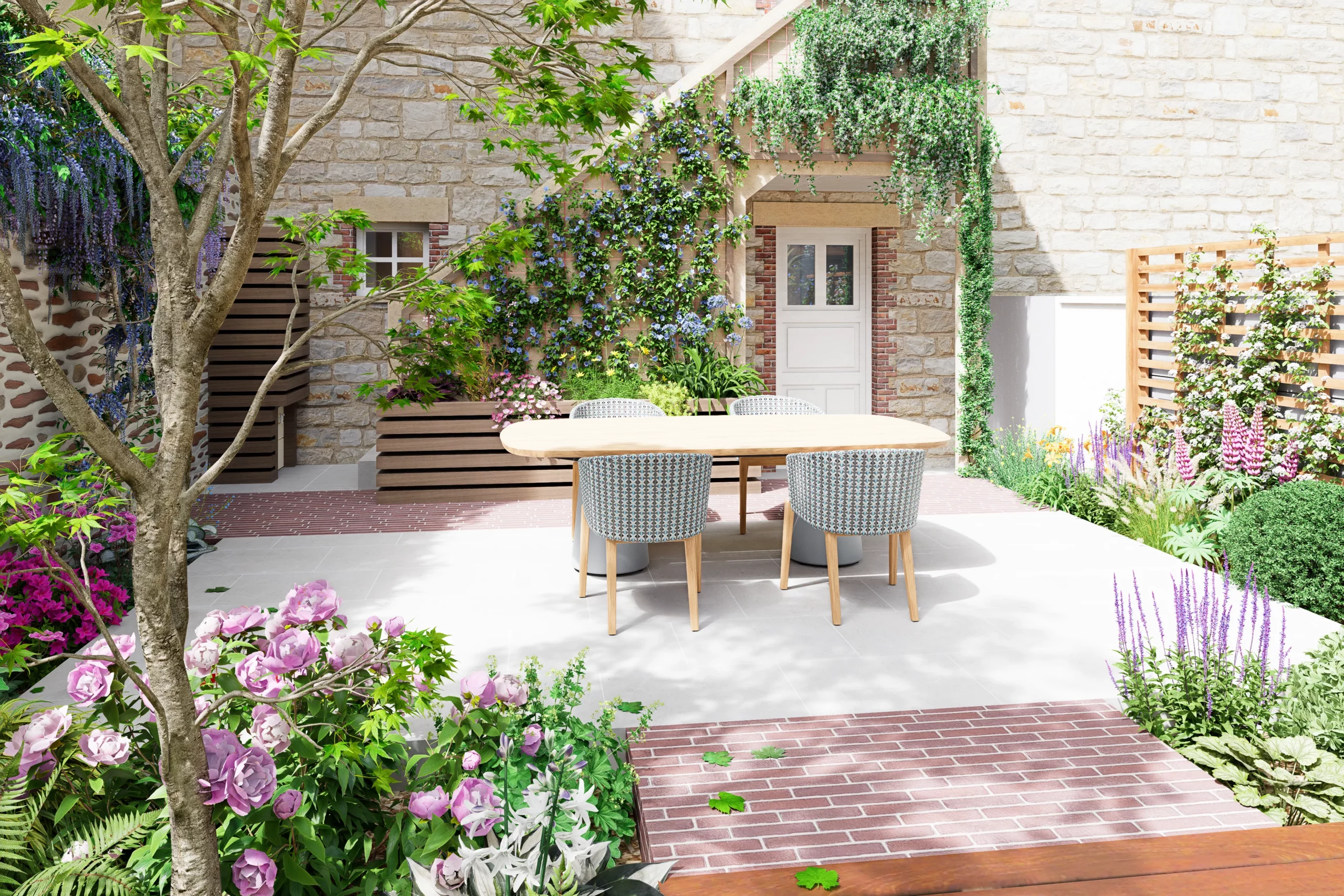 La composition s’organise par strates. La terrasse en dallage prolonge naturellement l’architecture de la maison, tandis qu’une terrasse en bois légèrement surélevée crée une transition plus douce vers le jardin. Un cheminement discret en pas japonais traverse le gazon et relie les différents espaces, comme une invitation légère à parcourir le lieu.