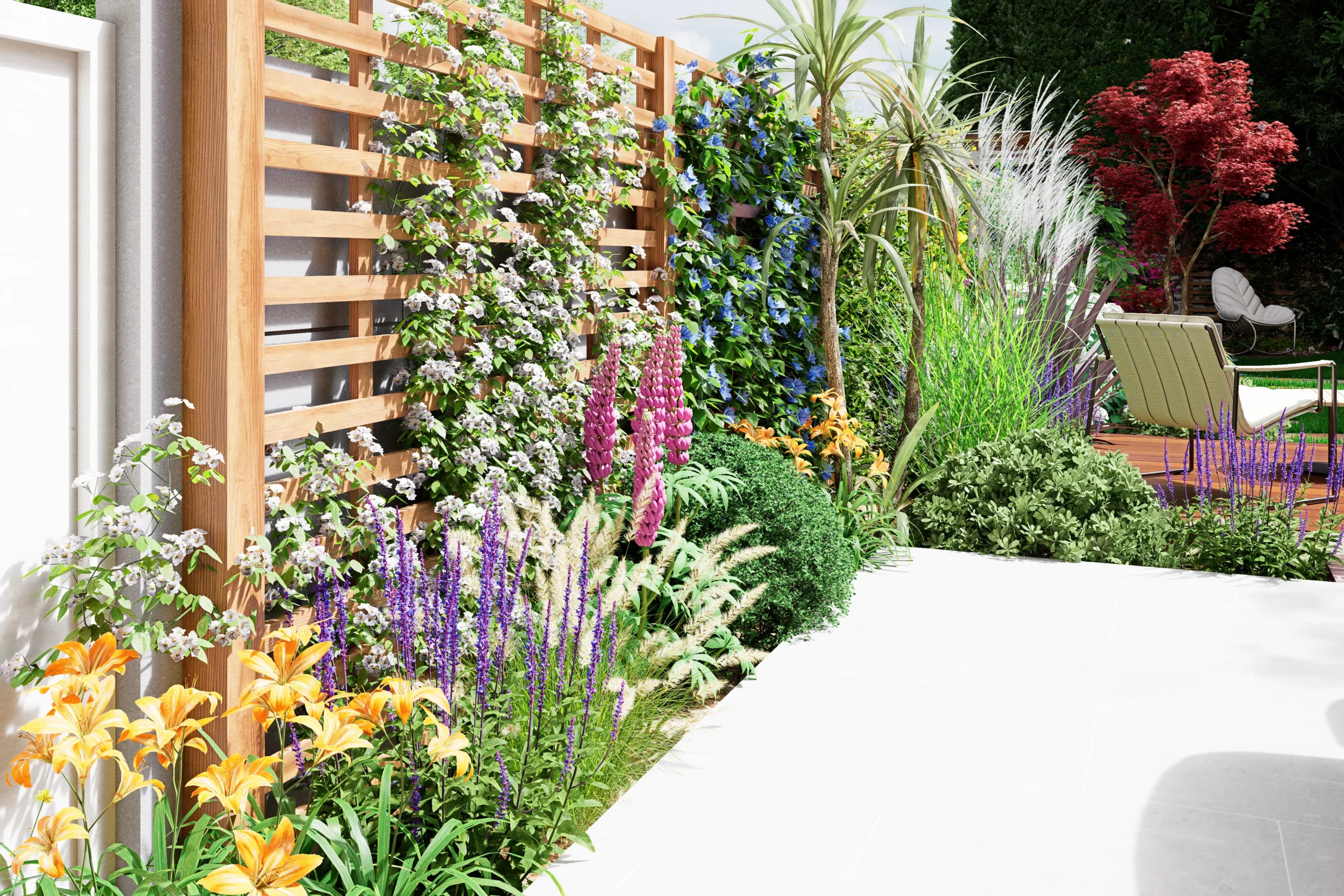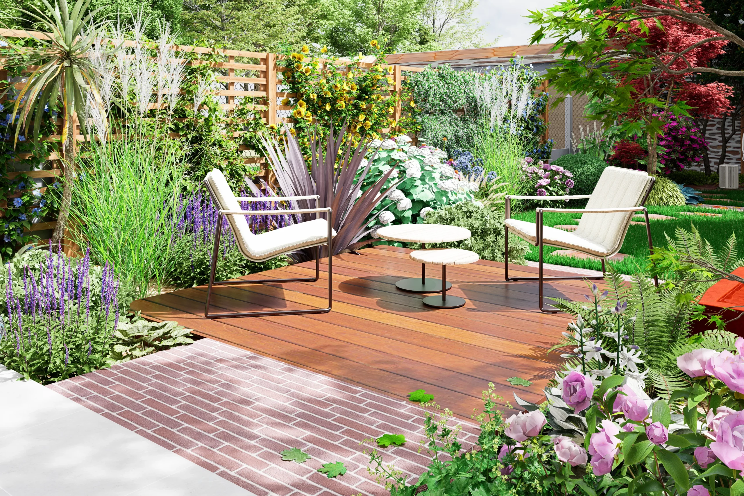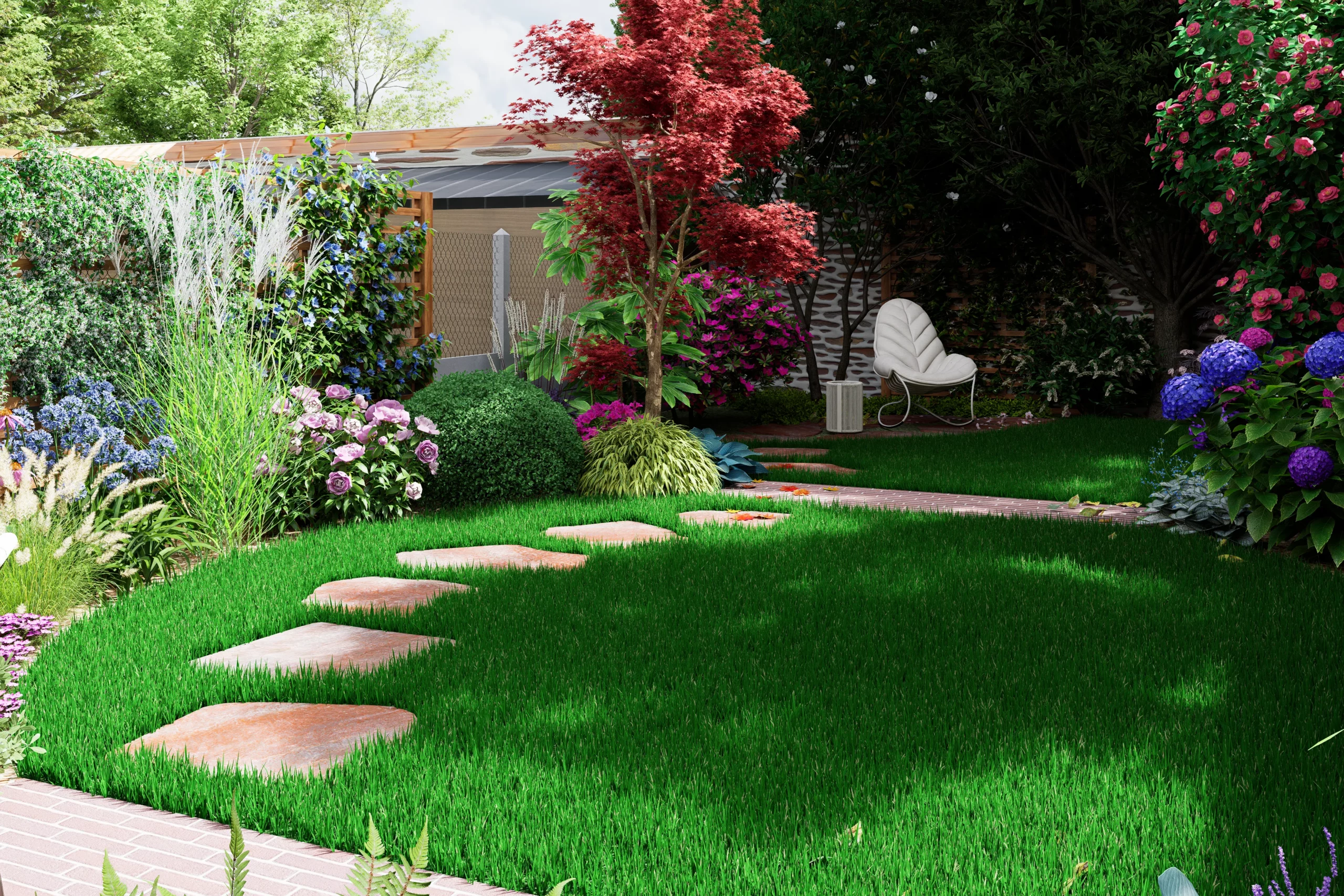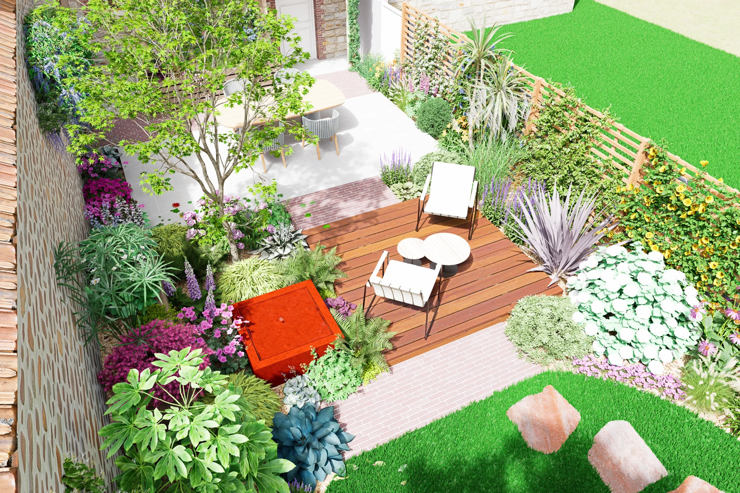 La composition s’organise par strates. La terrasse en dallage prolonge naturellement l’architecture de la maison, tandis qu’une terrasse en bois légèrement surélevée crée une transition plus douce vers le jardin. Un cheminement discret en pas japonais traverse le gazon et relie les différents espaces, comme une invitation légère à parcourir le lieu.