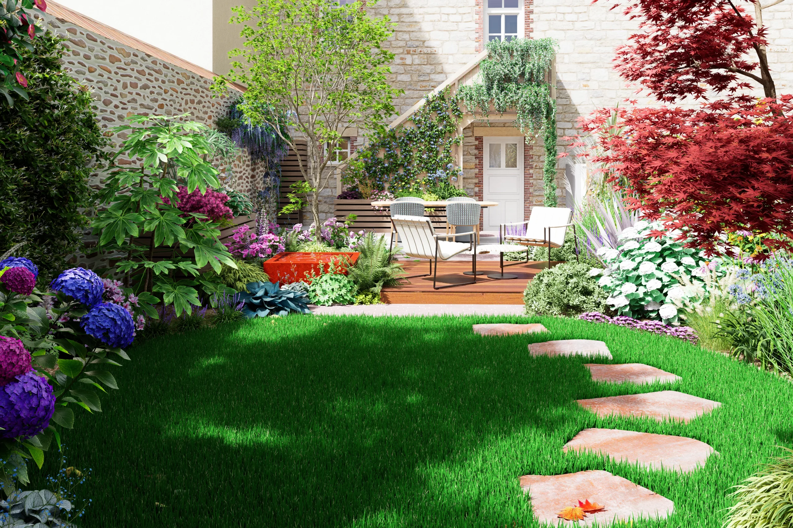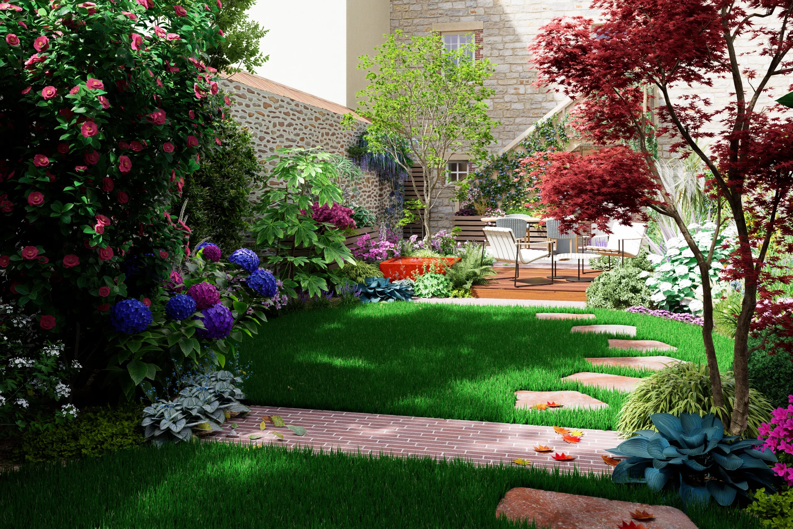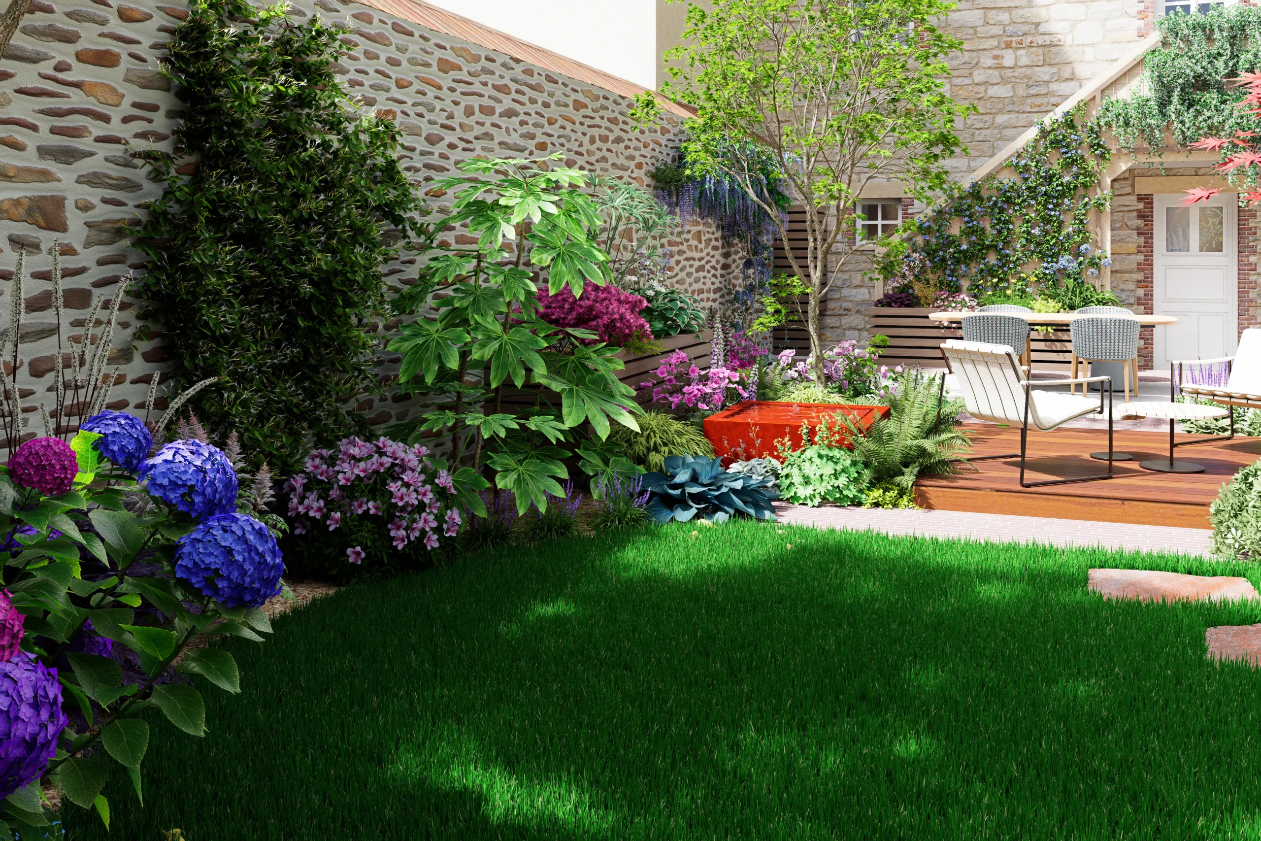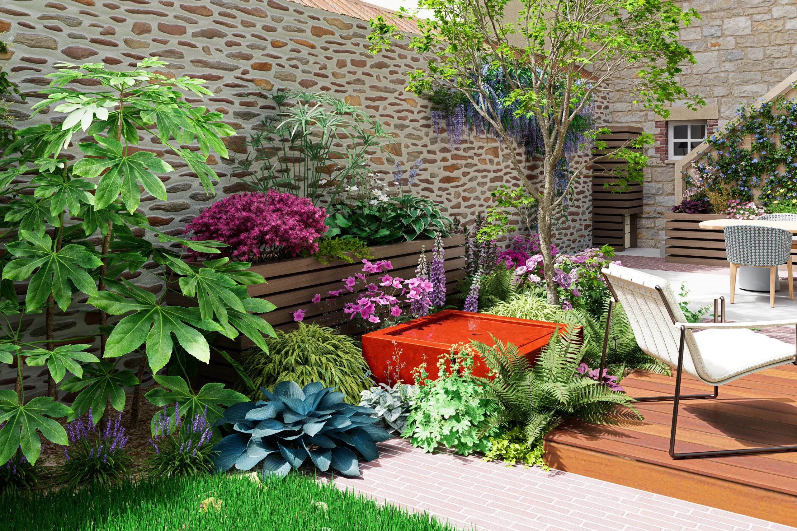 Au cœur de la scène, un érable japonais élancé déploie son feuillage léger devant le grand mur de pierre. À son pied, une palette de mi-ombre, fougères, hostas, hakonechloas et anémones, compose une végétation dense et fraîche. Une petite table d’eau en acier corten apporte un clapotis discret, dont la patine chaleureuse fait écho aux teintes du schiste et des briques de la maison.