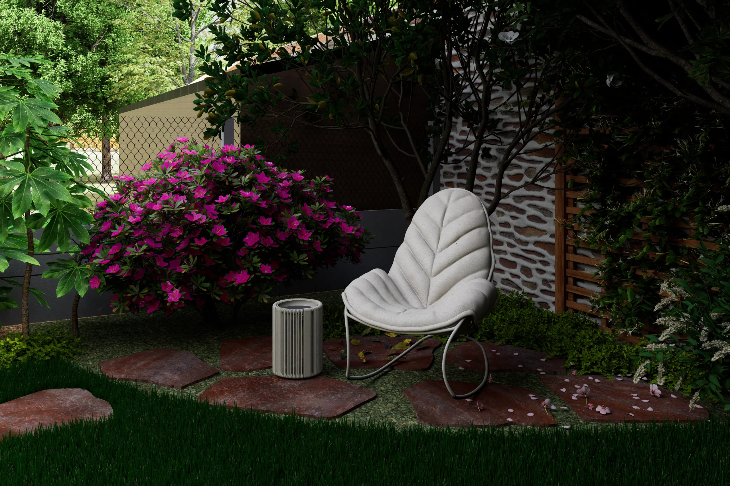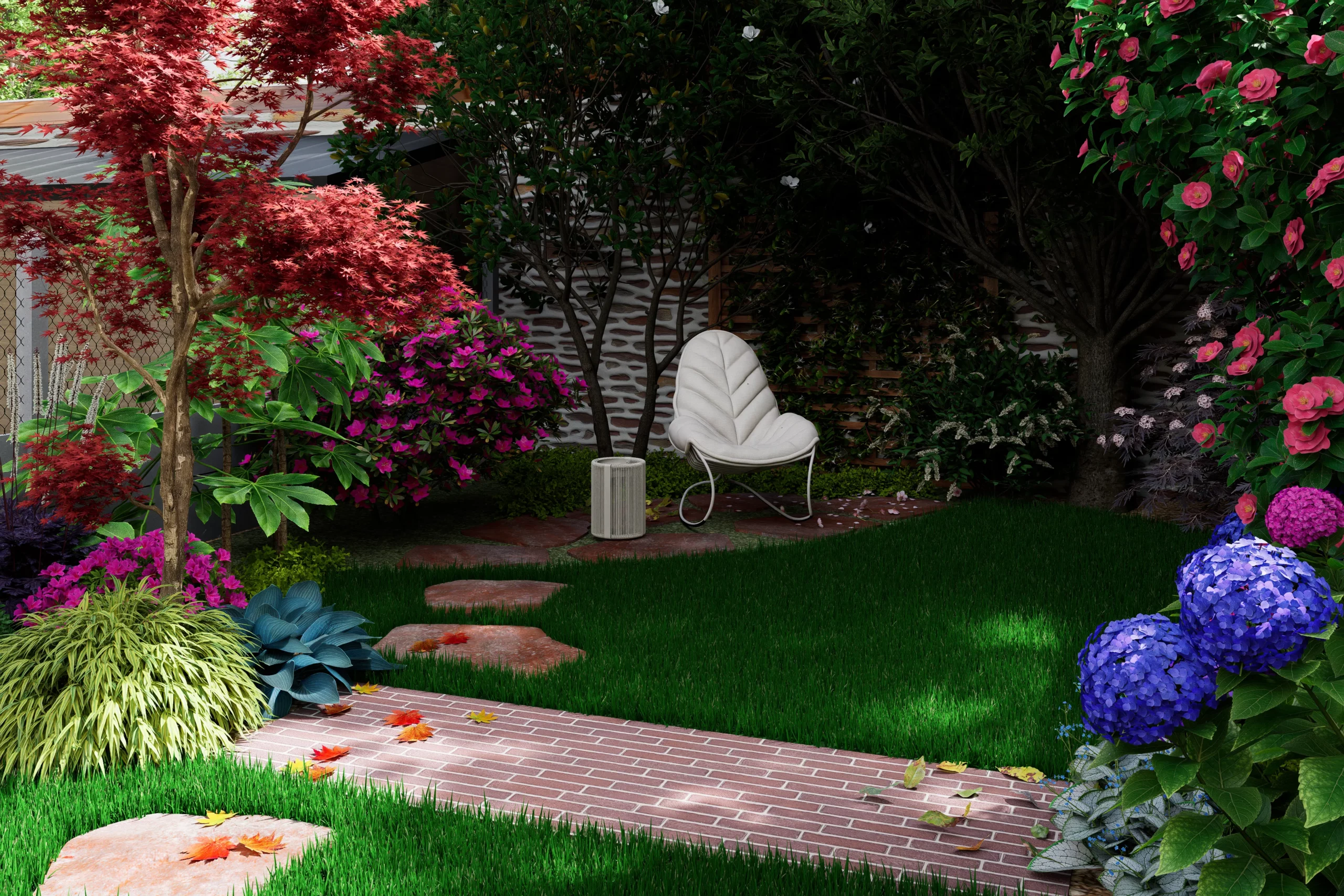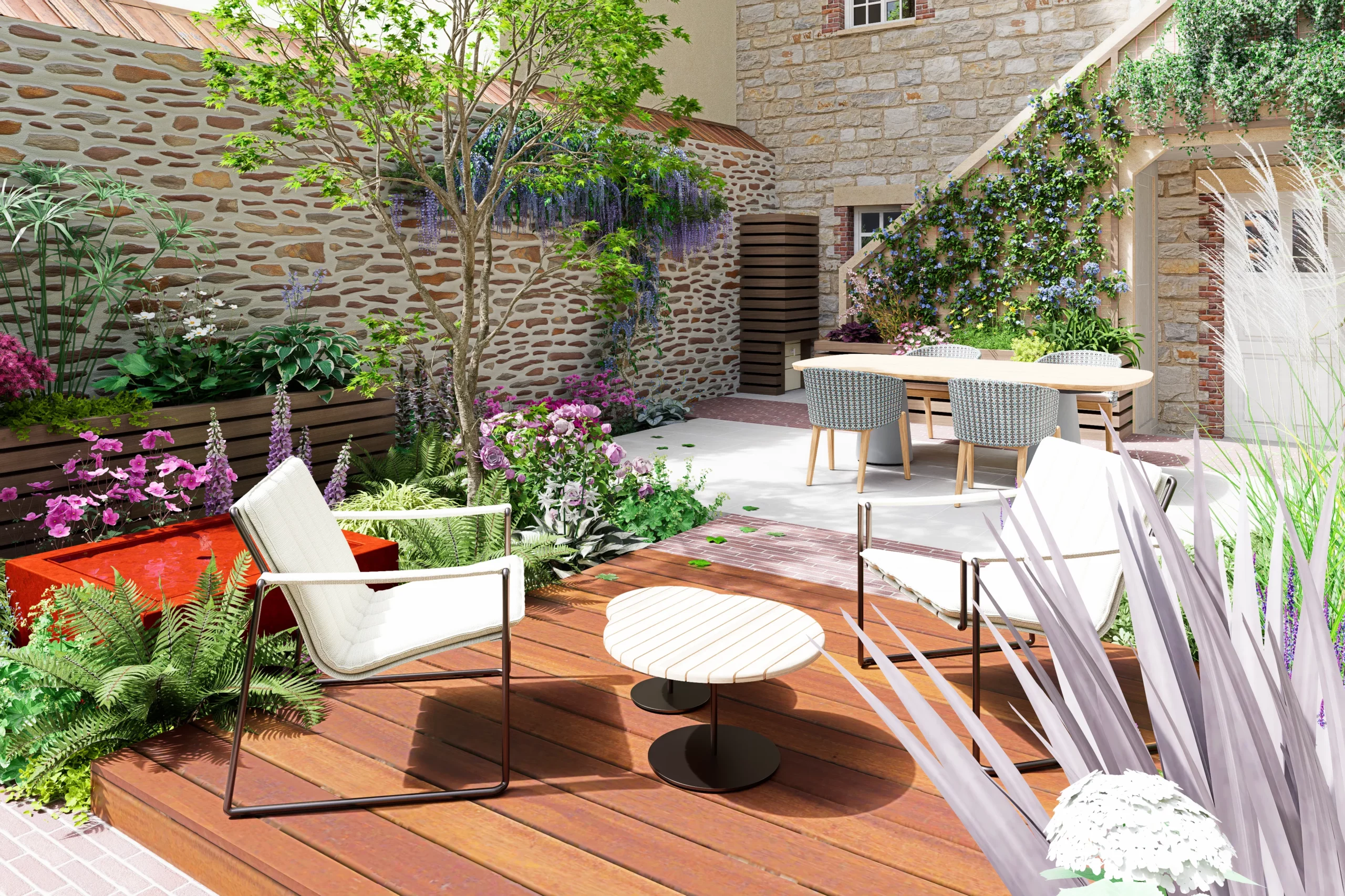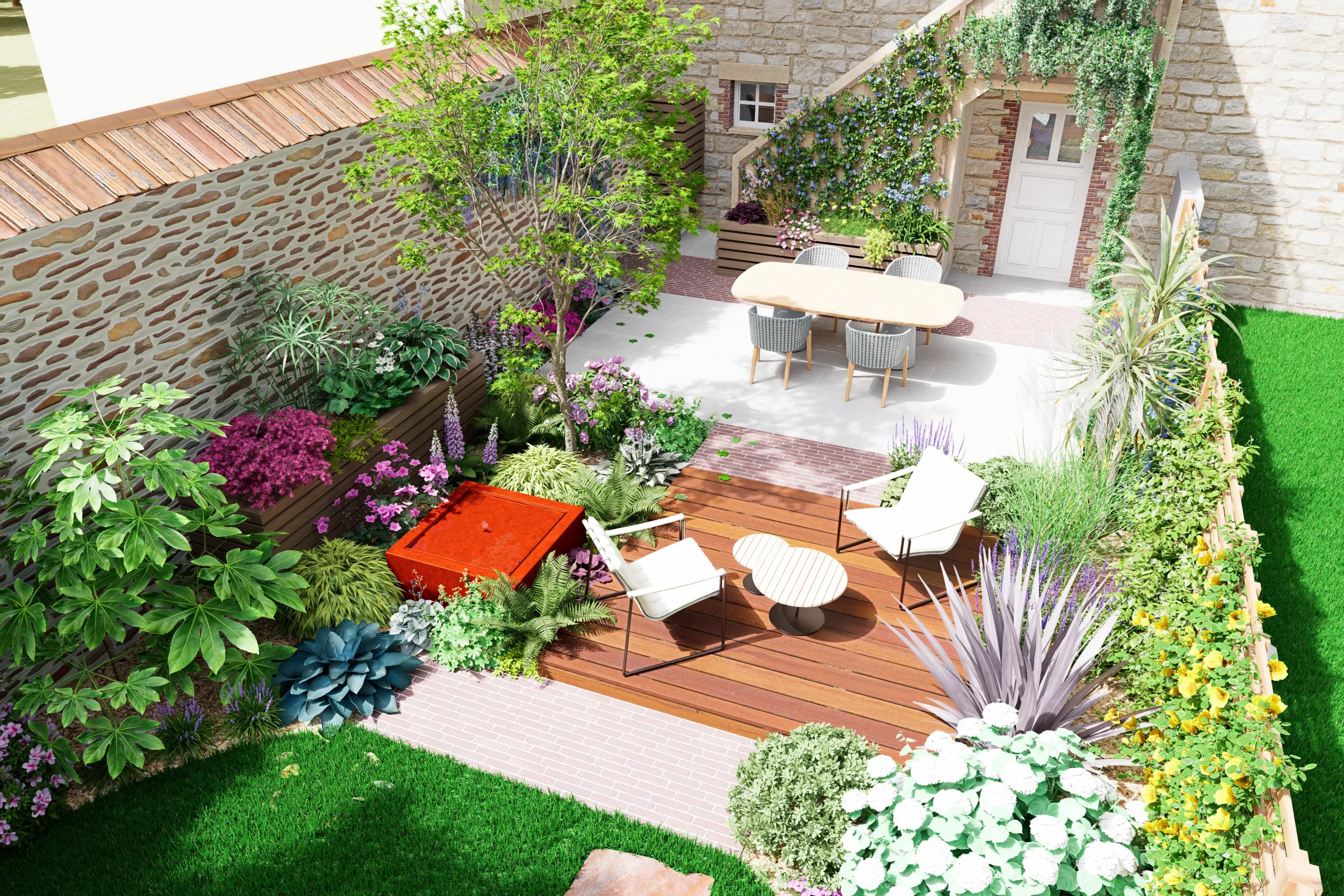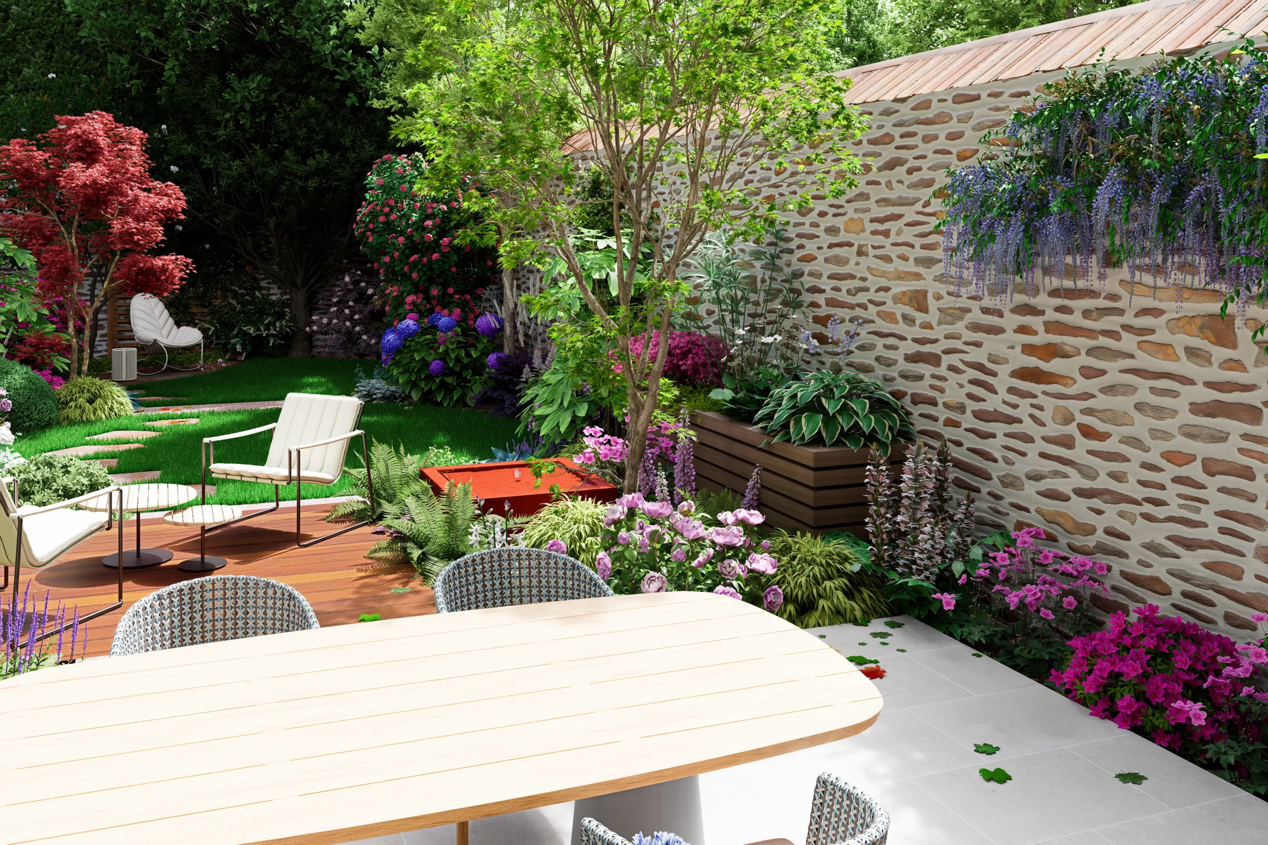 Au cœur de la scène, un érable japonais élancé déploie son feuillage léger devant le grand mur de pierre. À son pied, une palette de mi-ombre, fougères, hostas, hakonechloas et anémones, compose une végétation dense et fraîche. Une petite table d’eau en acier corten apporte un clapotis discret, dont la patine chaleureuse fait écho aux teintes du schiste et des briques de la maison.