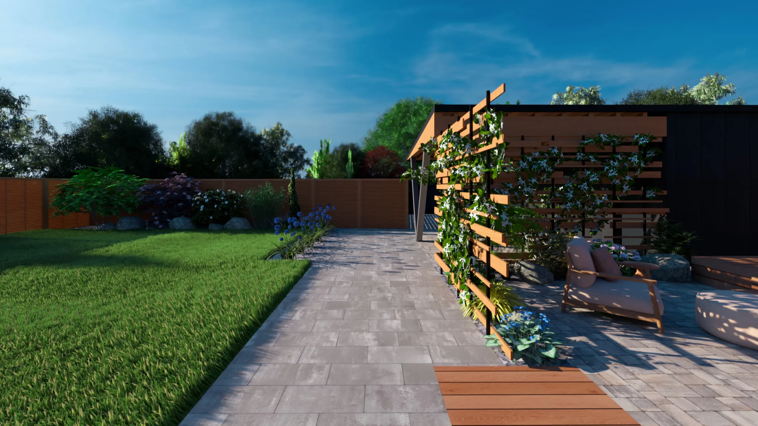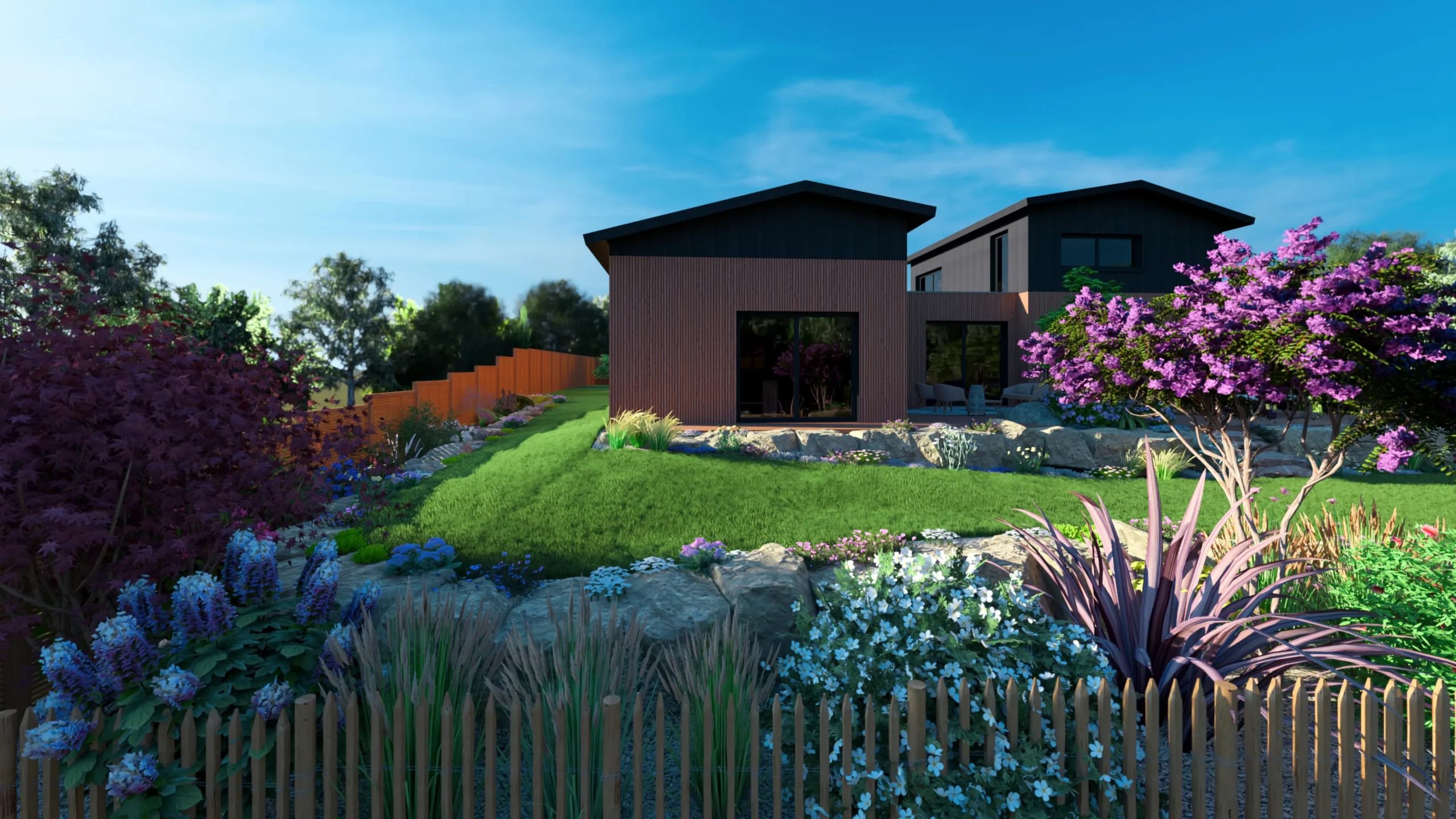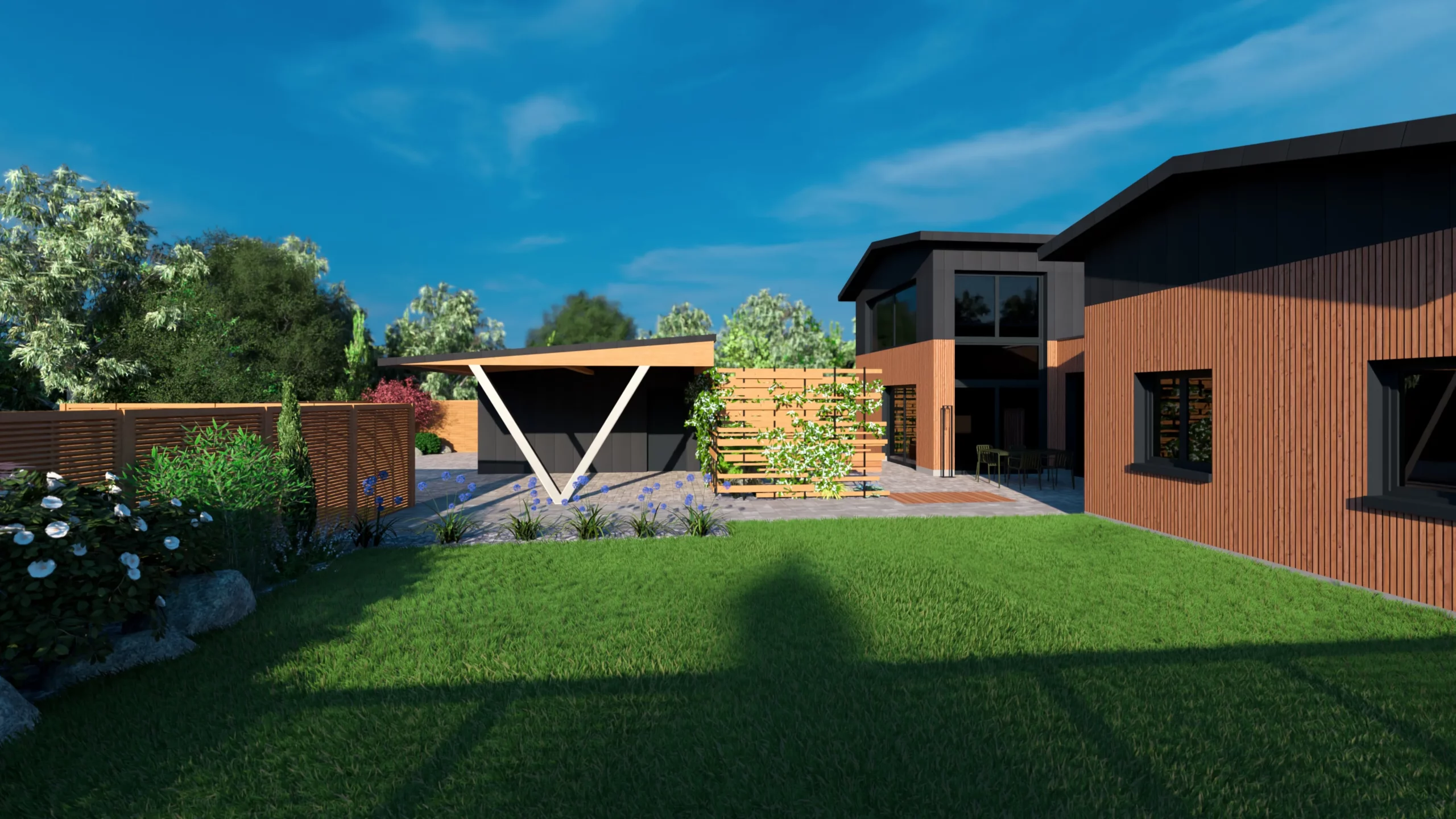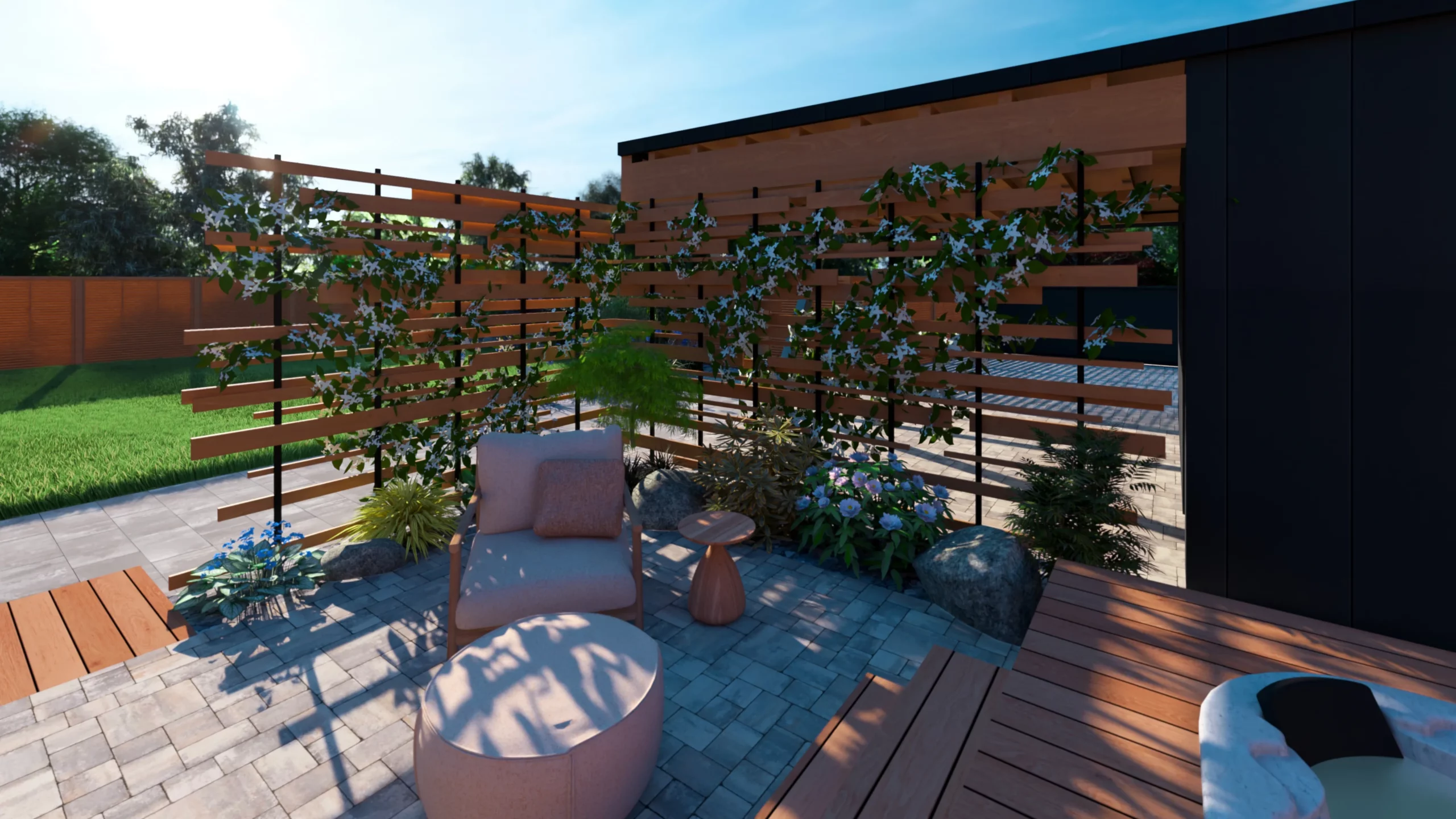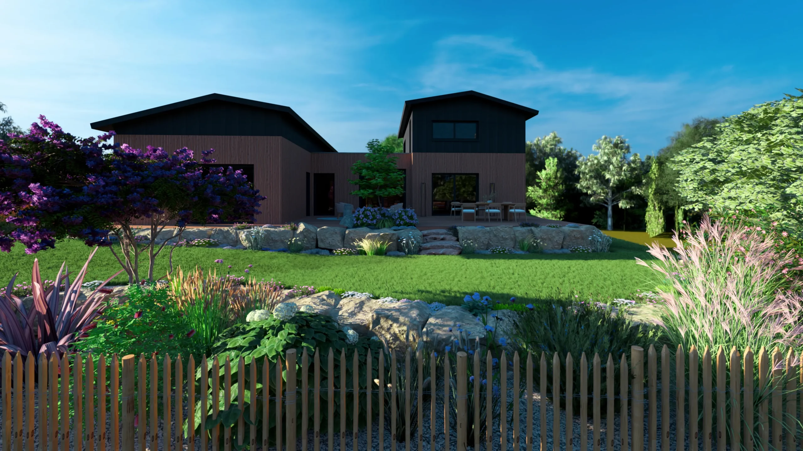 Ce jardin incarne cette démarche : un jardin contemporain, fonctionnel et équilibré, où la conception et la visualisation 3D permettent de donner une direction claire au projet.