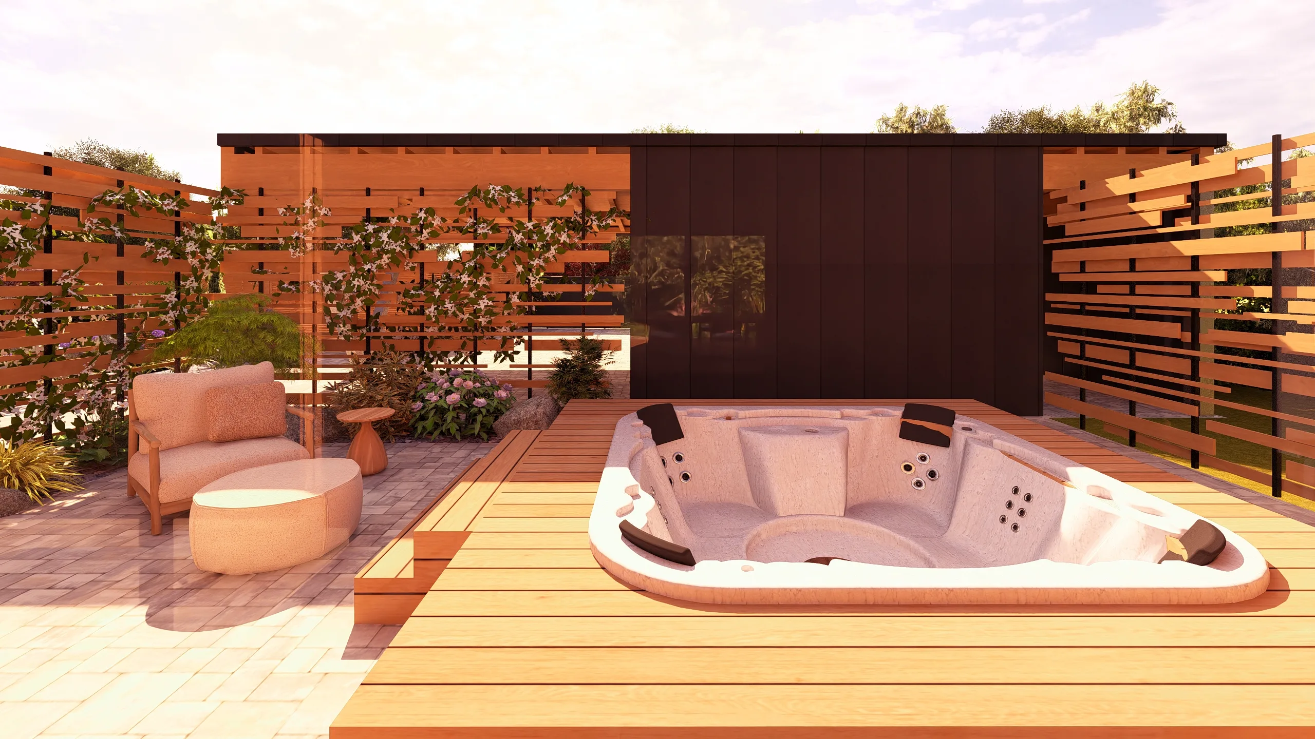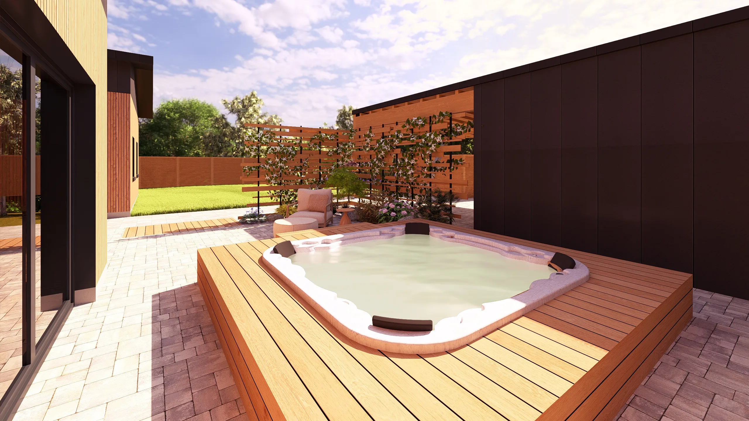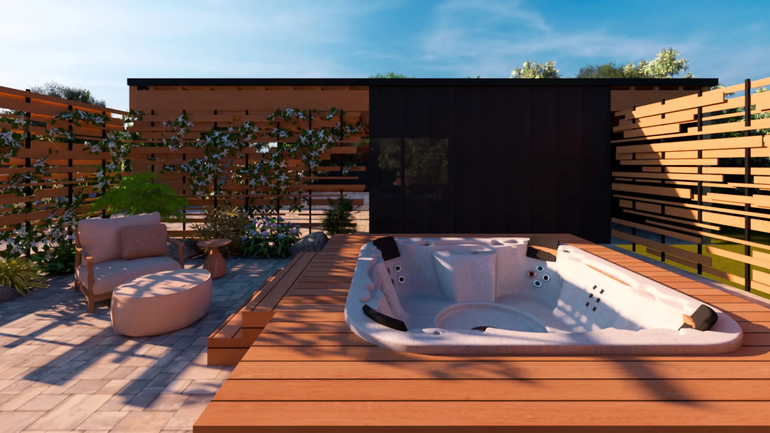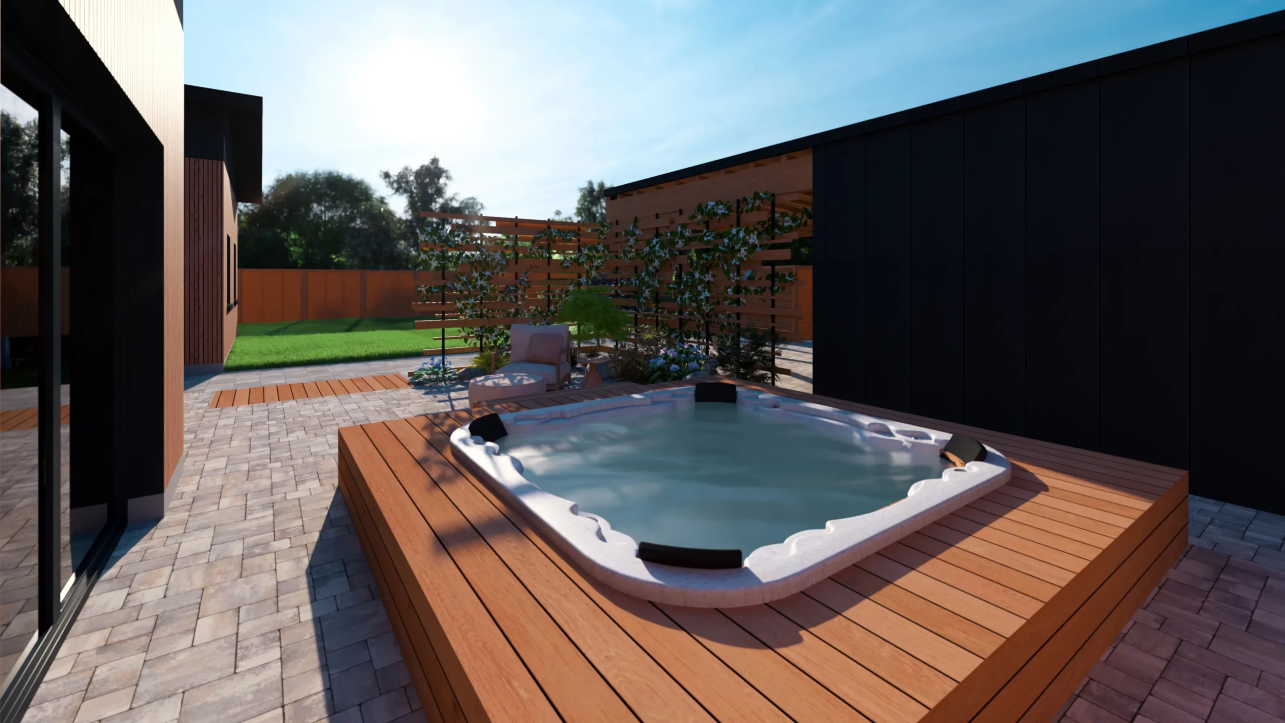 Un espace spécifique a été prévu pour l’intégration d’un spa semi-enterré, pensé comme un lieu de détente à part entière, facilement accessible et intégré dans la composition du jardin.