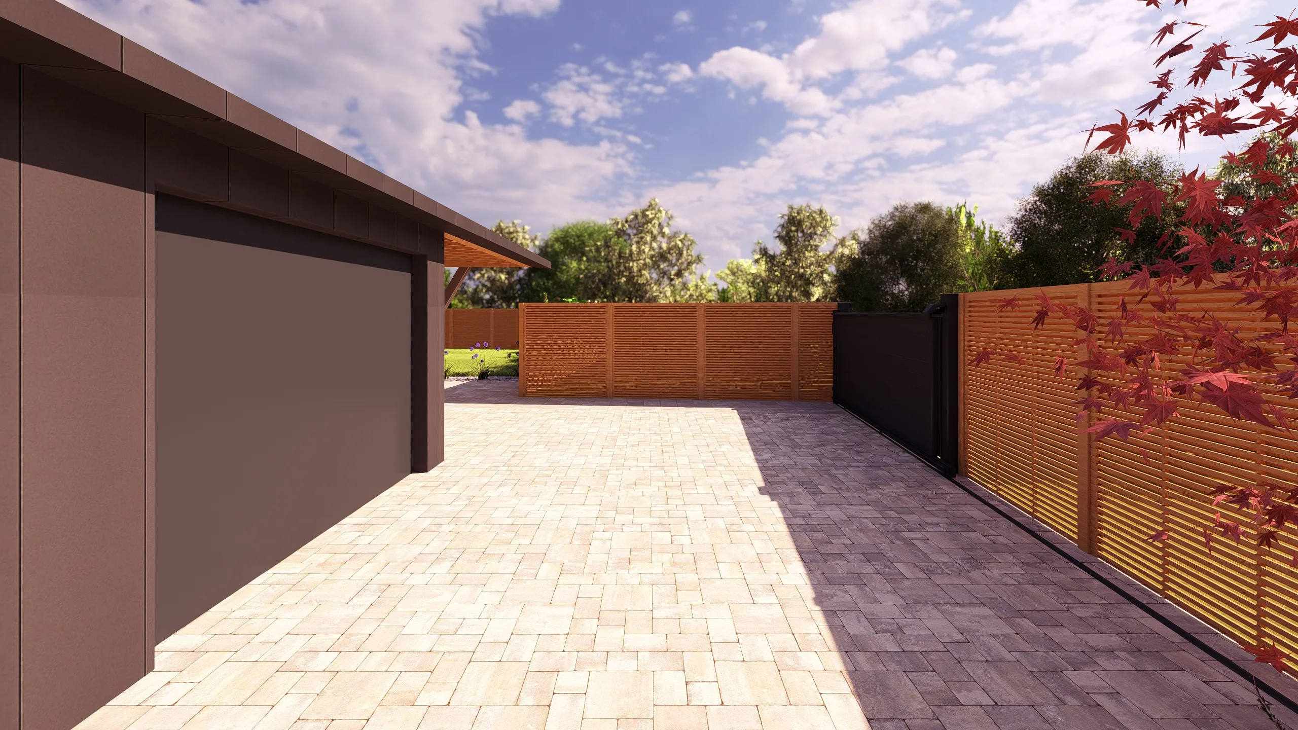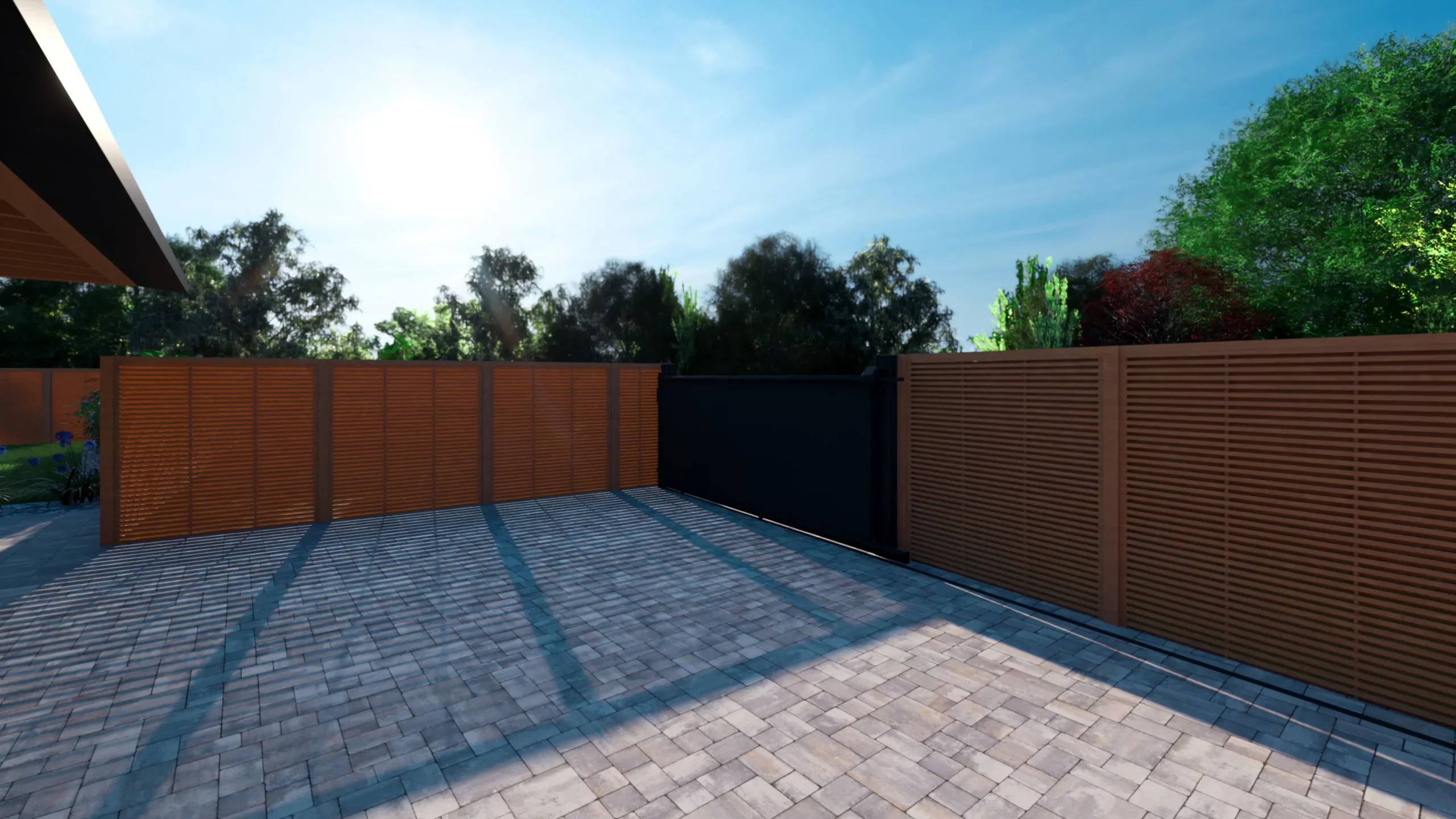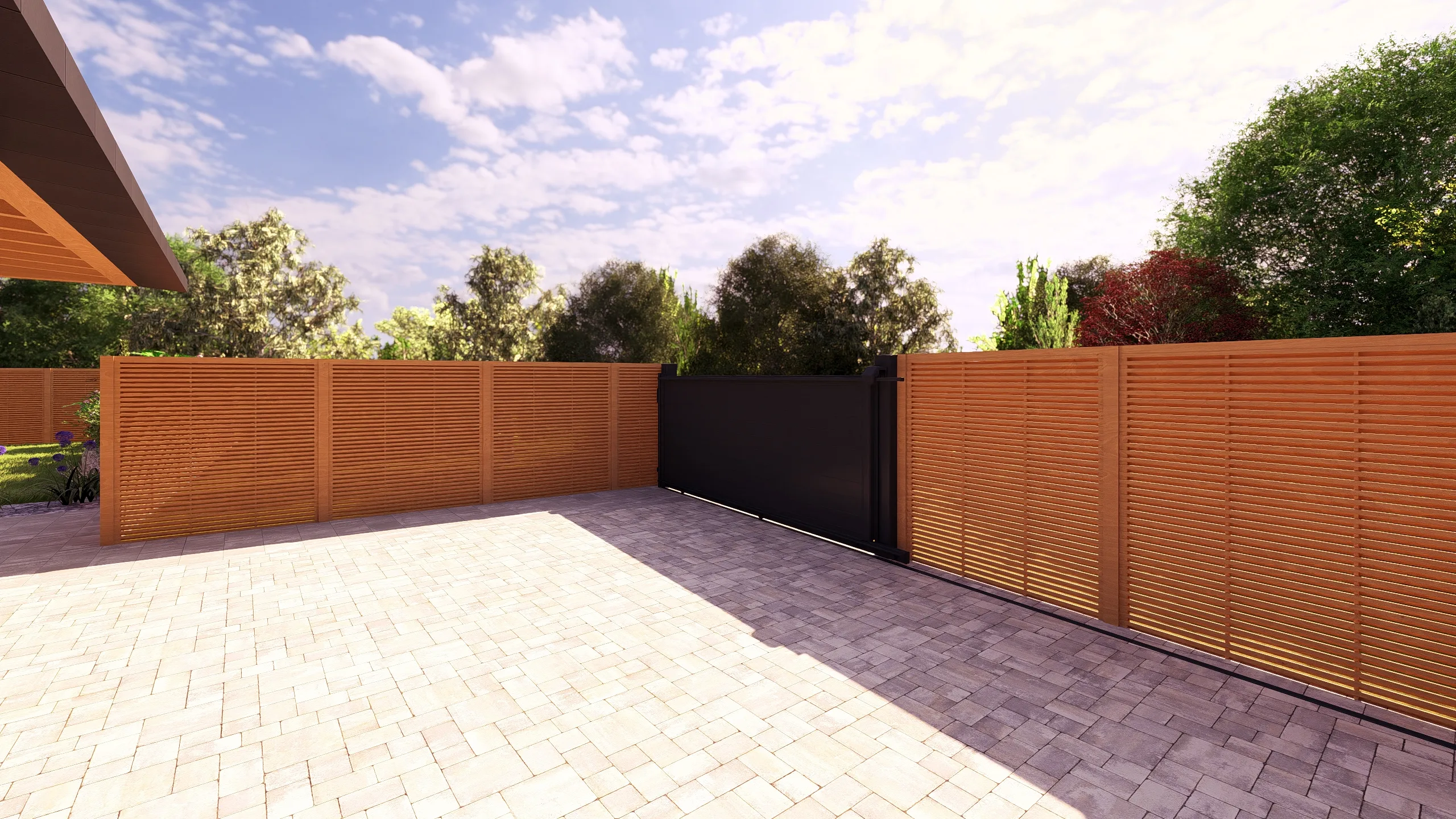 Le portail coulissant, les revêtements en pavage et dallage, ainsi que les clôtures bois structurent l’entrée et organisent les circulations. Les matériaux minéraux apportent une base lisible, tandis que le bois vient réchauffer l’ensemble et créer une continuité avec l’habitat.