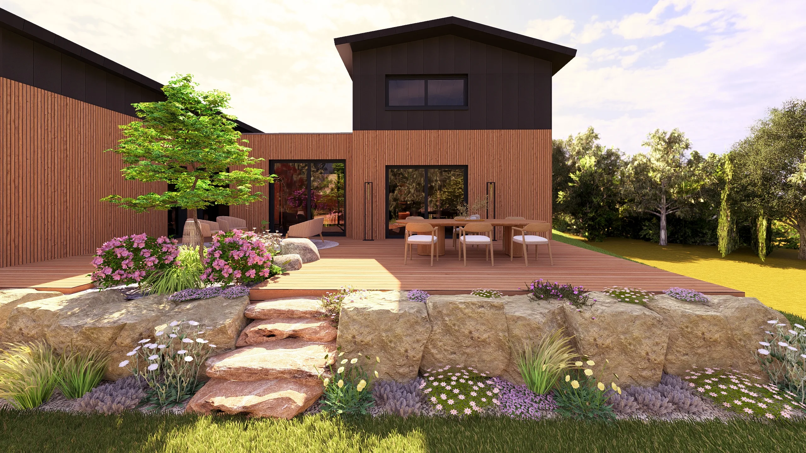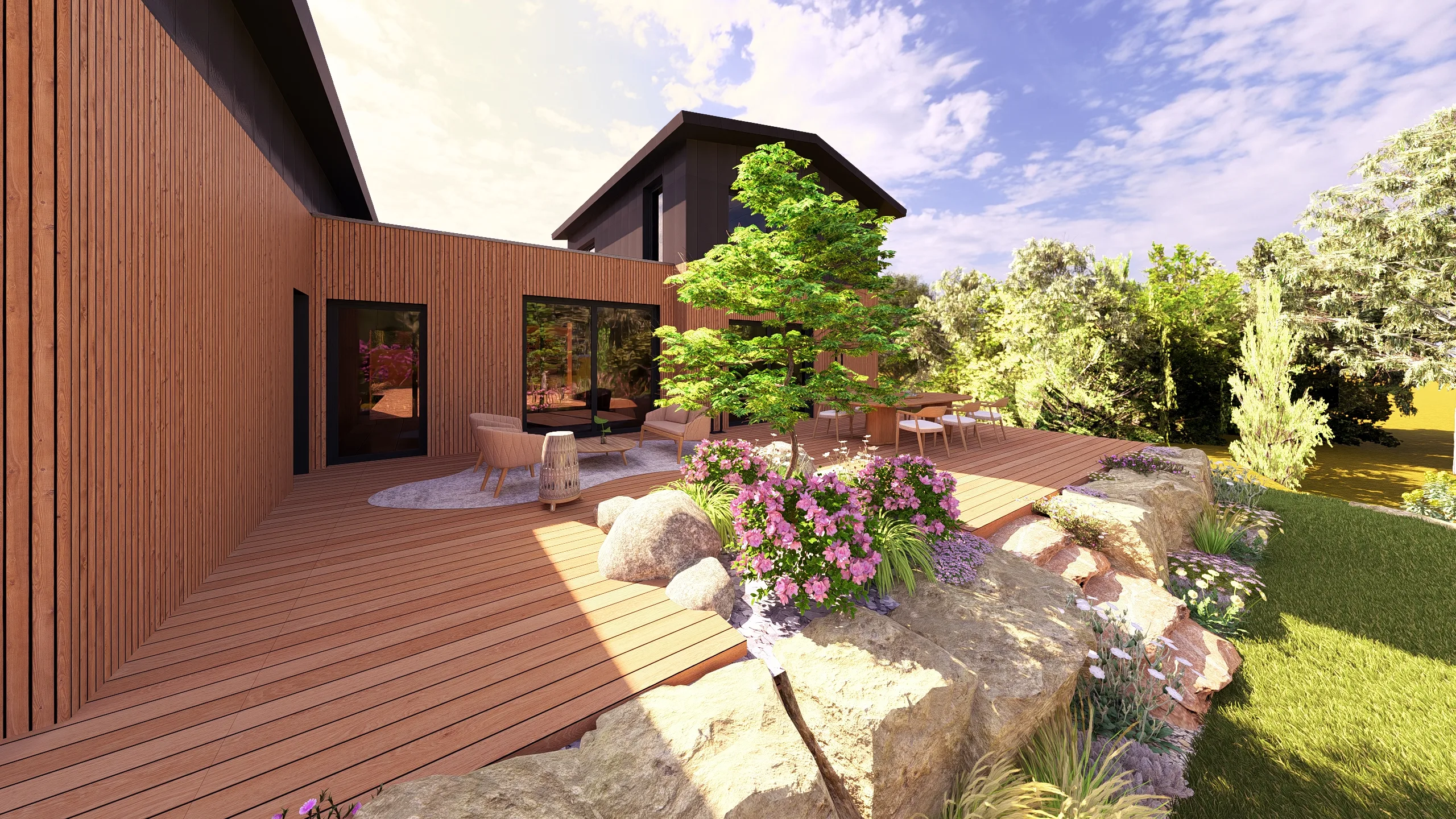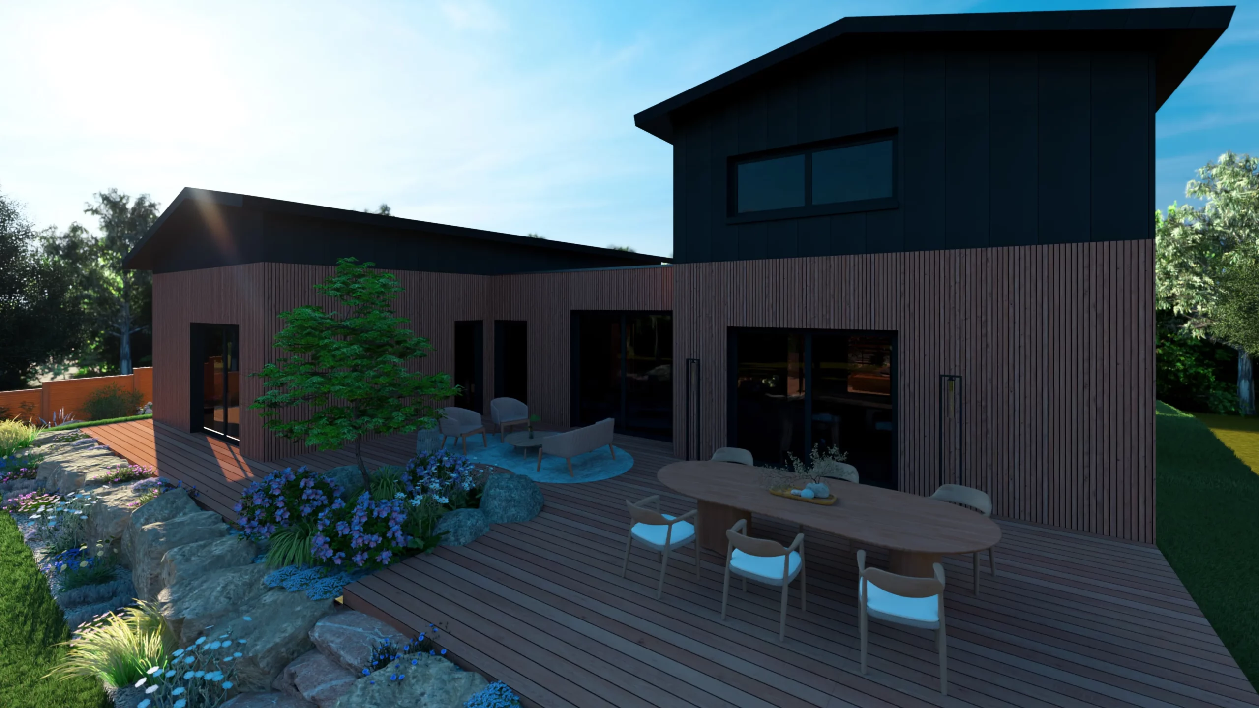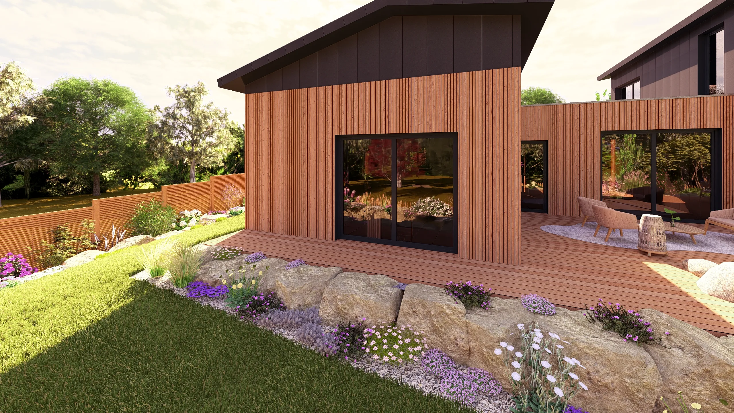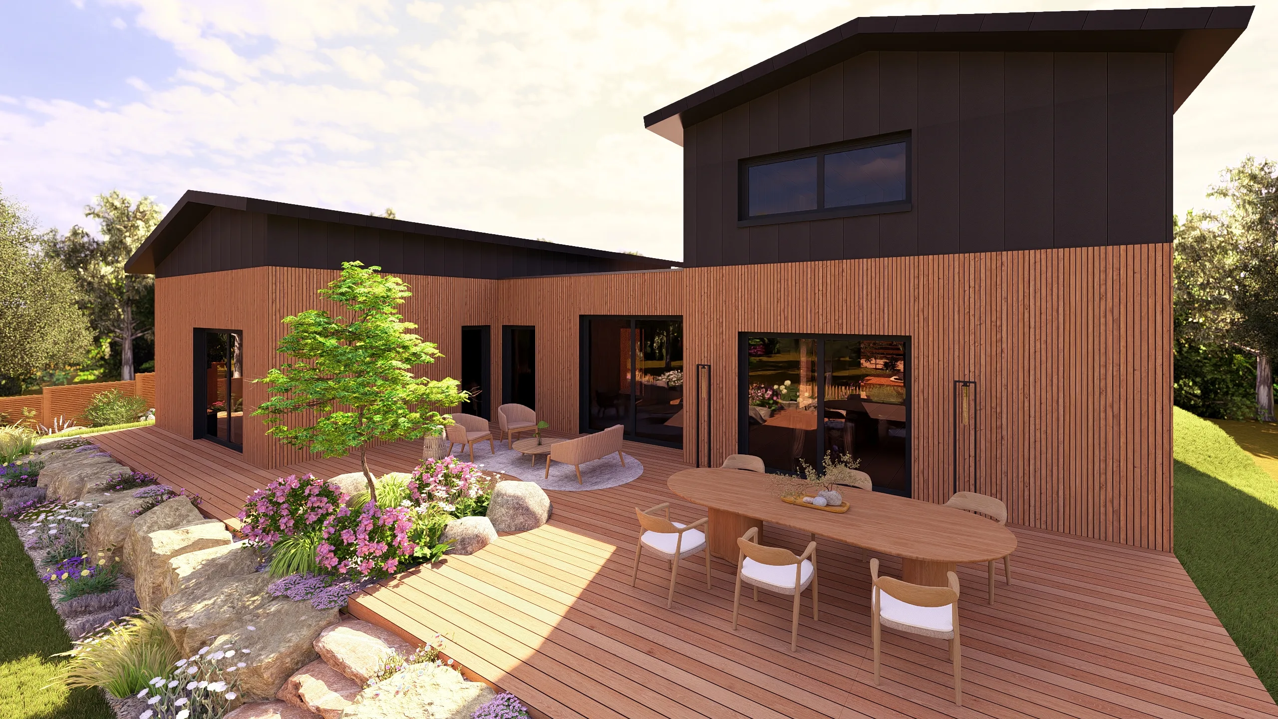 La terrasse bois, positionnée en lien direct avec la maison, devient un véritable espace de vie extérieur.