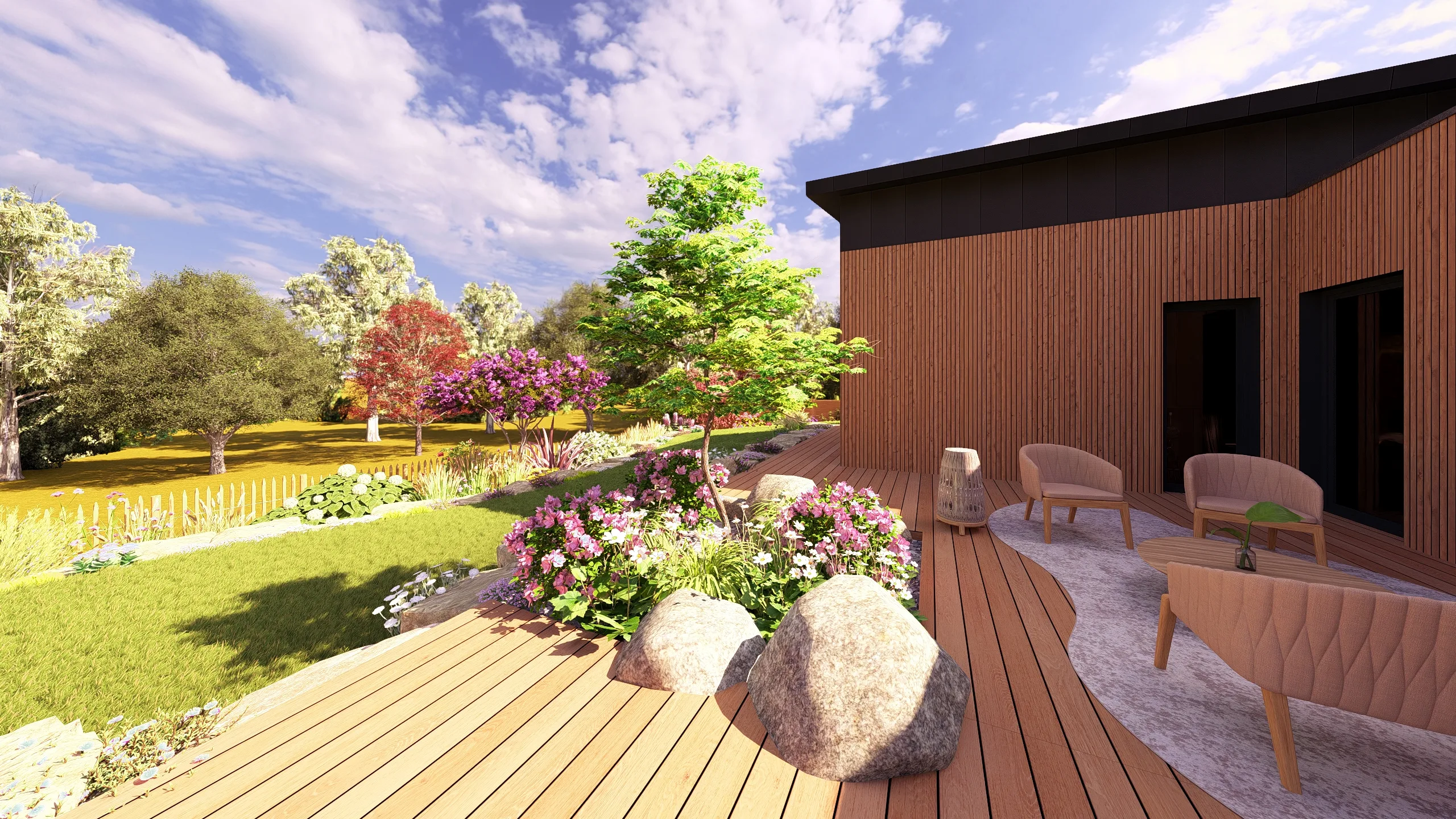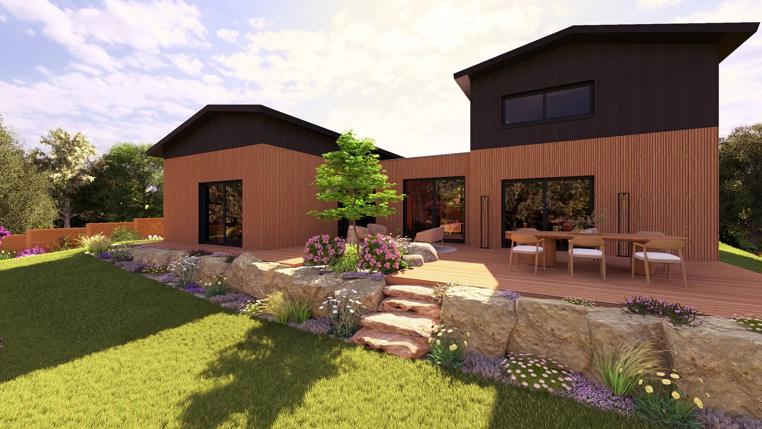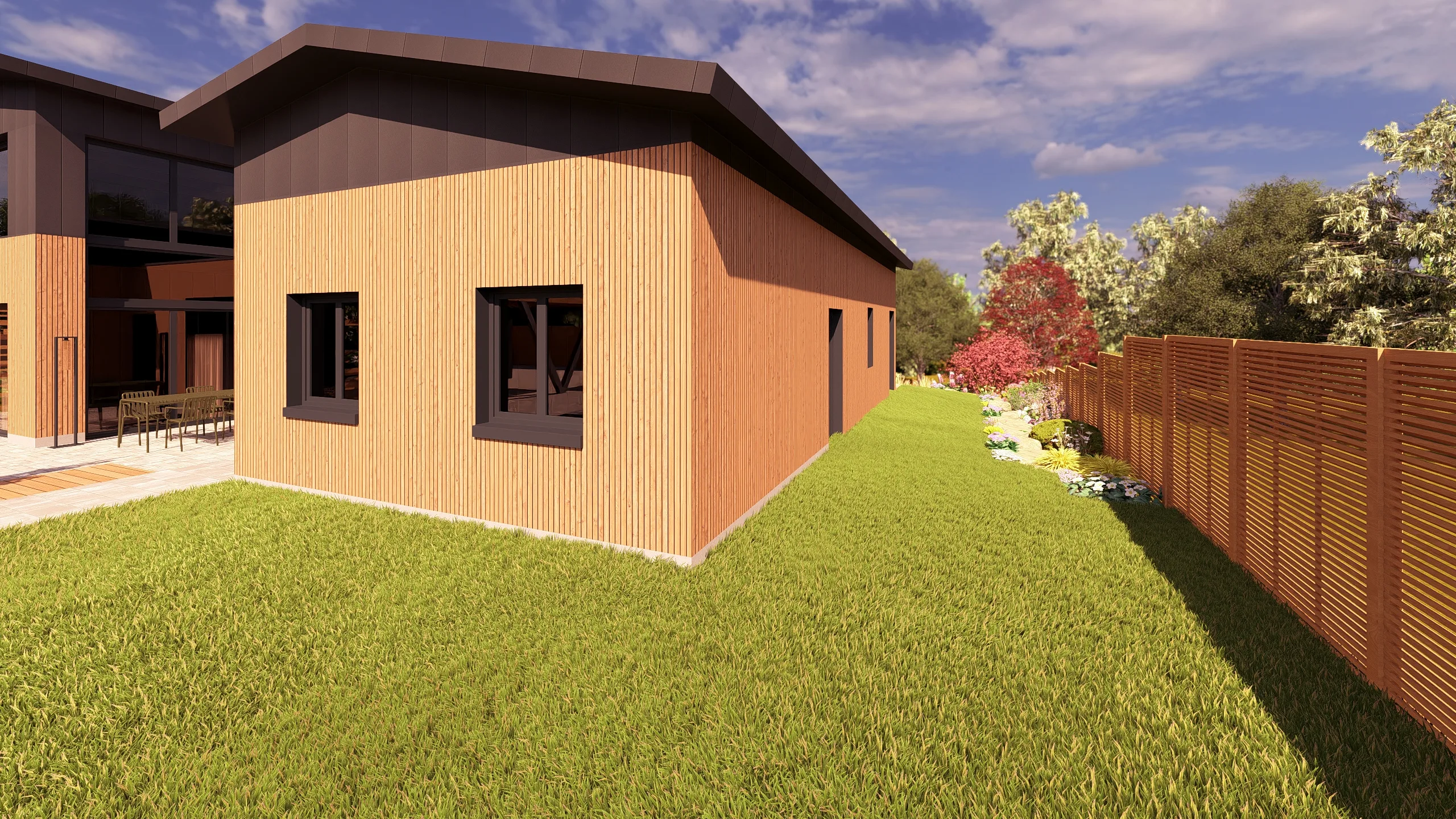 À l’arrière, le jardin prolonge cette logique d’aménagement paysager avec plus de souplesse.