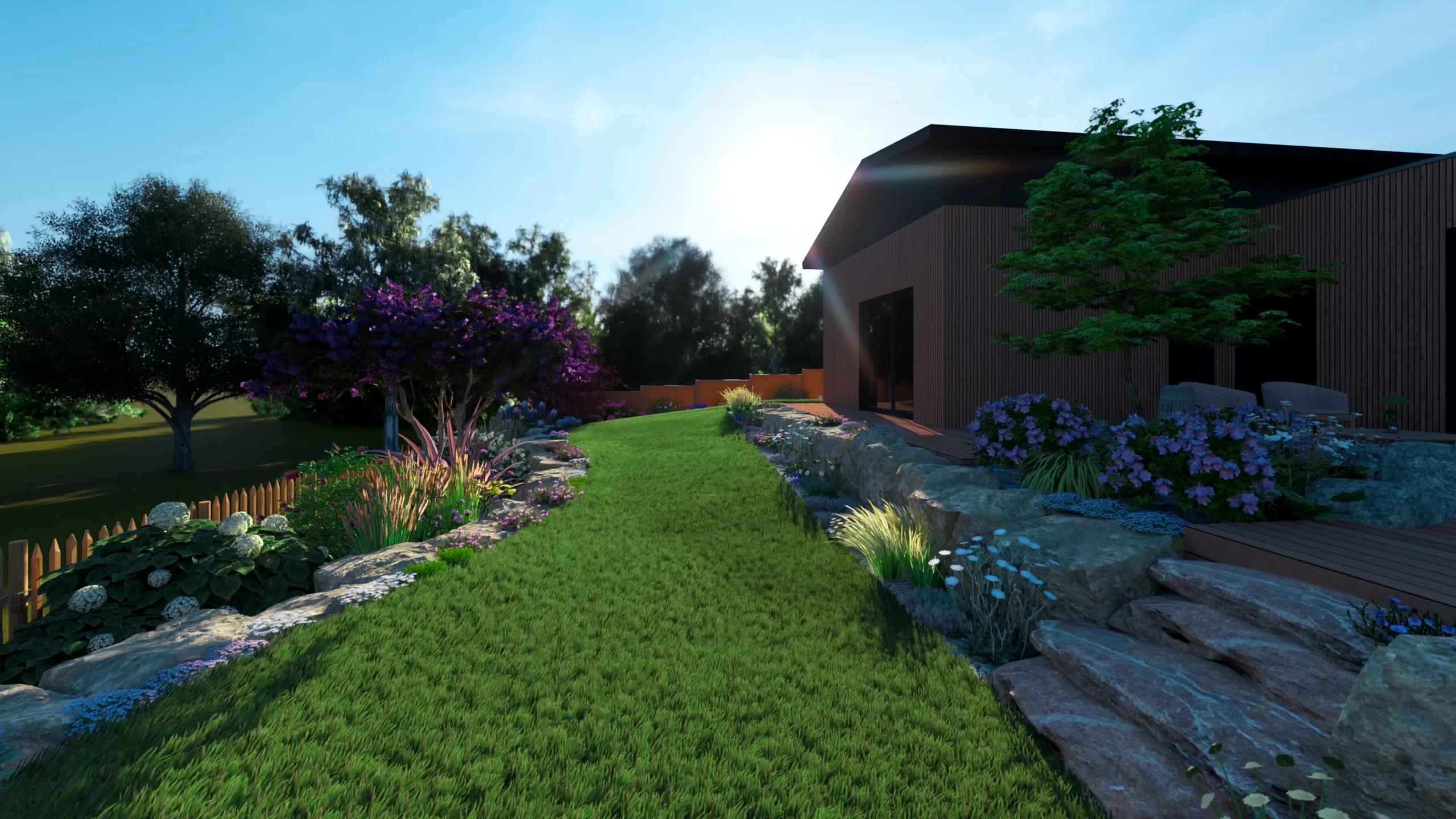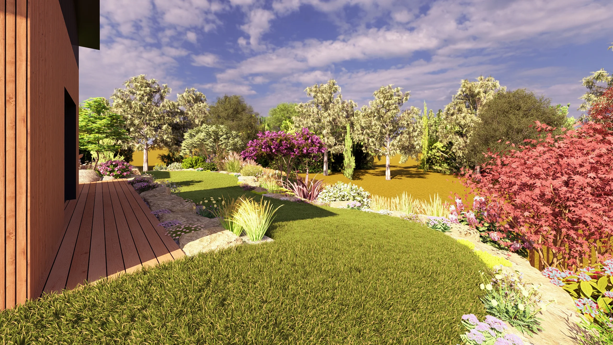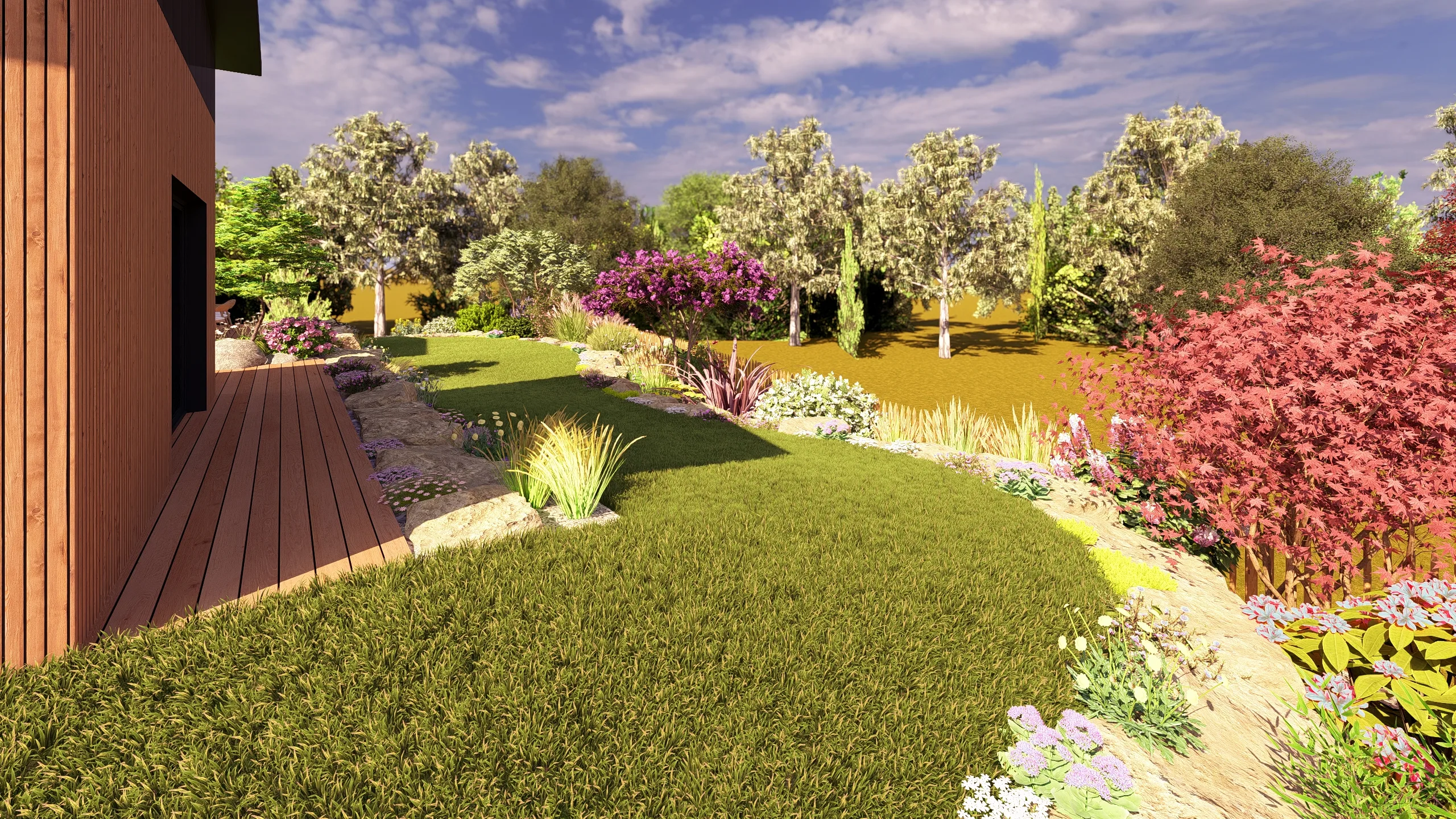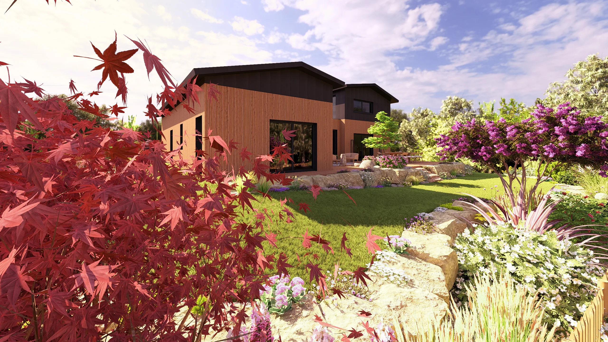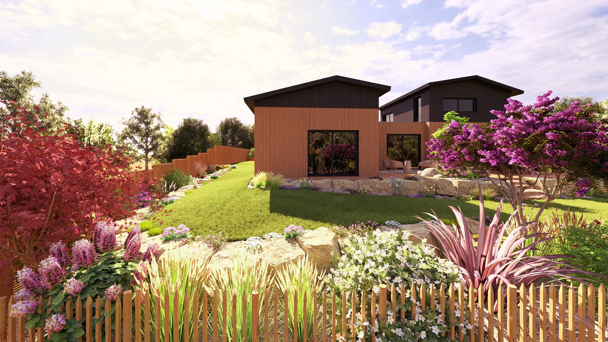 À Betton, au nord de Rennes, ce projet d’aménagement de jardin s’inscrit dans une démarche complète de conception de jardin 3D, réalisée en collaboration avec MGE Création.